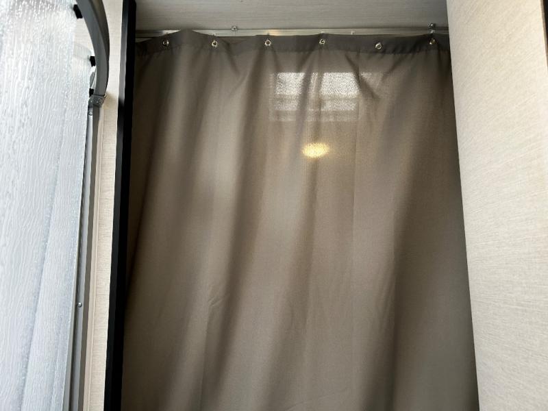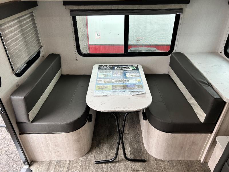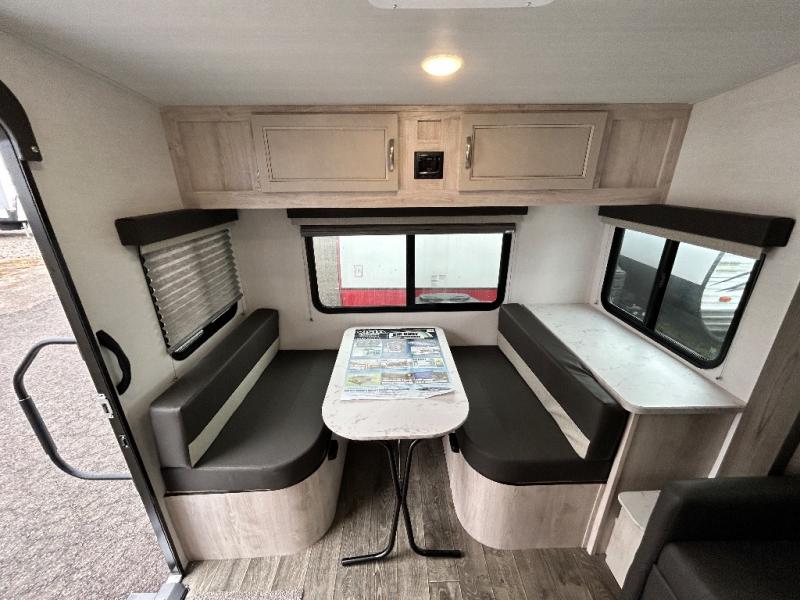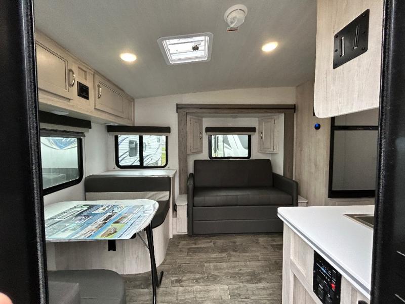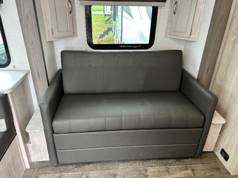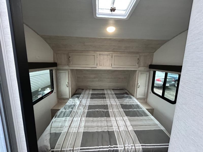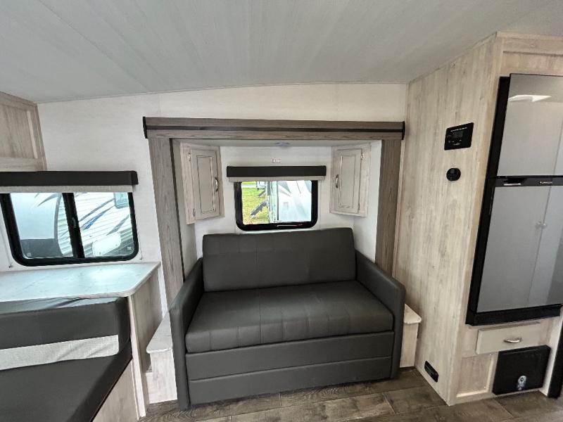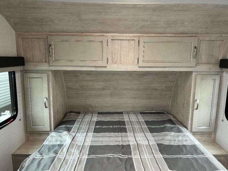 Book your favorite campsite and head to a great weekend getaway with your spouse and a guest or two in this travel trailer! There is a front 60" x 74" bed with shirt closets on either side for you to sleep on, and your guests can sleep on the sofa bed slide with end tables, as well as the rear booth dinette once they are converted. Whip up your best meals for everyone in the fully equipped kitchen that even has a microwave to pop a bag of popcorn at night. There is also a private lavatory and vanity, with the independent shower right across the hall so two people can freshen up at once!