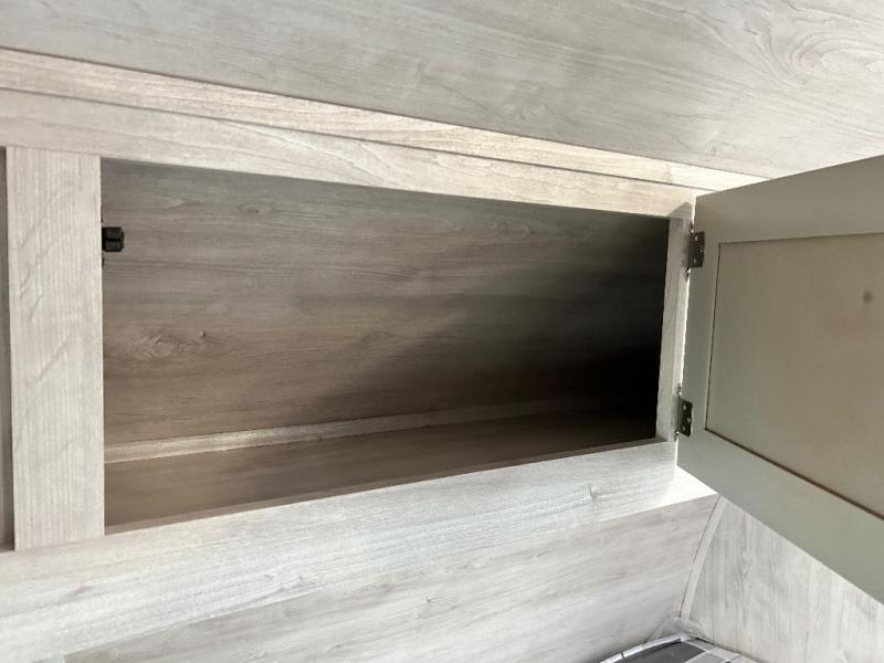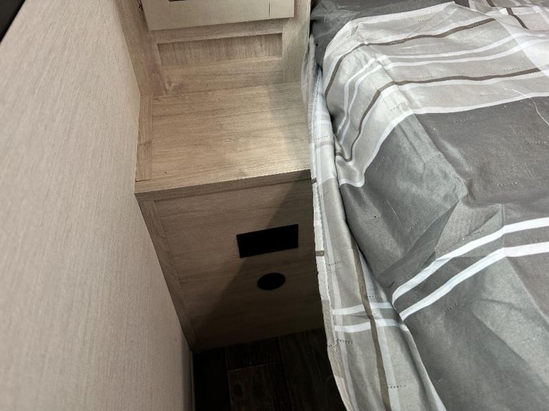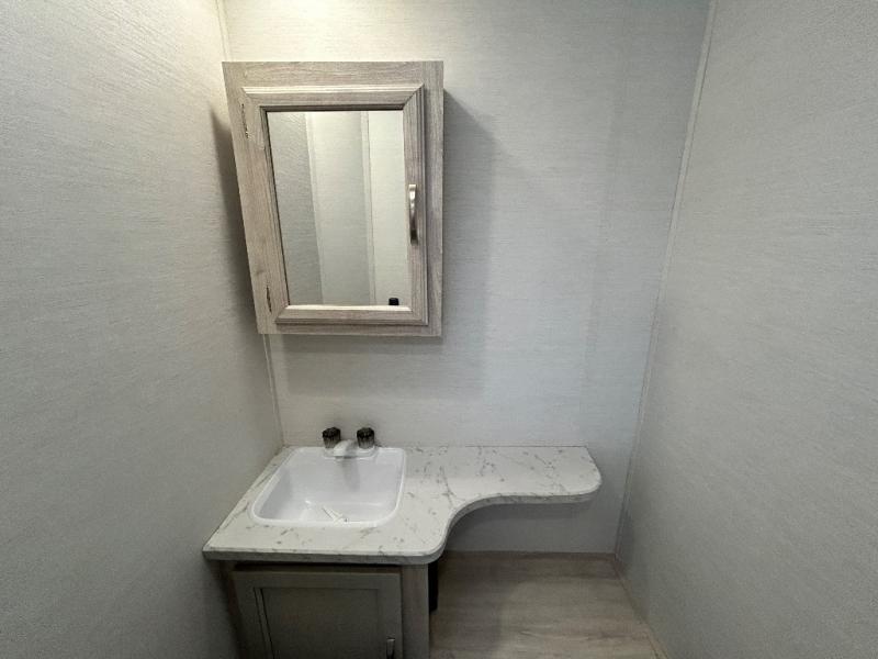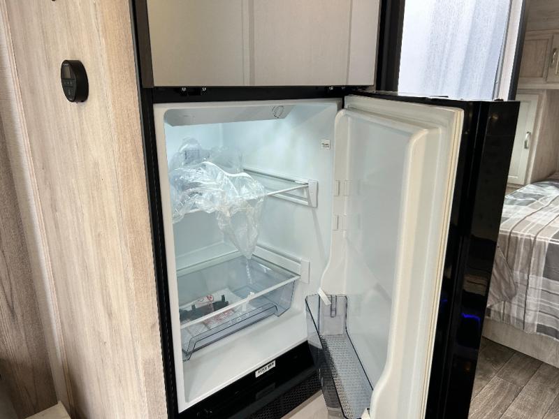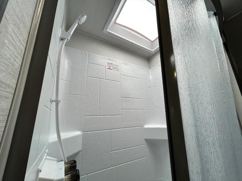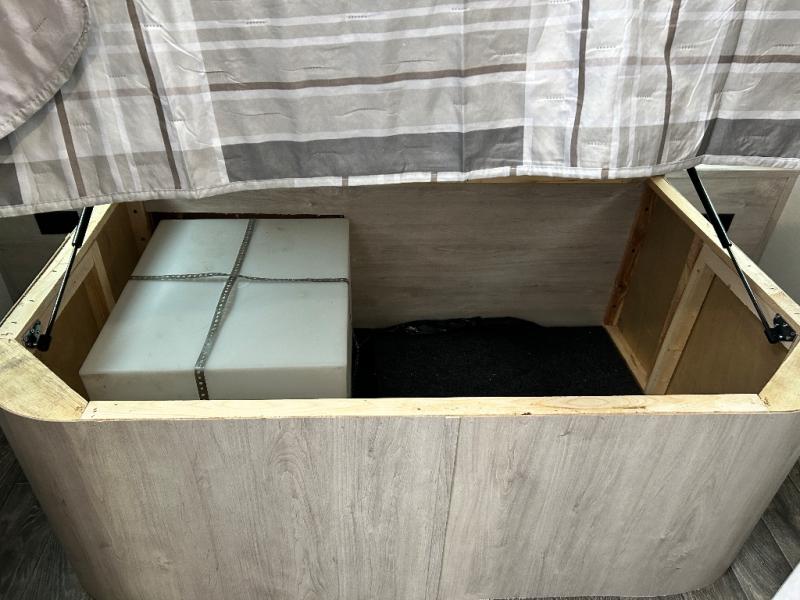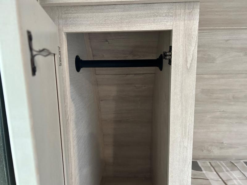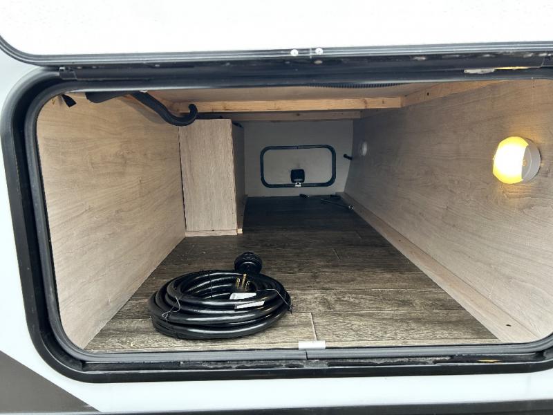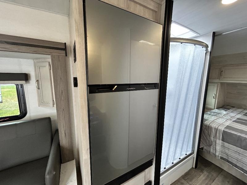 Book your favorite campsite and head to a great weekend getaway with your spouse and a guest or two in this travel trailer! There is a front 60" x 74" bed with shirt closets on either side for you to sleep on, and your guests can sleep on the sofa bed slide with end tables, as well as the rear booth dinette once they are converted. Whip up your best meals for everyone in the fully equipped kitchen that even has a microwave to pop a bag of popcorn at night. There is also a private lavatory and vanity, with the independent shower right across the hall so two people can freshen up at once!