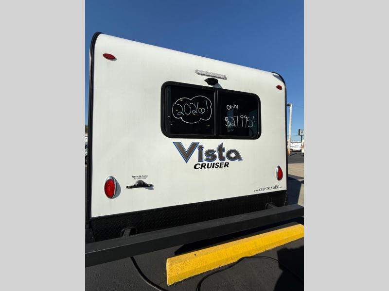 With any Vista Cruiser by Gulf Stream, you will enjoy premium quality in a compact and easy to tow travel trailer. The one-piece fiberglass roof, welded aluminum frame, and vacuum-bonded sidewalls with a composite barrier layer will create a strong and durable foundation to your RV. There are also LED running lights, along with an outside spray port, an electric awning, and a power tongue jack for easy set up. A home theater stereo with Bluetooth and speakers will allow you to listen to your favorite tunes, and there are interior and exterior TV mounting brackets if you decide to bring along a television. More interior features include "Opulence River Rock" wall vinyl, designer window treatments and night shades, tile backsplash at the range, and a premium foam mattress for your comfort.