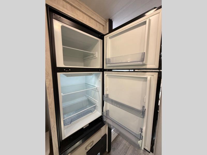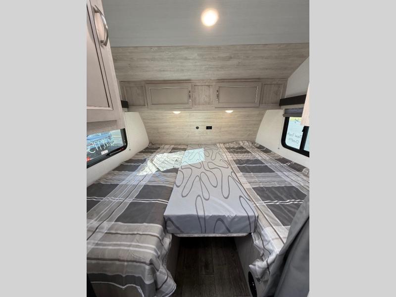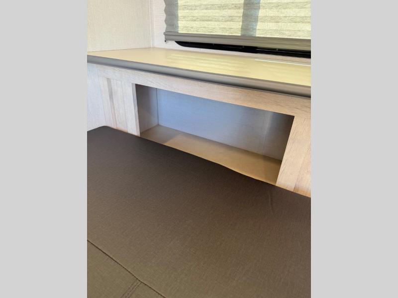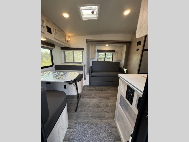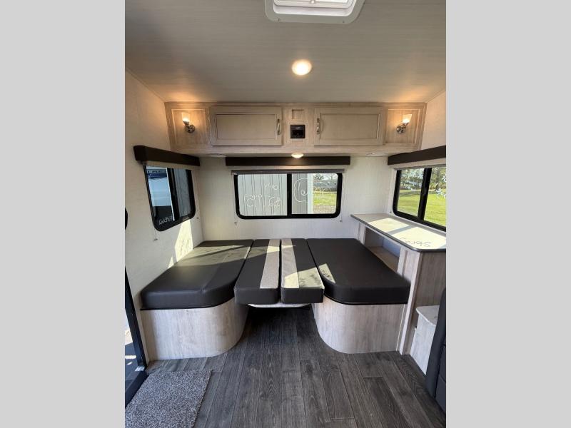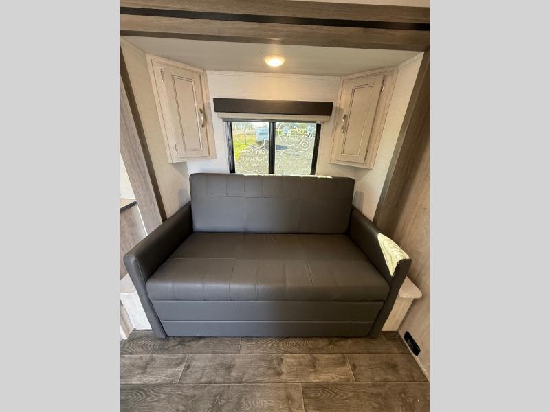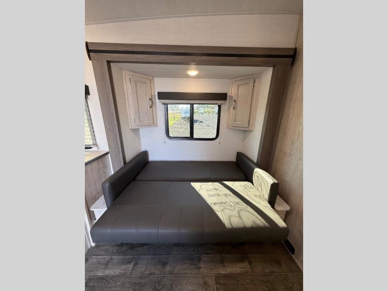 You will appreciate how versatile this travel trailer is! It features two front 32" x 80" twin beds with an insert for a king bed, plus a night stand with a drawer to keep your valuables secure. The separated bathroom allows one person to rinse the sand out of their hair in the shower while another uses the private lavatory and sink. The booth dinette is not only great for enjoying a meal or playing a card game, but also for transforming into an extra sleeping space. The sofa slide can also be another sleeping space, and the flat floor entry helps keep everyone from tripping as they enter or exit!
