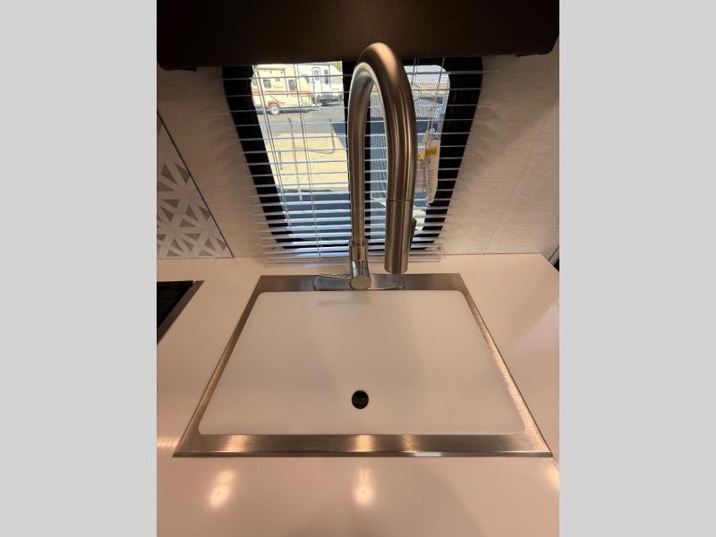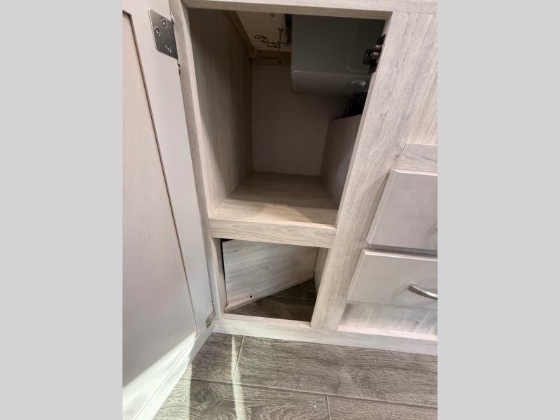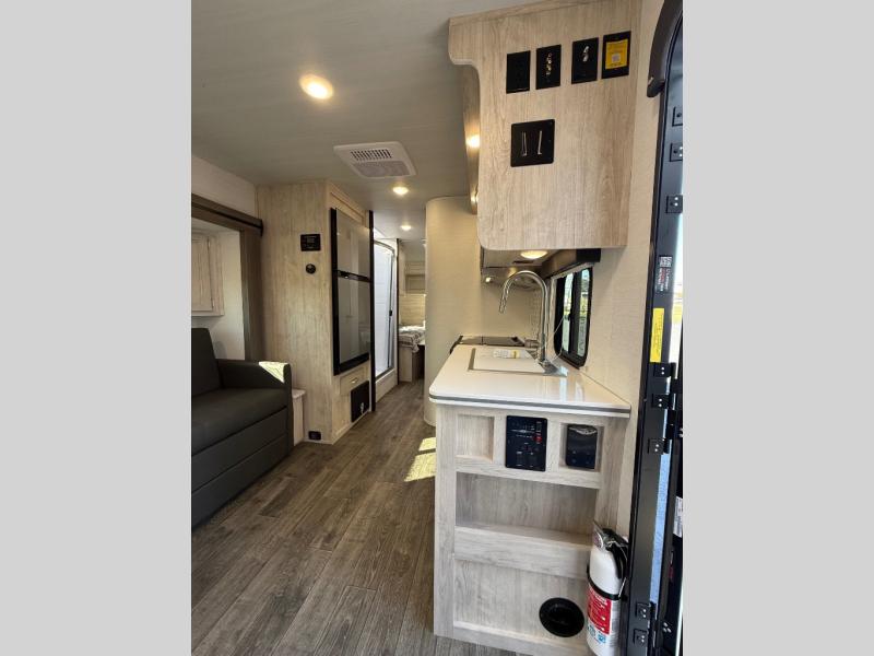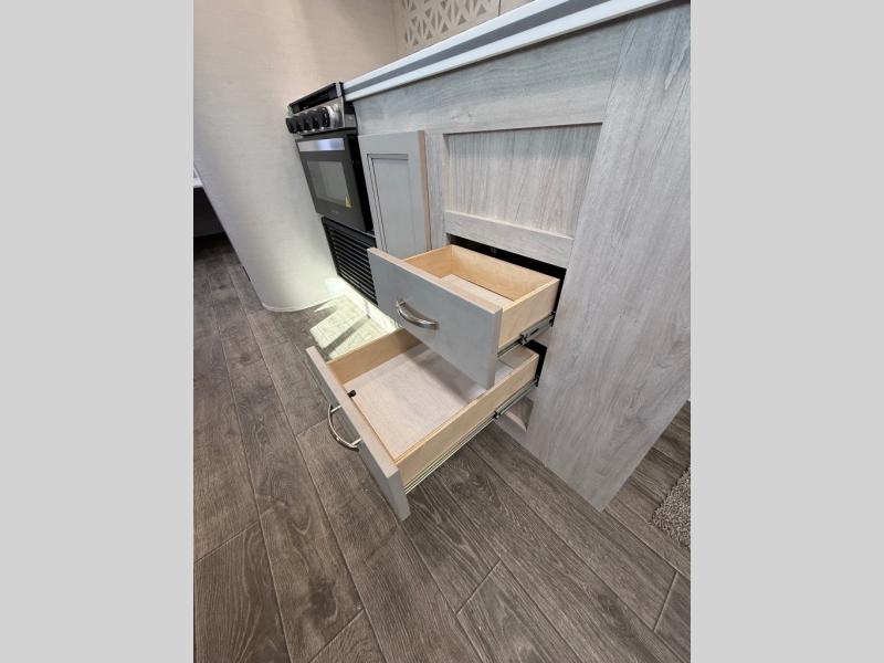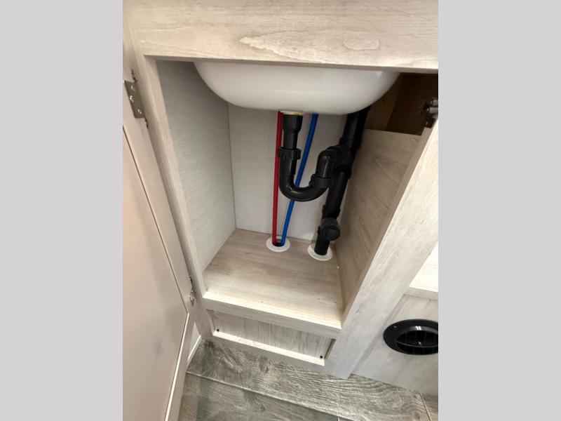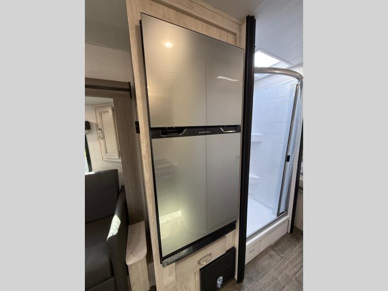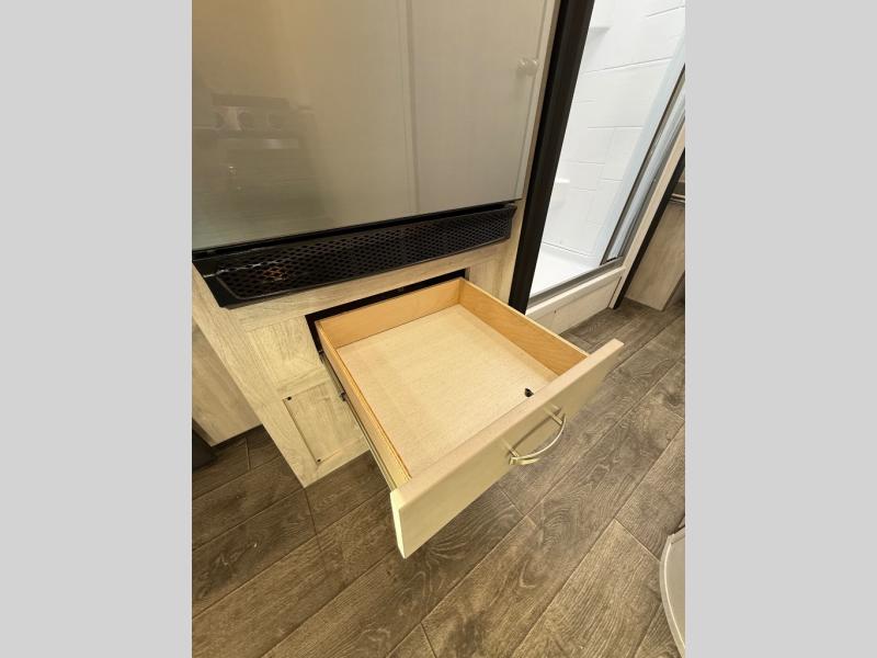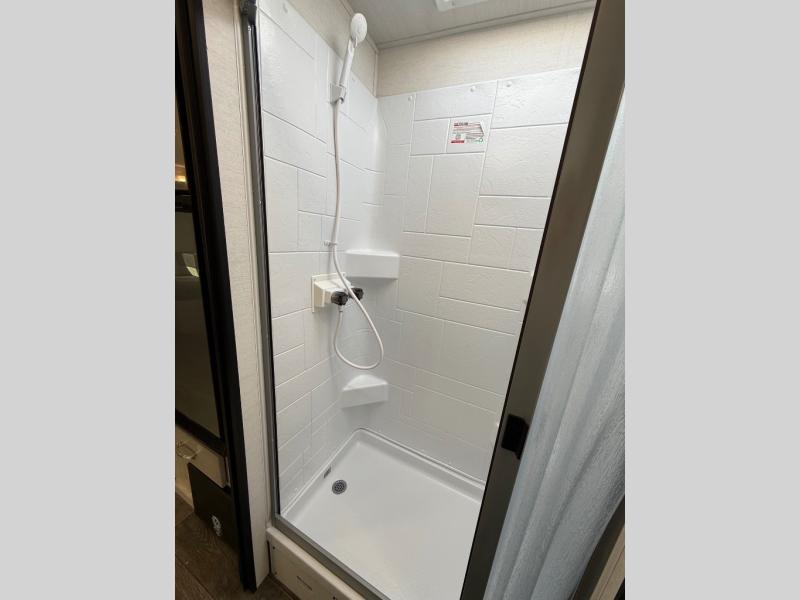 You will appreciate how versatile this travel trailer is! It features two front 32" x 80" twin beds with an insert for a king bed, plus a night stand with a drawer to keep your valuables secure. The separated bathroom allows one person to rinse the sand out of their hair in the shower while another uses the private lavatory and sink. The booth dinette is not only great for enjoying a meal or playing a card game, but also for transforming into an extra sleeping space. The sofa slide can also be another sleeping space, and the flat floor entry helps keep everyone from tripping as they enter or exit!