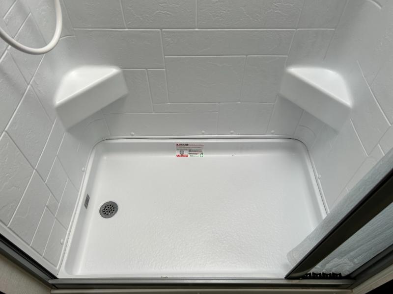 Bathroom includes a 24" x 36" shower, private lavatory, and sink.