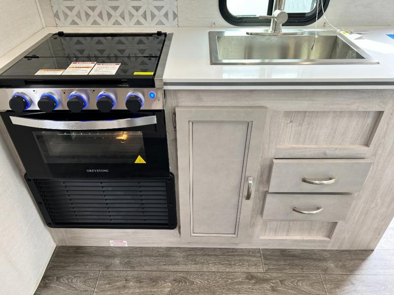 Kitchen features tile backsplash, premium foam mattress in sleeping area, and quality finishes.