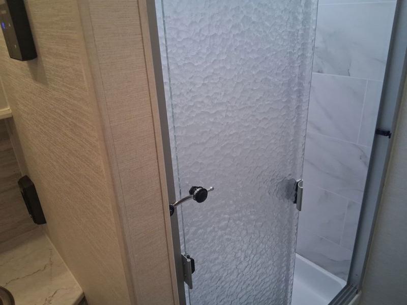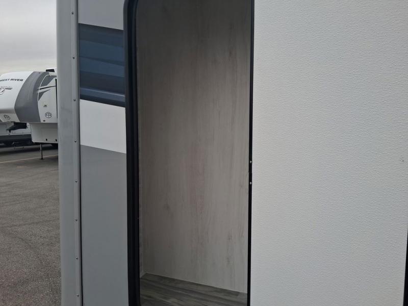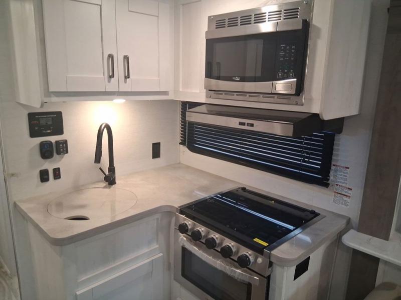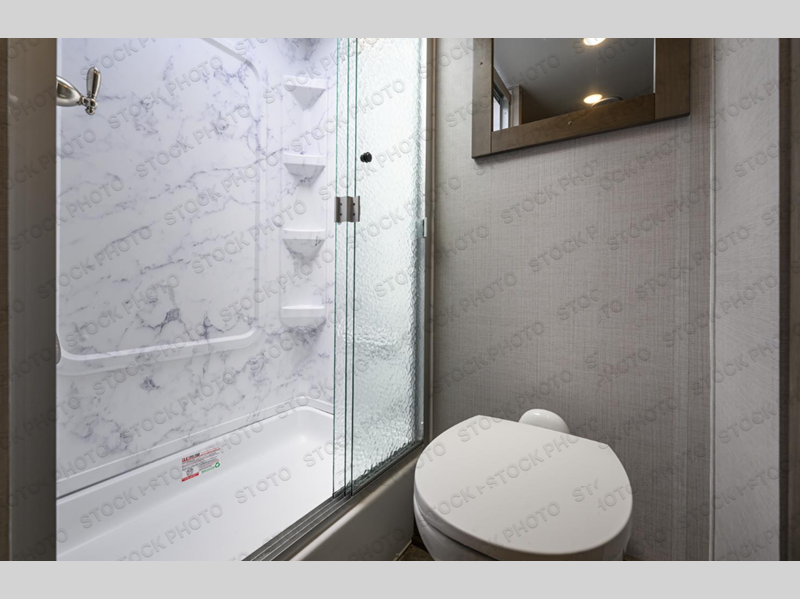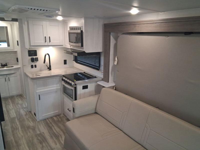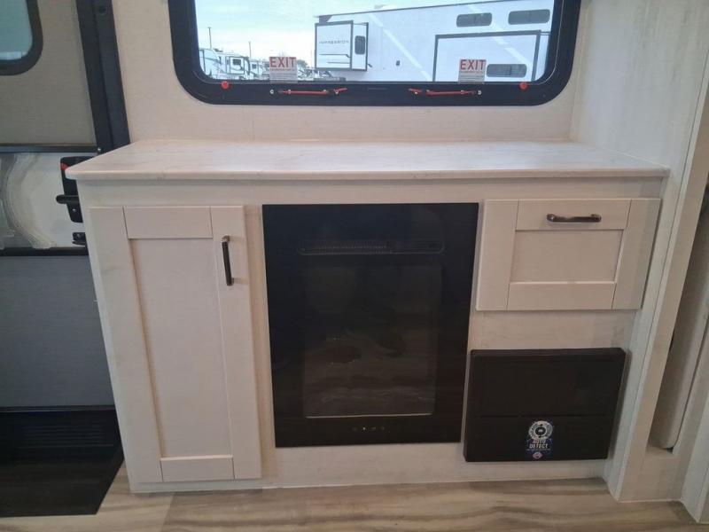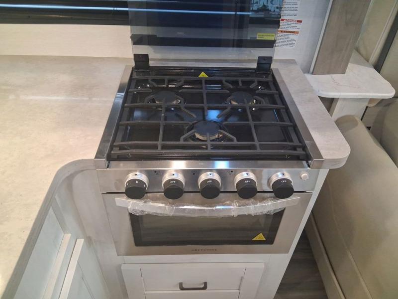 You will love this versatile coach for two! The slide out contains the sofa that converts to a Murphy bed at night, giving you more floor space during the day! There is a 40" LED HDTV across from the sofa for easy viewing, and you can even add an optional fireplace here if you want more comfort. A three-burner range with an oven will let you make your best meals, and there is a 10-cu. ft. 12V double door refrigerator to keep your cold items fresh. The back of this coach is shared with the private toilet and shower, with the sink just outside the door plus a spacious wardrobe for your clothes!