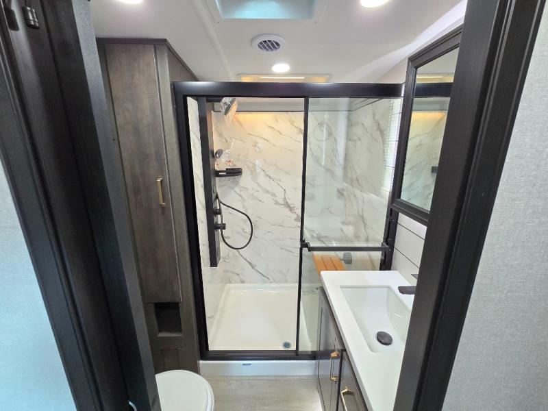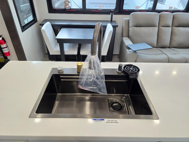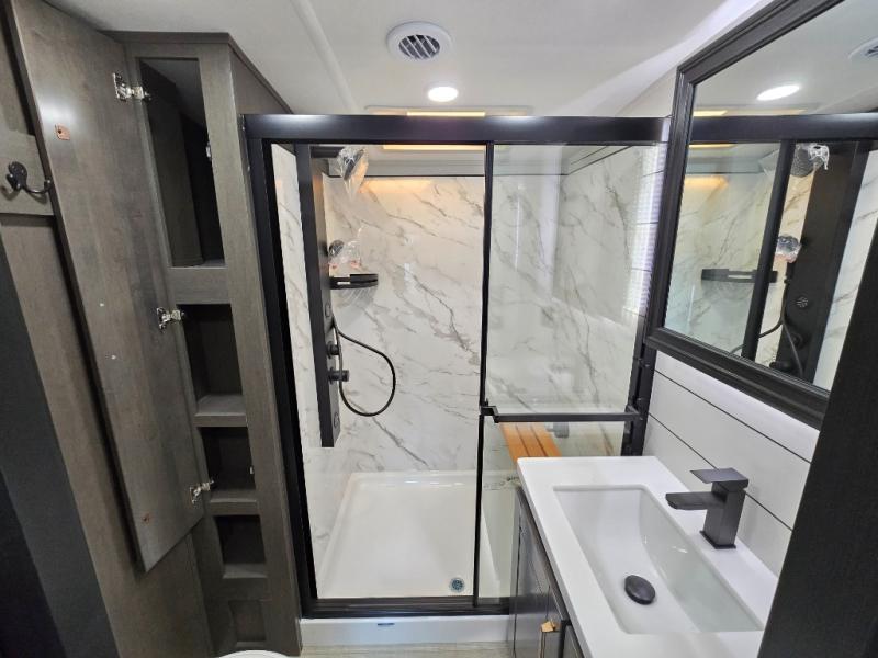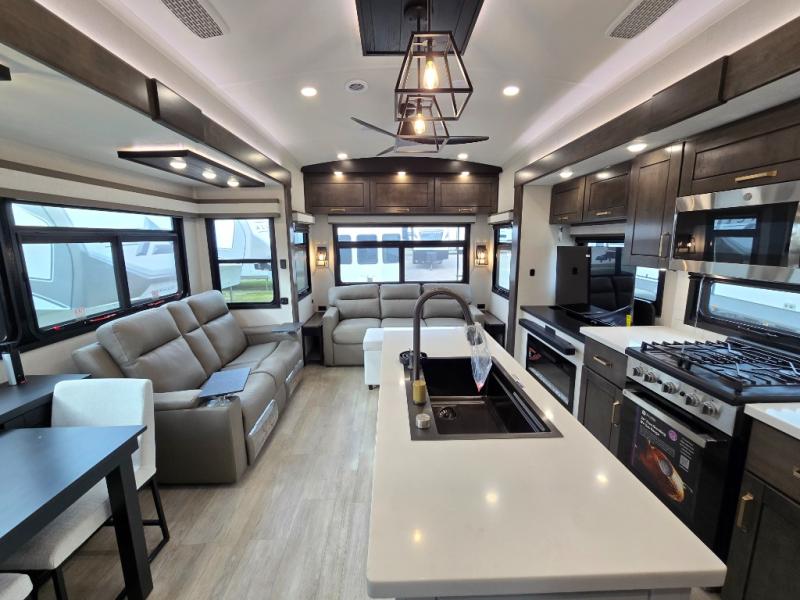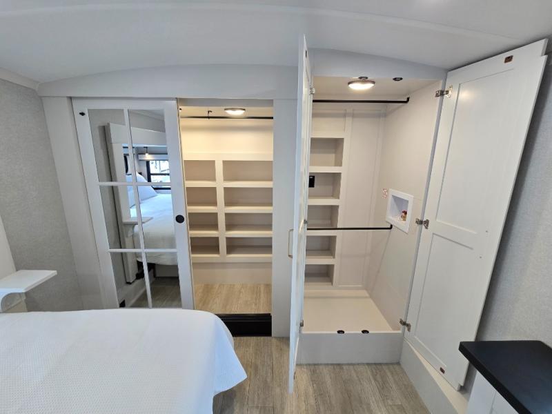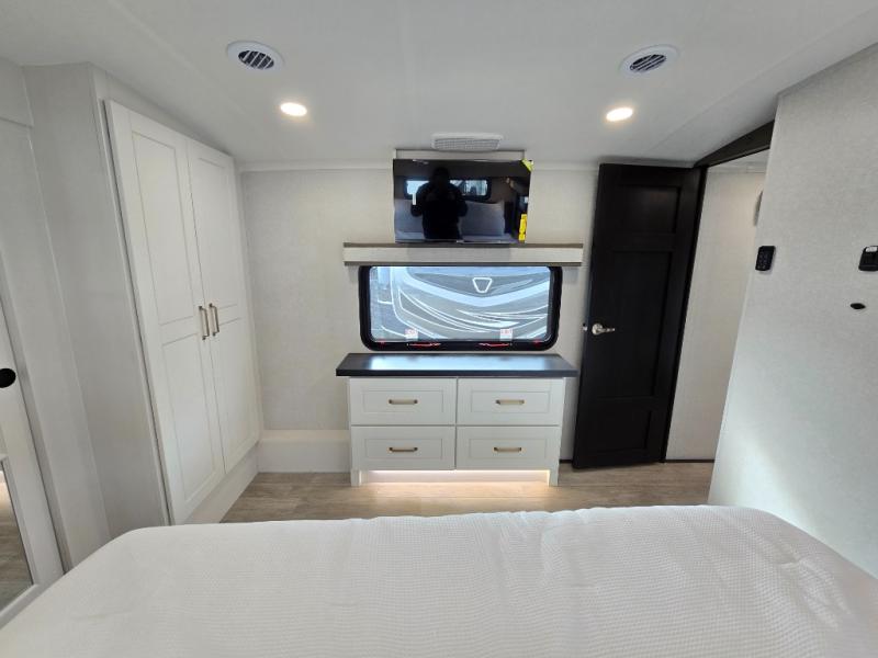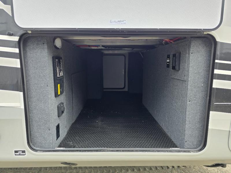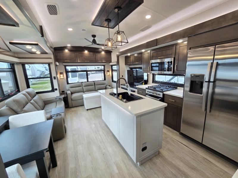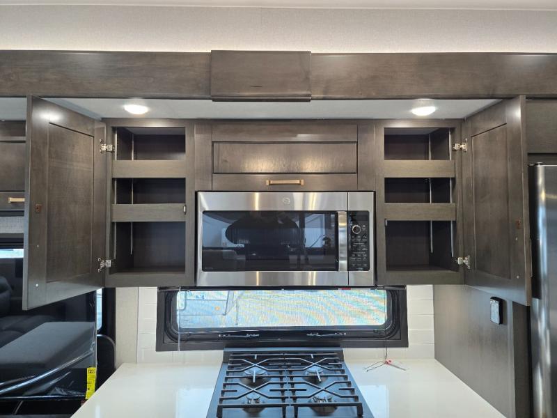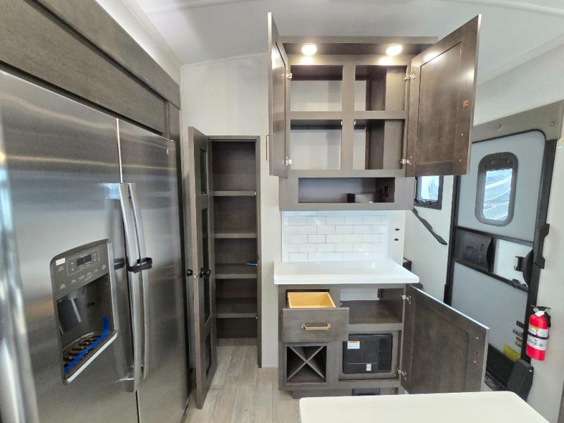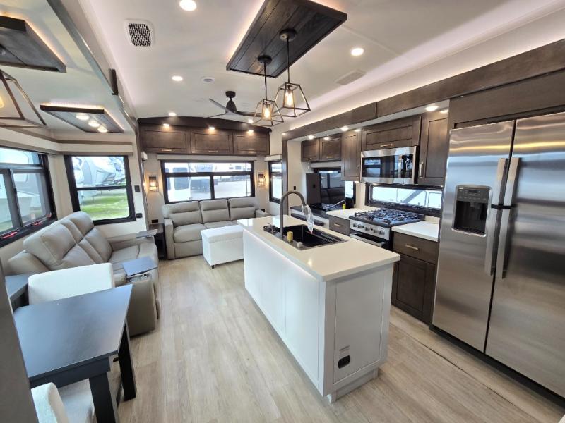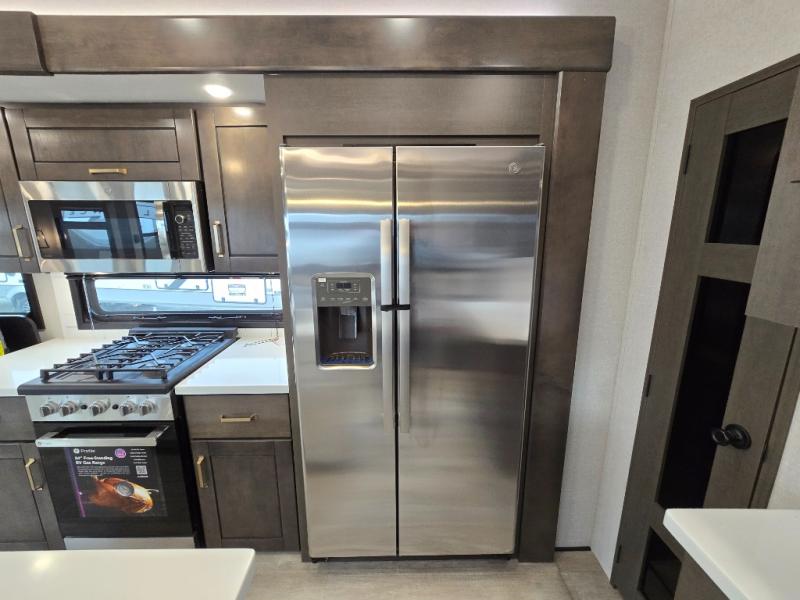 At the front of the unit, the spacious main bedroom offers a 72" x 80" king bed, providing ample room to relax and unwind. A wardrobe with drawers and a built-in hamper ensures plenty of organized storage for clothing and essentials, while a flip-up dresser across from the bed adds even more convenience. Moving down the hall, you’ll find a full bathroom featuring a large 36" x 48" shower with a built-in seat for added comfort. Toward the rear, the main living area has dual opposing slides that open up the space for maximum comfort and functionality. One slide hosts the fully equipped kitchen, complete with overhead cabinets, a convection microwave with built-in air fryer, a 24" range, and a 21-cu. ft. residential refrigerator, everything you need to cook in comfort. The central kitchen island features a residential “Do-It-All” sink with a pull-out faucet, glass rinse, vegetable rinse, and a pull-out cutting board for easy meal prep, while the corner pantry provides generous storage. Opposite the kitchen, you can relax in the theater seating or enjoy meals at the roll-out table. At the rear, a 78" hide-a-bed sofa offers additional lounging space or converts into extra-sleeping accommodations when needed.