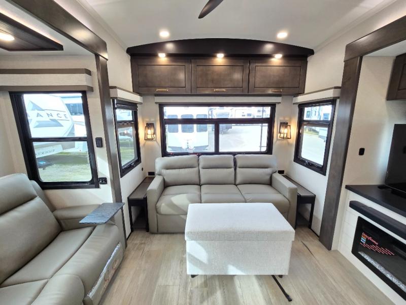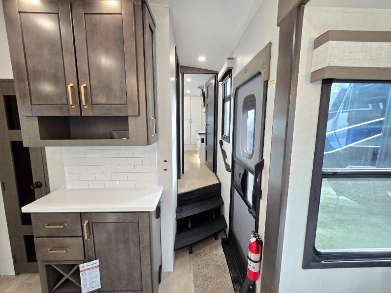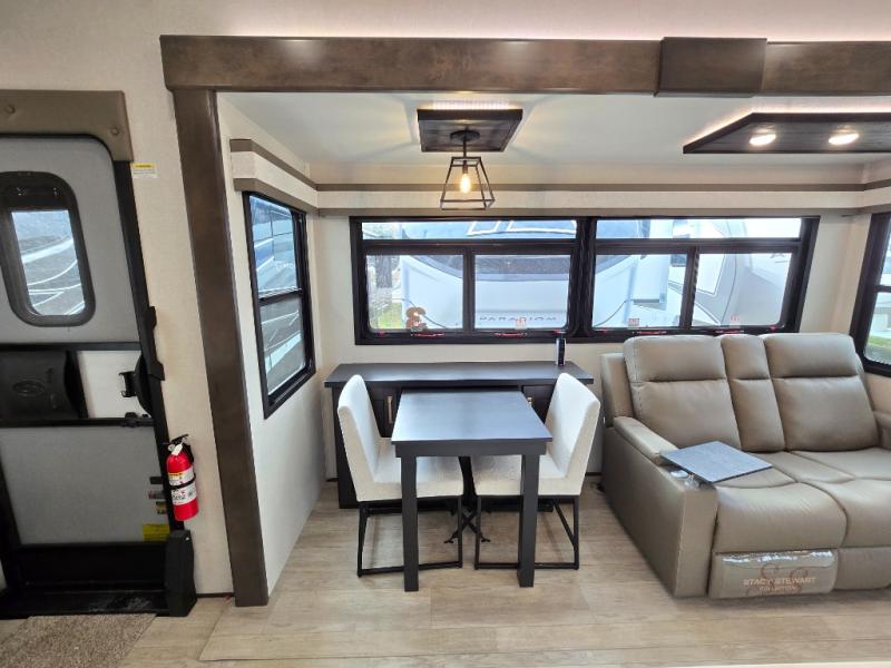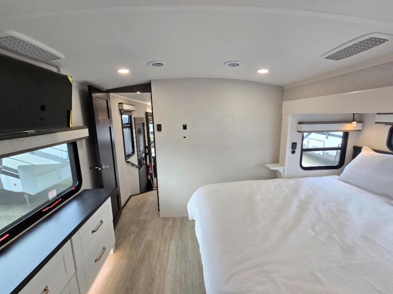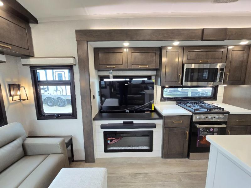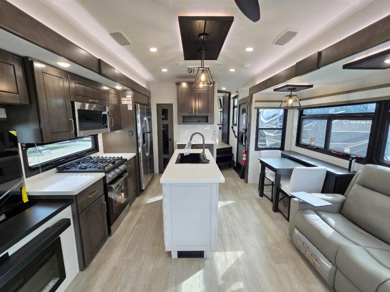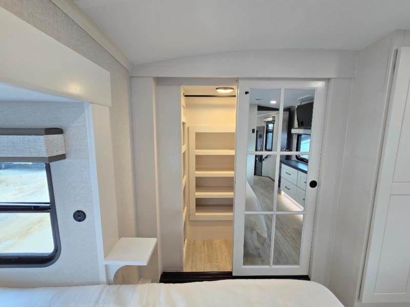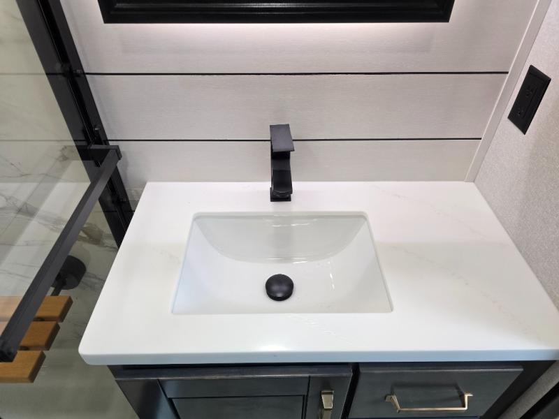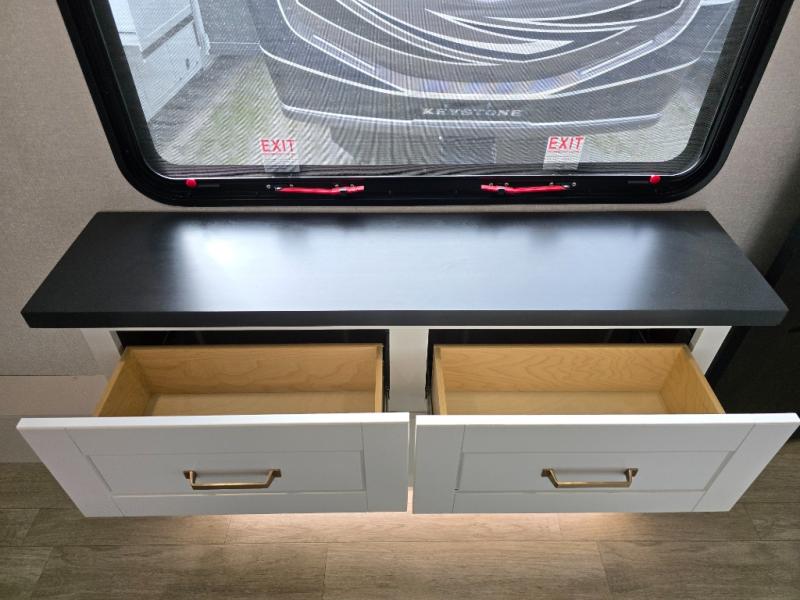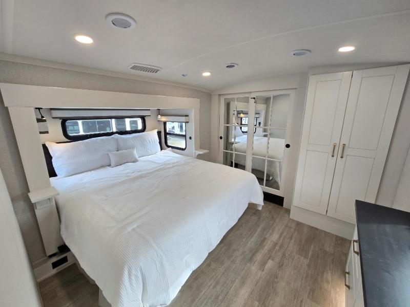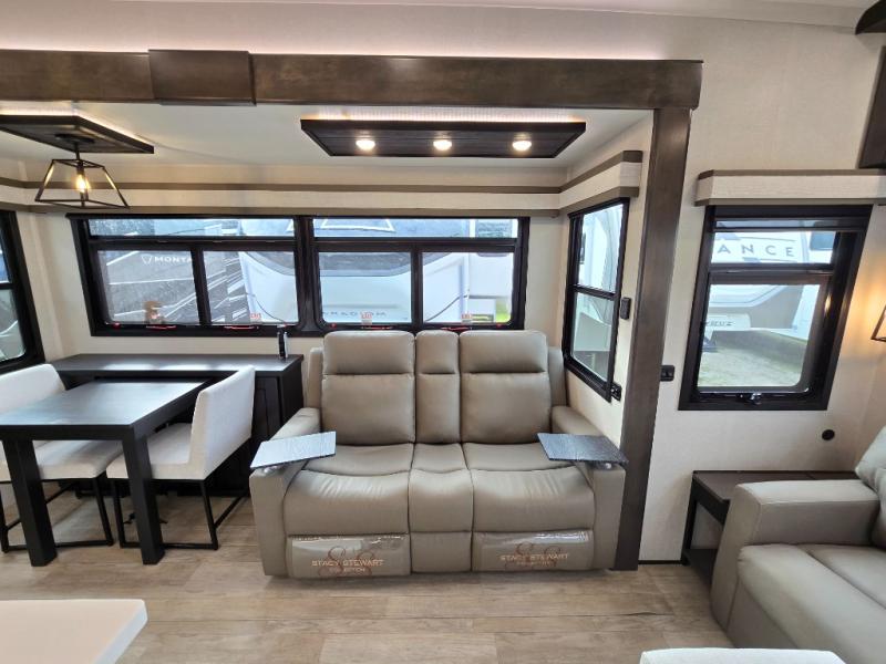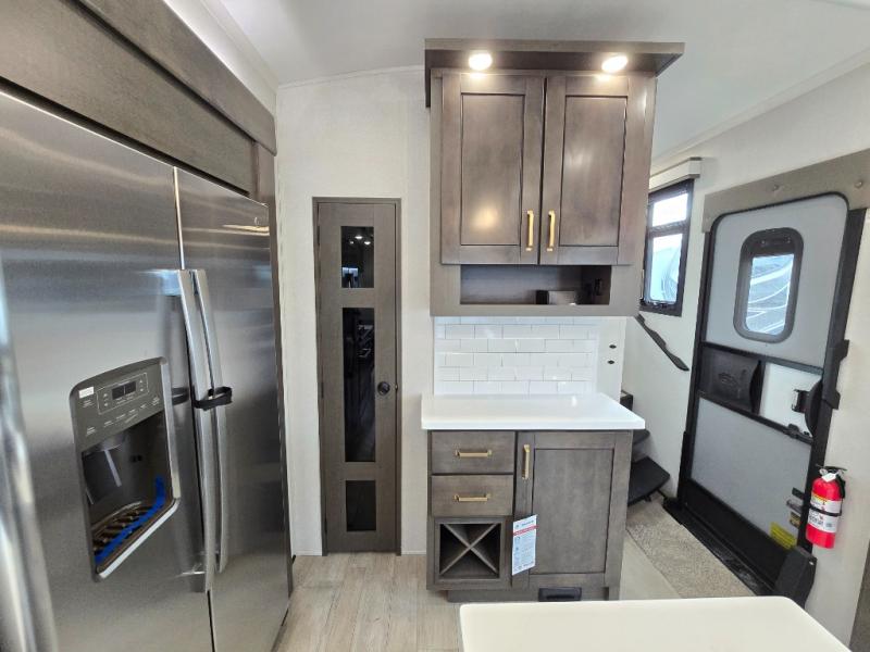 At the front of the unit, the spacious main bedroom offers a 72" x 80" king bed, providing ample room to relax and unwind. A wardrobe with drawers and a built-in hamper ensures plenty of organized storage for clothing and essentials, while a flip-up dresser across from the bed adds even more convenience. Moving down the hall, you’ll find a full bathroom featuring a large 36" x 48" shower with a built-in seat for added comfort. Toward the rear, the main living area has dual opposing slides that open up the space for maximum comfort and functionality. One slide hosts the fully equipped kitchen, complete with overhead cabinets, a convection microwave with built-in air fryer, a 24" range, and a 21-cu. ft. residential refrigerator, everything you need to cook in comfort. The central kitchen island features a residential “Do-It-All” sink with a pull-out faucet, glass rinse, vegetable rinse, and a pull-out cutting board for easy meal prep, while the corner pantry provides generous storage. Opposite the kitchen, you can relax in the theater seating or enjoy meals at the roll-out table. At the rear, a 78" hide-a-bed sofa offers additional lounging space or converts into extra-sleeping accommodations when needed.