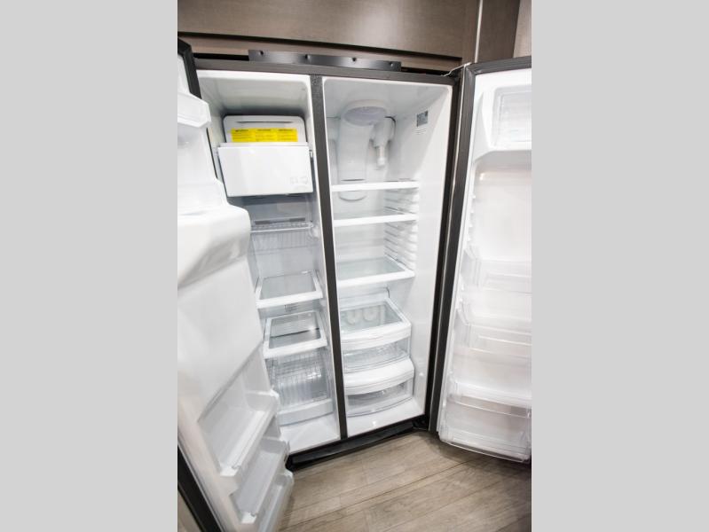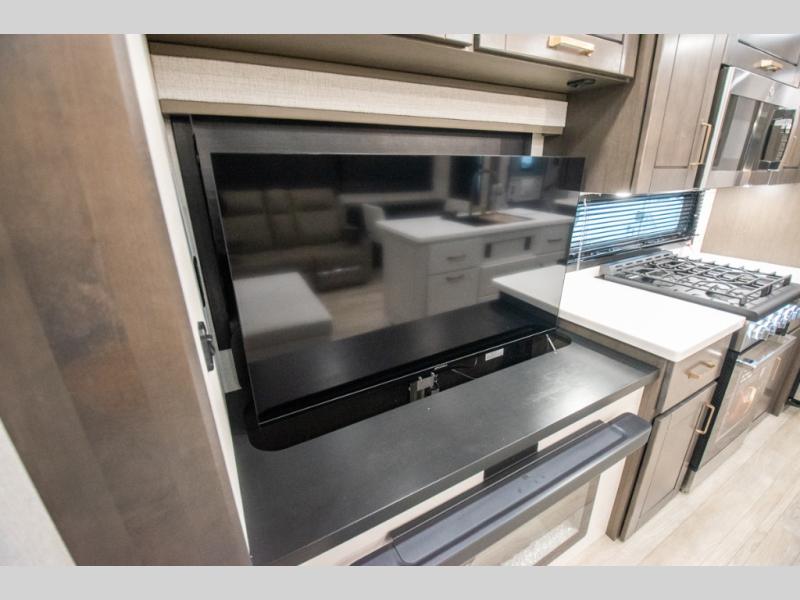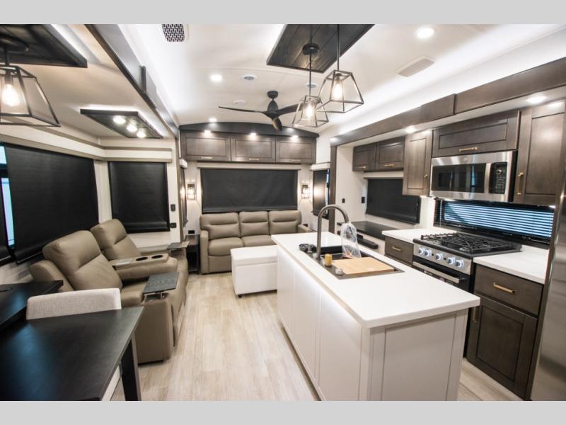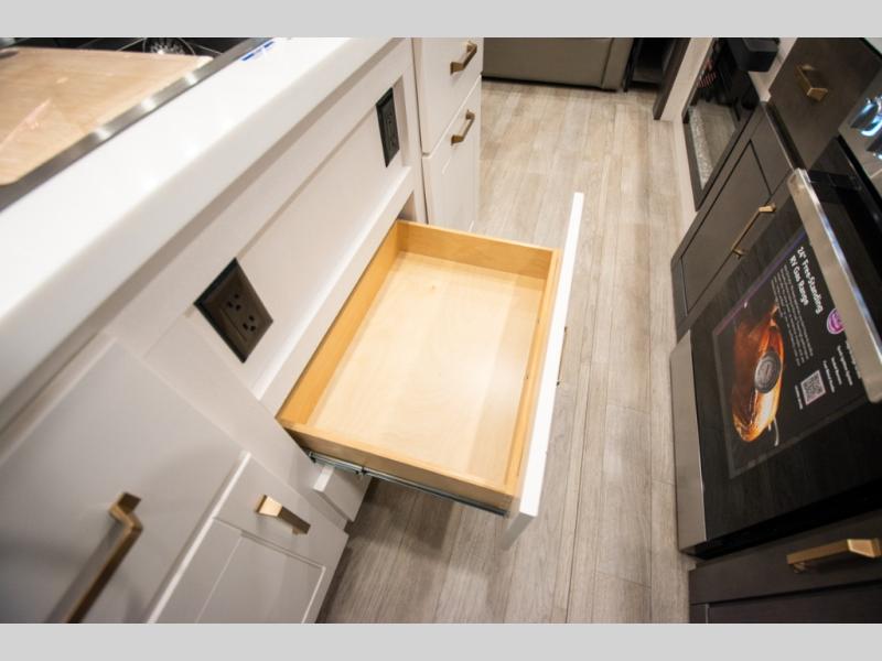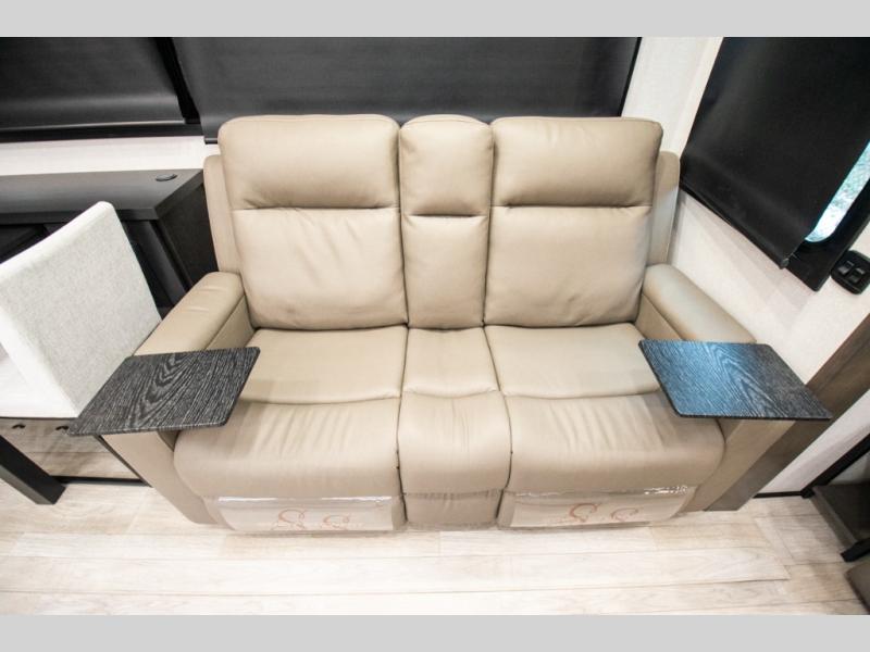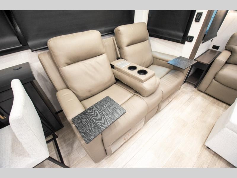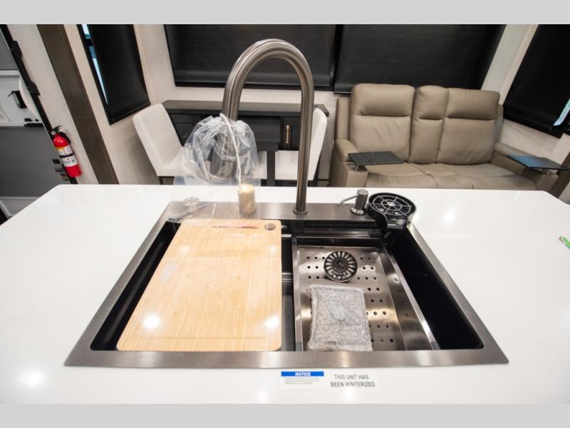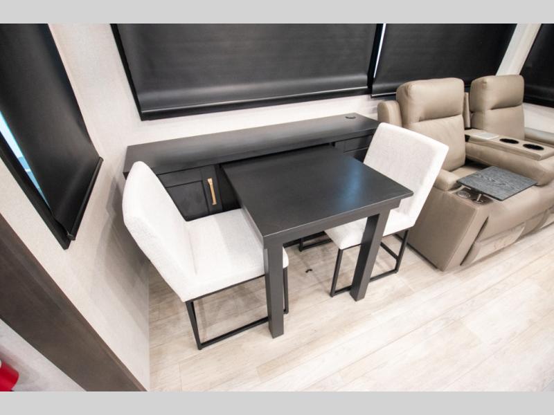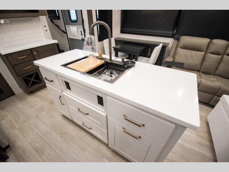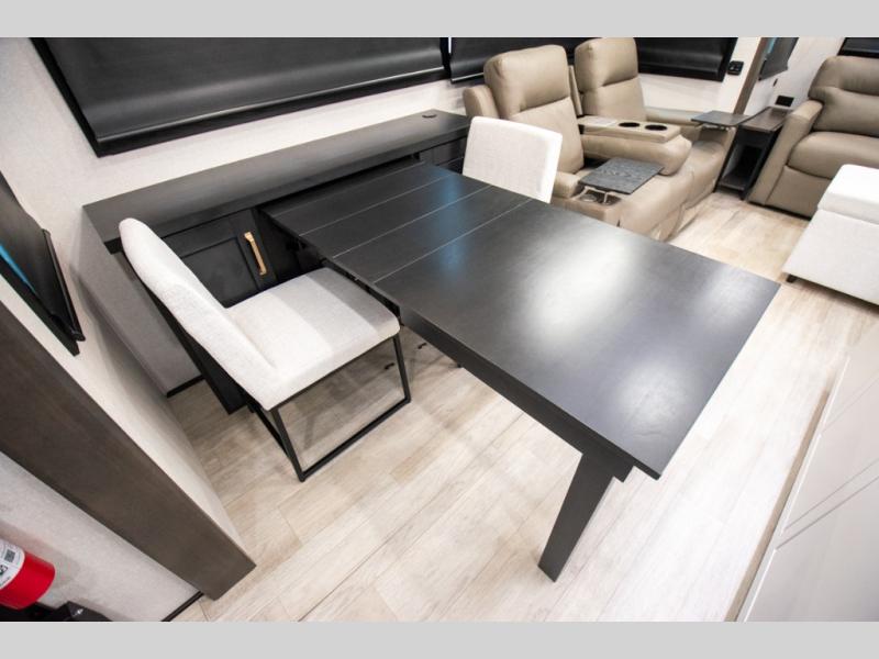 At the front of the unit, the spacious main bedroom offers a 72" x 80" king bed, providing ample room to relax and unwind. A wardrobe with drawers and a built-in hamper ensures plenty of organized storage for clothing and essentials, while a flip-up dresser across from the bed adds even more convenience. Moving down the hall, you’ll find a full bathroom featuring a large 36" x 48" shower with a built-in seat for added comfort. Toward the rear, the main living area has dual opposing slides that open up the space for maximum comfort and functionality. One slide hosts the fully equipped kitchen, complete with overhead cabinets, a convection microwave with built-in air fryer, a 24" range, and a 21-cu. ft. residential refrigerator, everything you need to cook in comfort. The central kitchen island features a residential “Do-It-All” sink with a pull-out faucet, glass rinse, vegetable rinse, and a pull-out cutting board for easy meal prep, while the corner pantry provides generous storage. Opposite the kitchen, you can relax in the theater seating or enjoy meals at the roll-out table. At the rear, a 78" hide-a-bed sofa offers additional lounging space or converts into extra-sleeping accommodations when needed.