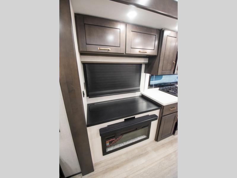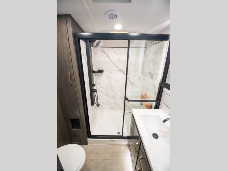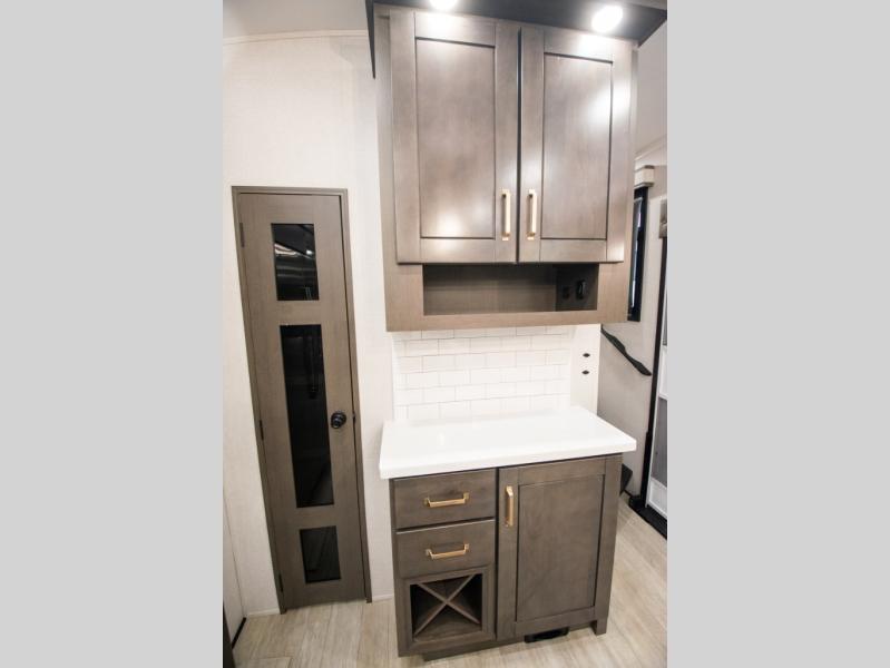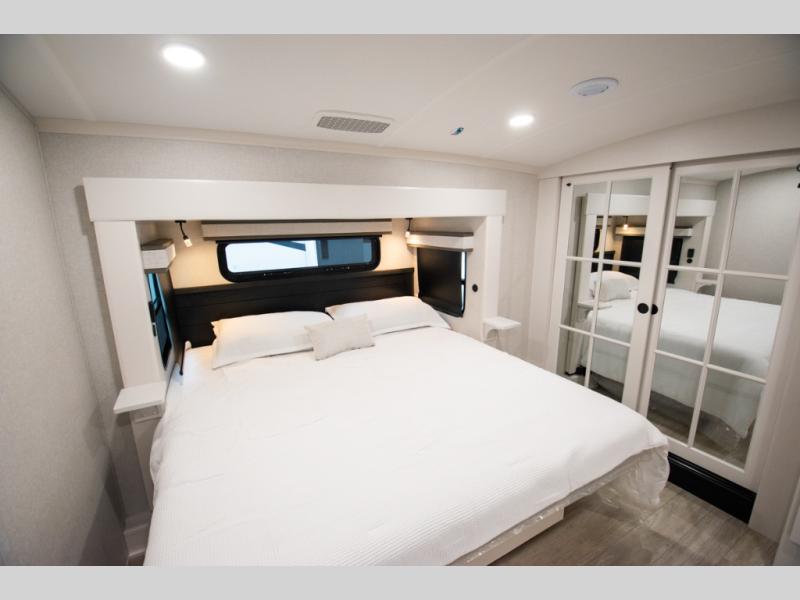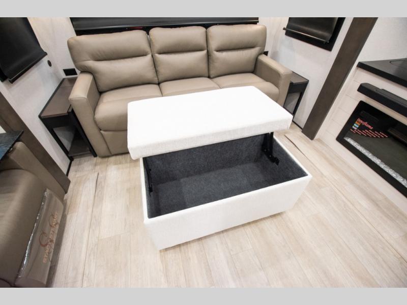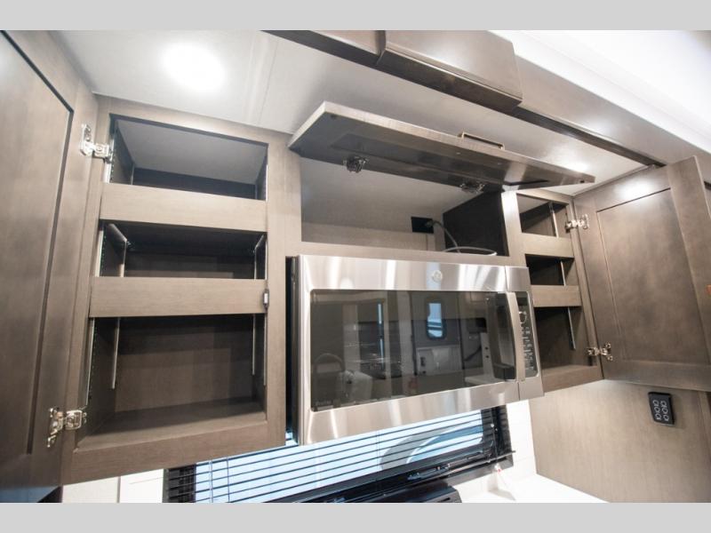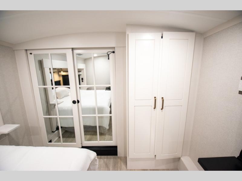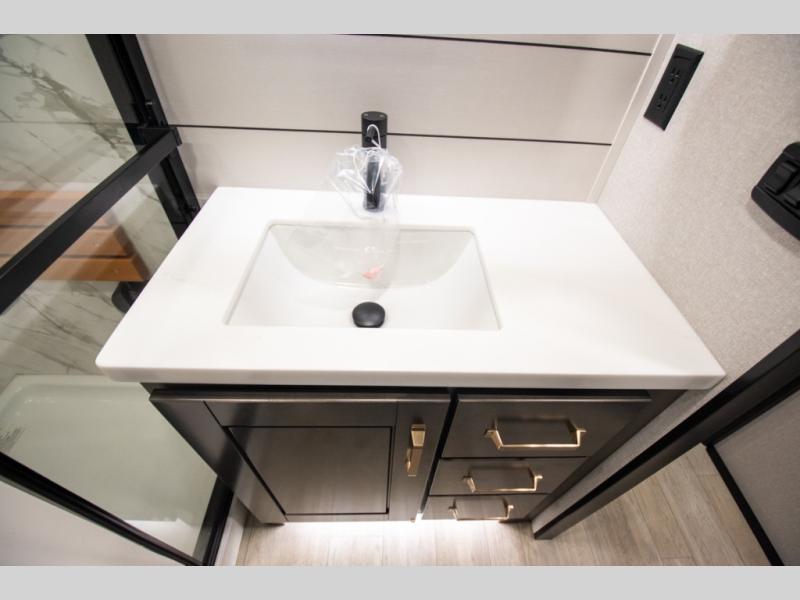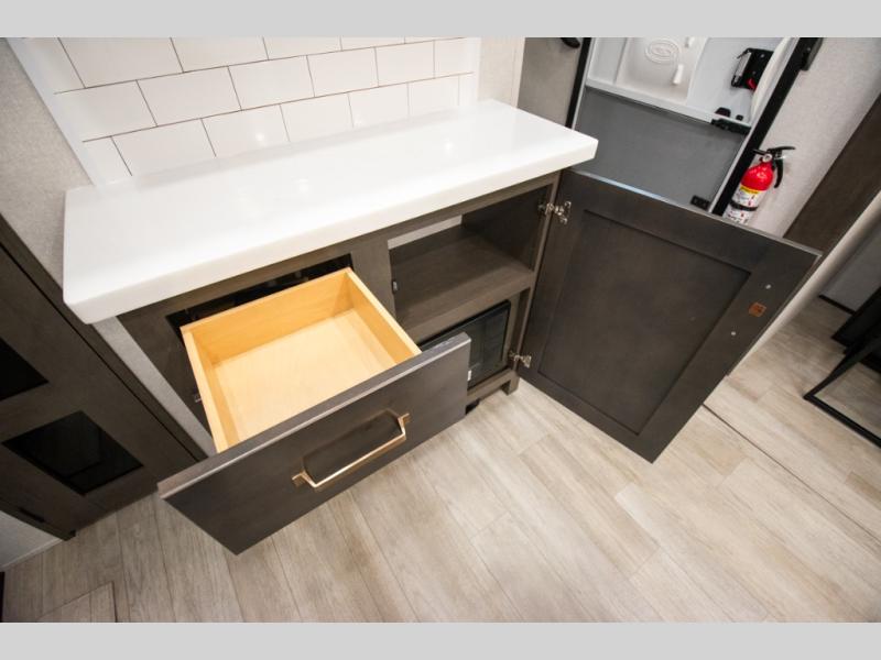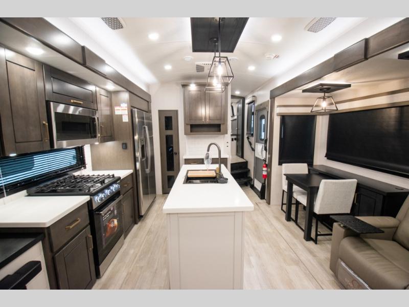 At the front of the unit, the spacious main bedroom offers a 72" x 80" king bed, providing ample room to relax and unwind. A wardrobe with drawers and a built-in hamper ensures plenty of organized storage for clothing and essentials, while a flip-up dresser across from the bed adds even more convenience. Moving down the hall, you’ll find a full bathroom featuring a large 36" x 48" shower with a built-in seat for added comfort. Toward the rear, the main living area has dual opposing slides that open up the space for maximum comfort and functionality. One slide hosts the fully equipped kitchen, complete with overhead cabinets, a convection microwave with built-in air fryer, a 24" range, and a 21-cu. ft. residential refrigerator, everything you need to cook in comfort. The central kitchen island features a residential “Do-It-All” sink with a pull-out faucet, glass rinse, vegetable rinse, and a pull-out cutting board for easy meal prep, while the corner pantry provides generous storage. Opposite the kitchen, you can relax in the theater seating or enjoy meals at the roll-out table. At the rear, a 78" hide-a-bed sofa offers additional lounging space or converts into extra-sleeping accommodations when needed.
