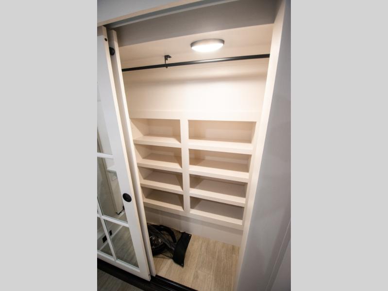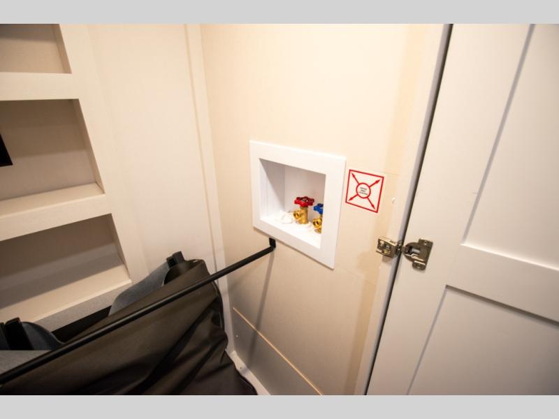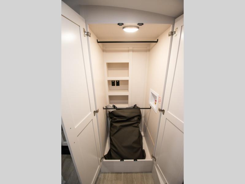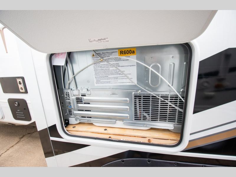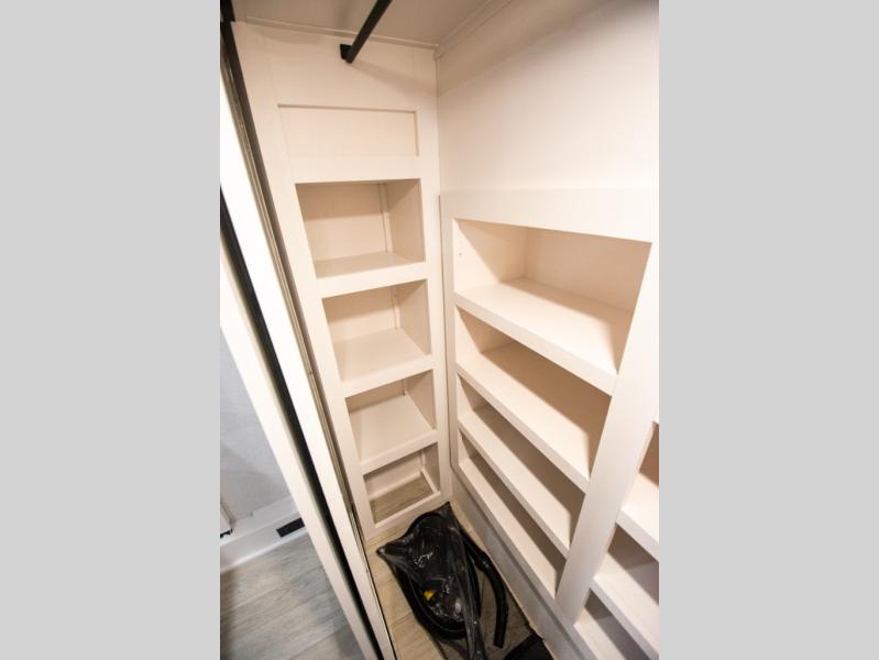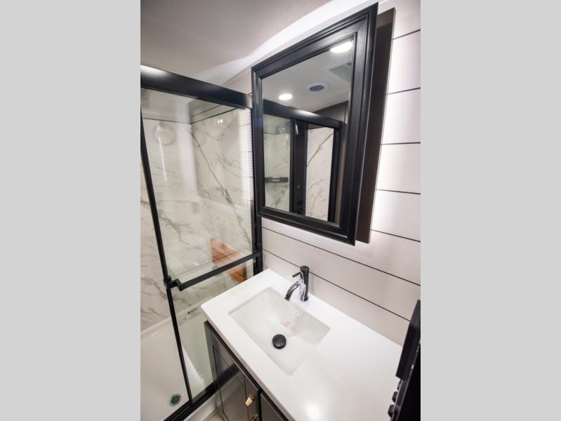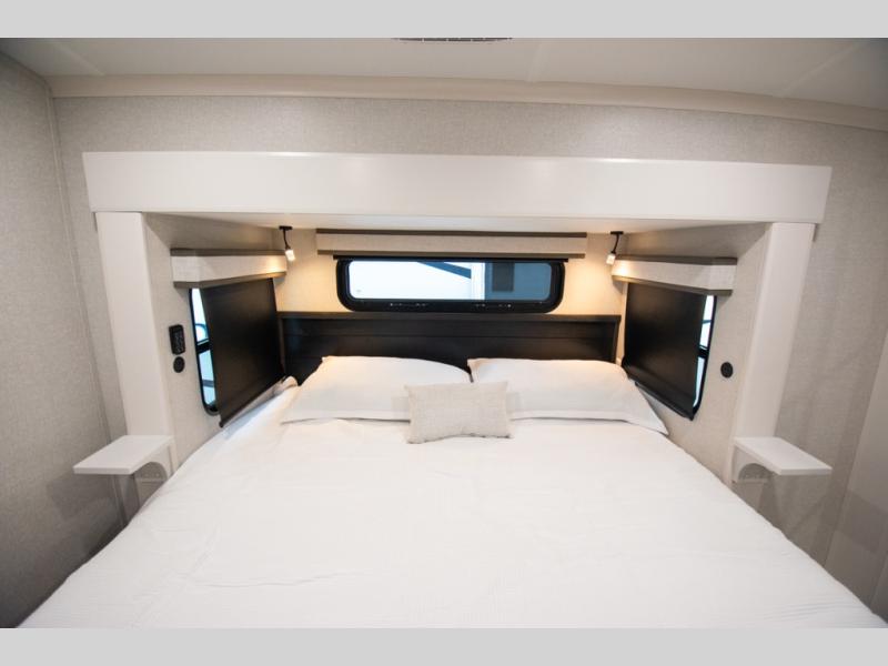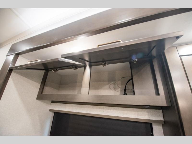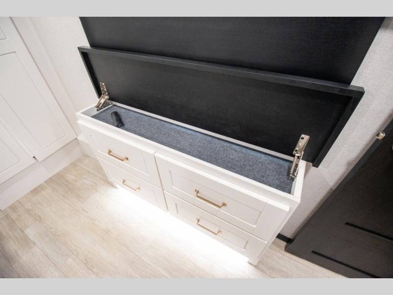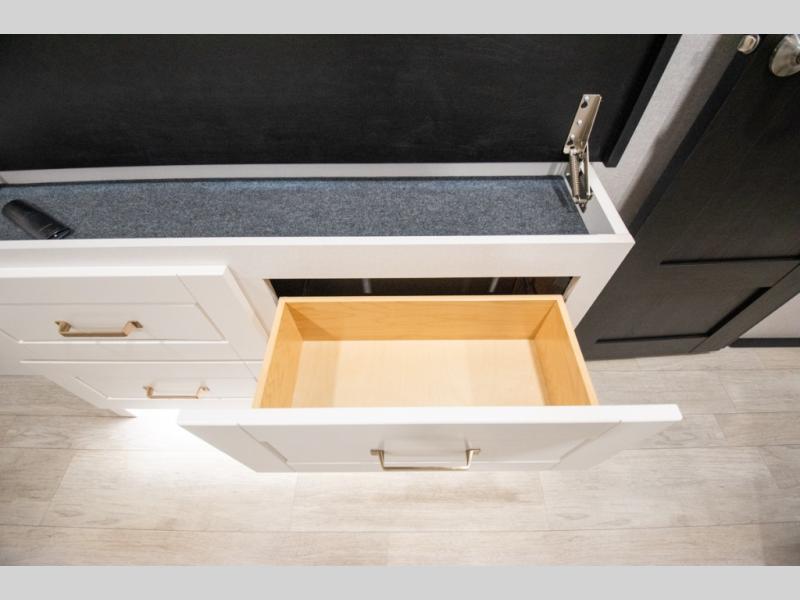 At the front of the unit, the spacious main bedroom offers a 72" x 80" king bed, providing ample room to relax and unwind. A wardrobe with drawers and a built-in hamper ensures plenty of organized storage for clothing and essentials, while a flip-up dresser across from the bed adds even more convenience. Moving down the hall, you’ll find a full bathroom featuring a large 36" x 48" shower with a built-in seat for added comfort. Toward the rear, the main living area has dual opposing slides that open up the space for maximum comfort and functionality. One slide hosts the fully equipped kitchen, complete with overhead cabinets, a convection microwave with built-in air fryer, a 24" range, and a 21-cu. ft. residential refrigerator, everything you need to cook in comfort. The central kitchen island features a residential “Do-It-All” sink with a pull-out faucet, glass rinse, vegetable rinse, and a pull-out cutting board for easy meal prep, while the corner pantry provides generous storage. Opposite the kitchen, you can relax in the theater seating or enjoy meals at the roll-out table. At the rear, a 78" hide-a-bed sofa offers additional lounging space or converts into extra-sleeping accommodations when needed.