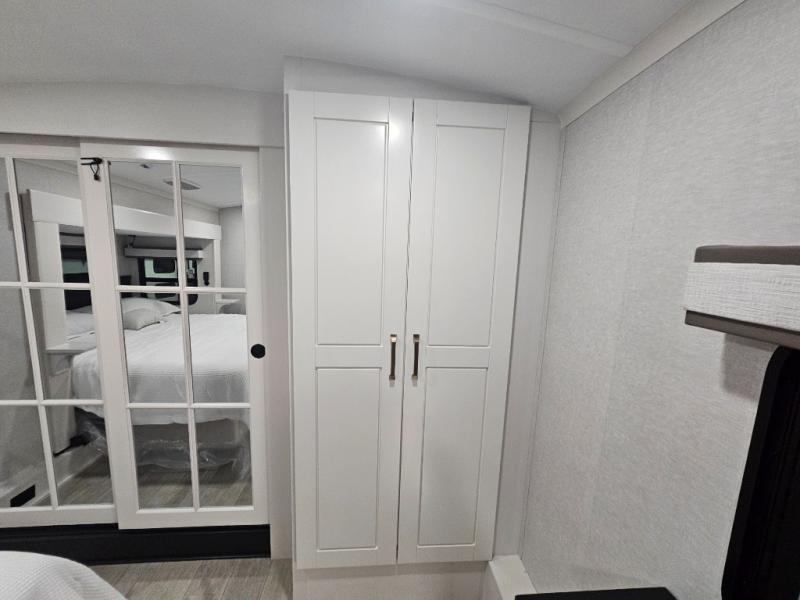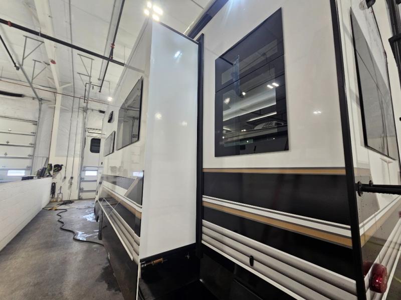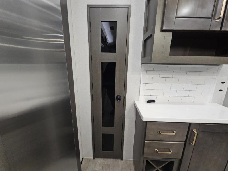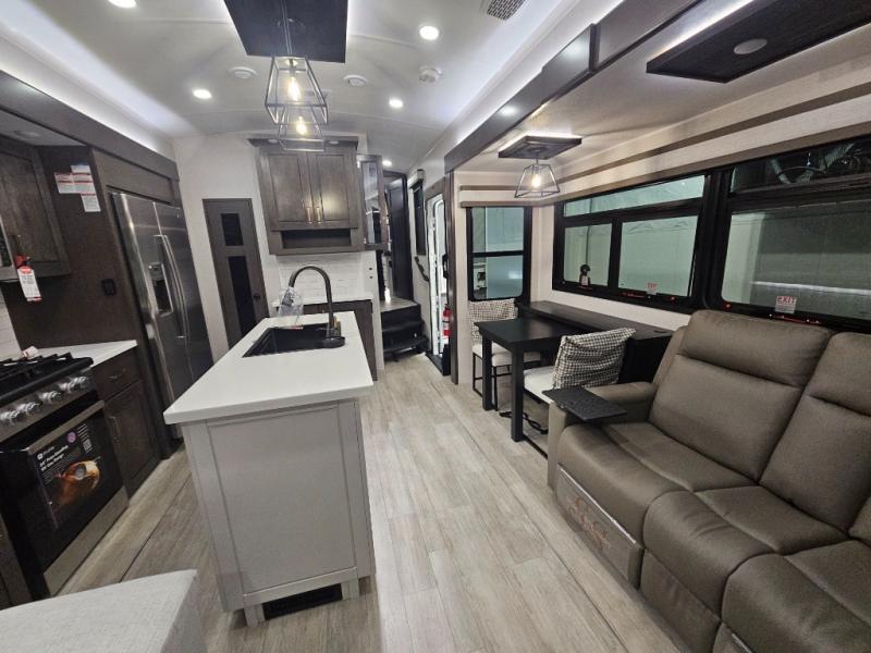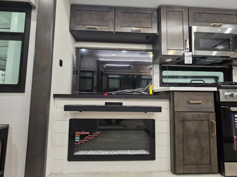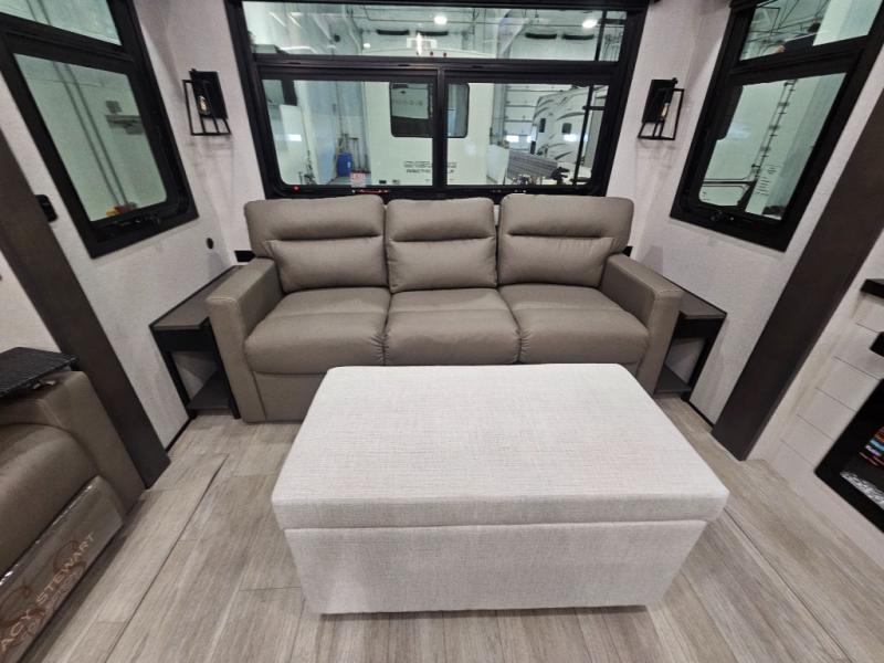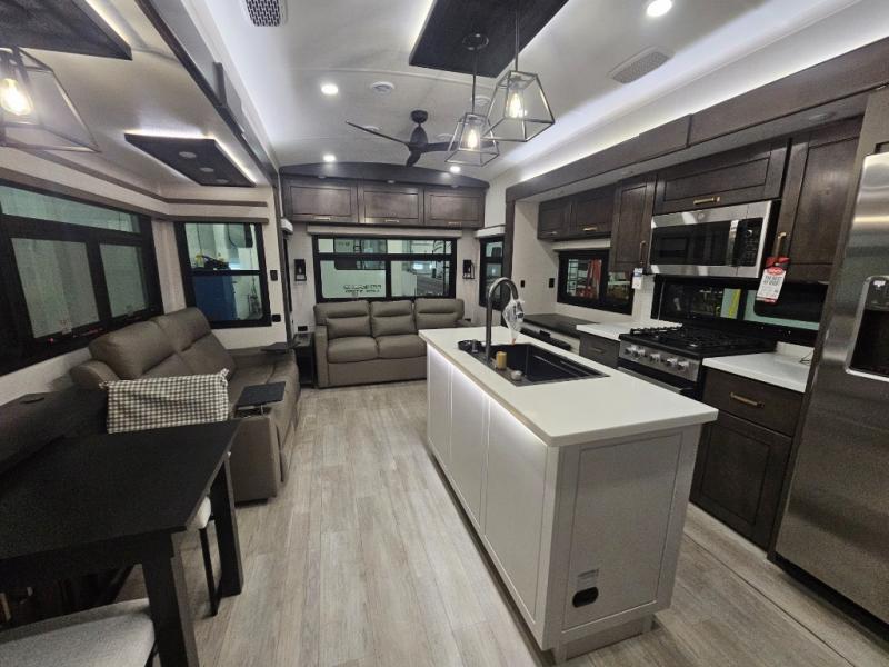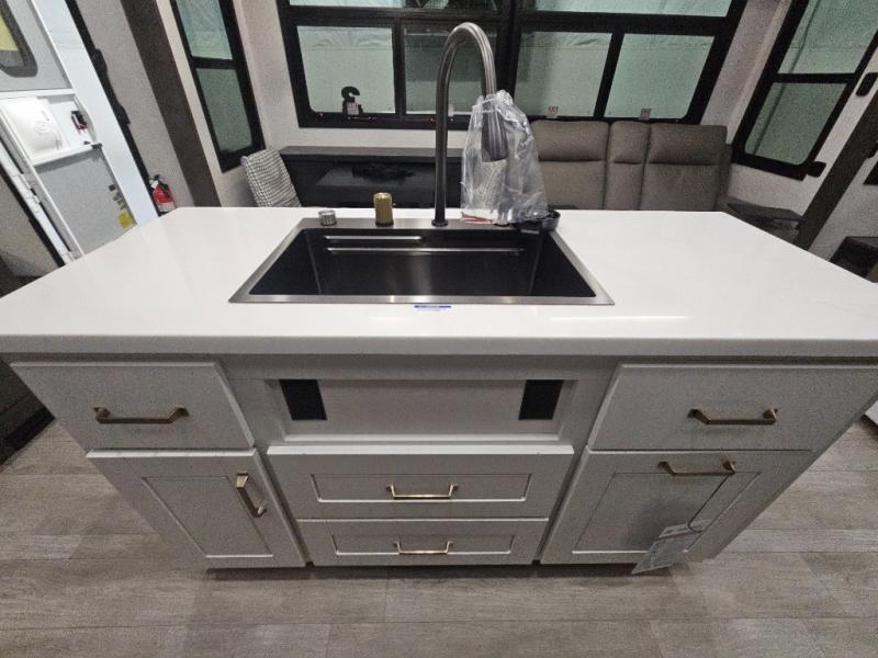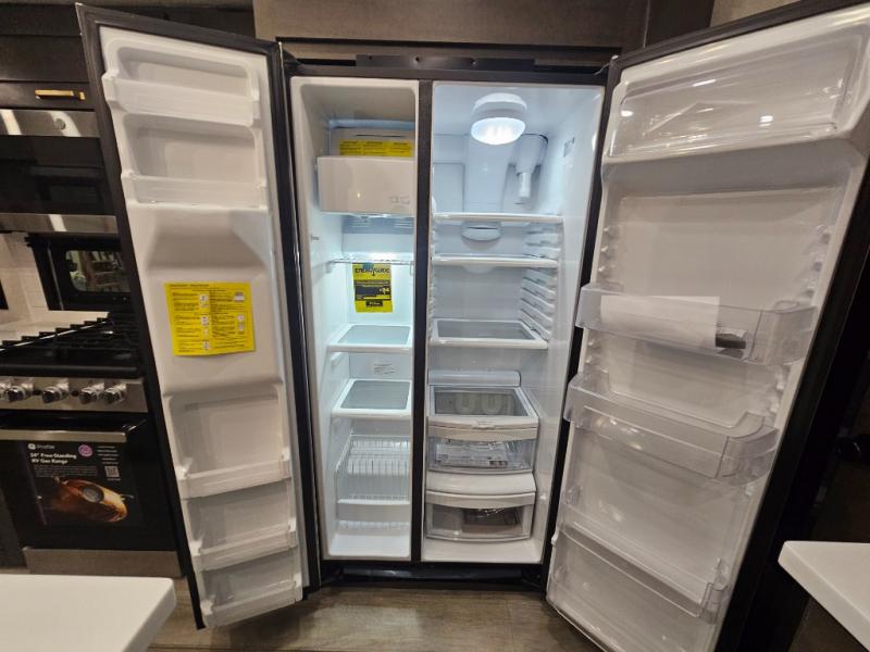 At the front of the unit, the spacious main bedroom offers a 72" x 80" king bed, providing ample room to relax and unwind. A wardrobe with drawers and a built-in hamper ensures plenty of organized storage for clothing and essentials, while a flip-up dresser across from the bed adds even more convenience. Moving down the hall, you’ll find a full bathroom featuring a large 36" x 48" shower with a built-in seat for added comfort. Toward the rear, the main living area has dual opposing slides that open up the space for maximum comfort and functionality. One slide hosts the fully equipped kitchen, complete with overhead cabinets, a convection microwave with built-in air fryer, a 24" range, and a 21-cu. ft. residential refrigerator, everything you need to cook in comfort. The central kitchen island features a residential “Do-It-All” sink with a pull-out faucet, glass rinse, vegetable rinse, and a pull-out cutting board for easy meal prep, while the corner pantry provides generous storage. Opposite the kitchen, you can relax in the theater seating or enjoy meals at the roll-out table. At the rear, a 78" hide-a-bed sofa offers additional lounging space or converts into extra-sleeping accommodations when needed.