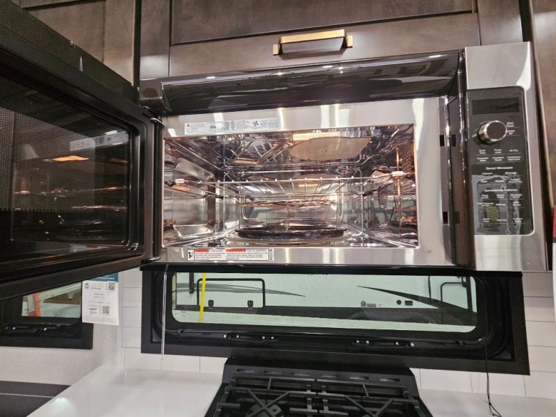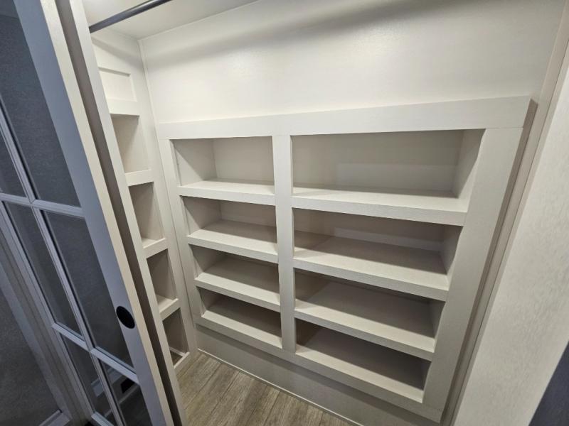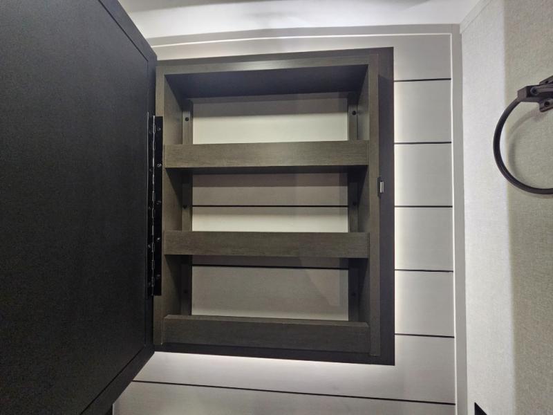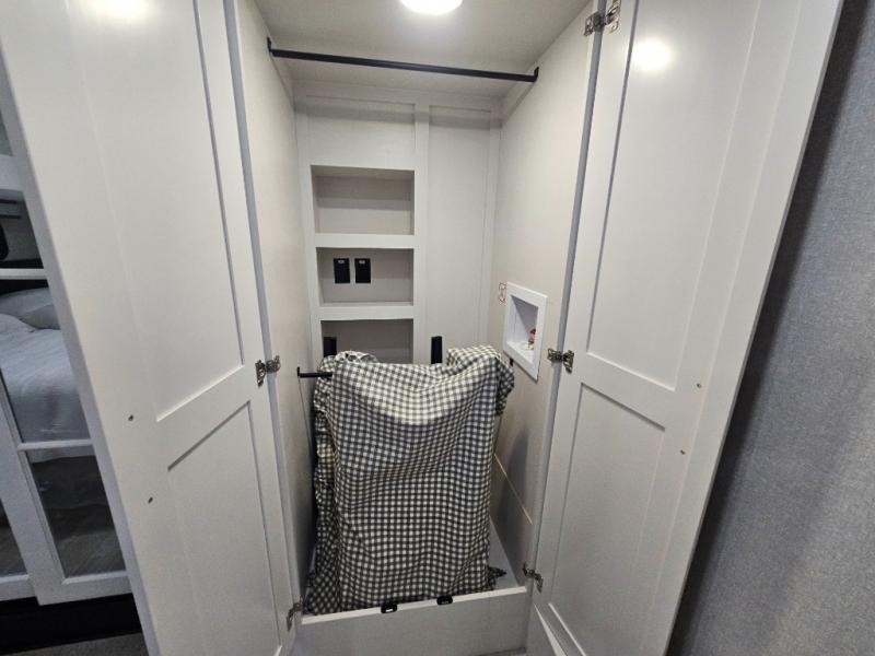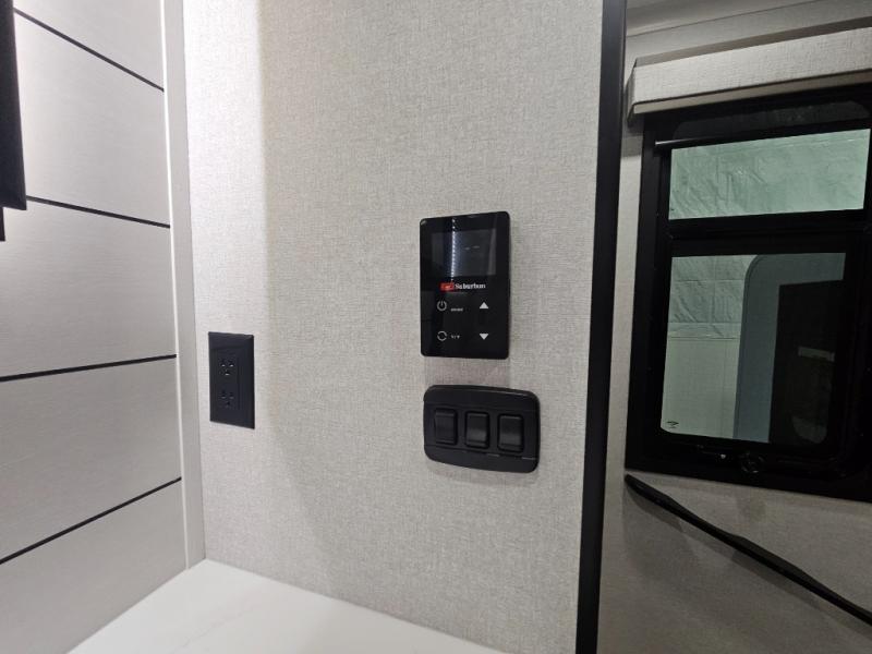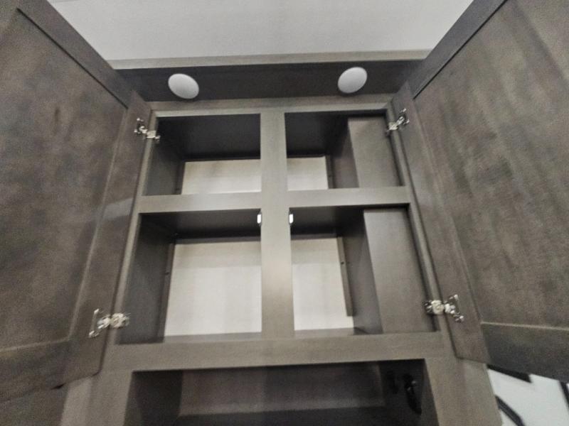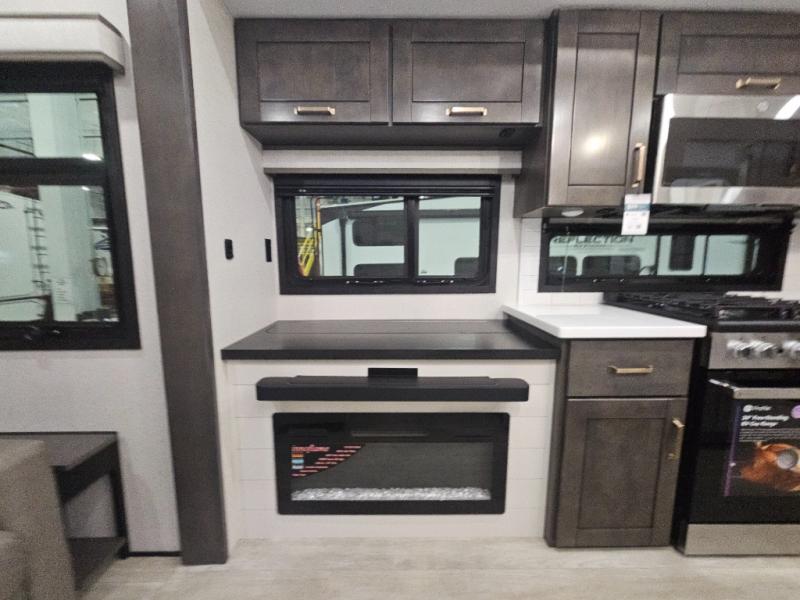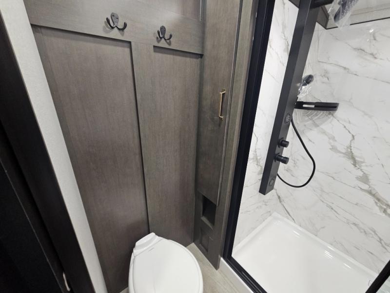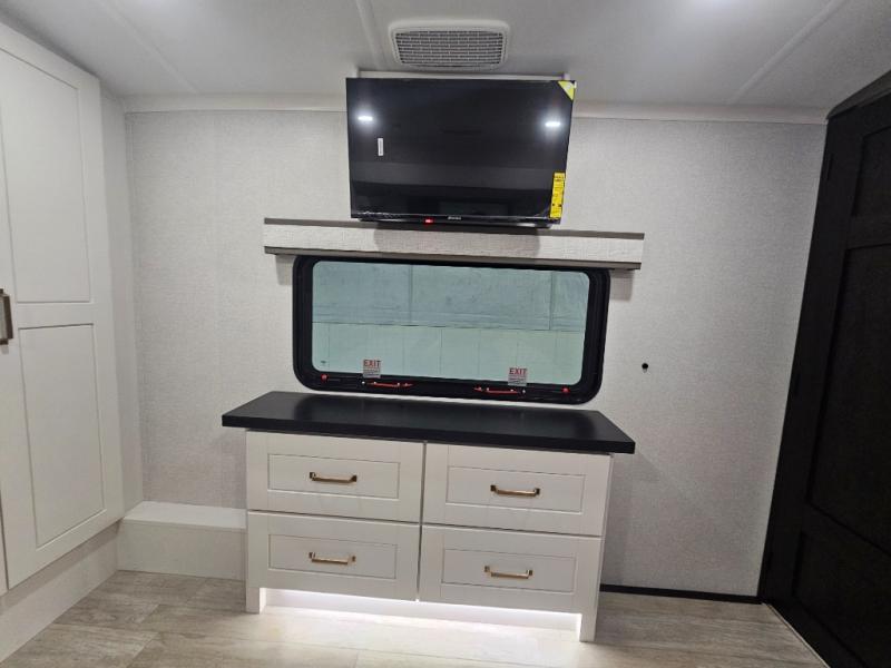 At the front of the unit, the spacious main bedroom offers a 72" x 80" king bed, providing ample room to relax and unwind. A wardrobe with drawers and a built-in hamper ensures plenty of organized storage for clothing and essentials, while a flip-up dresser across from the bed adds even more convenience. Moving down the hall, you’ll find a full bathroom featuring a large 36" x 48" shower with a built-in seat for added comfort. Toward the rear, the main living area has dual opposing slides that open up the space for maximum comfort and functionality. One slide hosts the fully equipped kitchen, complete with overhead cabinets, a convection microwave with built-in air fryer, a 24" range, and a 21-cu. ft. residential refrigerator, everything you need to cook in comfort. The central kitchen island features a residential “Do-It-All” sink with a pull-out faucet, glass rinse, vegetable rinse, and a pull-out cutting board for easy meal prep, while the corner pantry provides generous storage. Opposite the kitchen, you can relax in the theater seating or enjoy meals at the roll-out table. At the rear, a 78" hide-a-bed sofa offers additional lounging space or converts into extra-sleeping accommodations when needed.