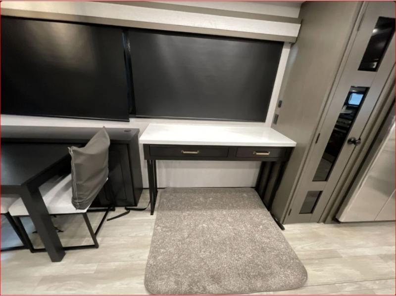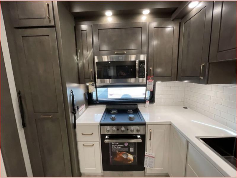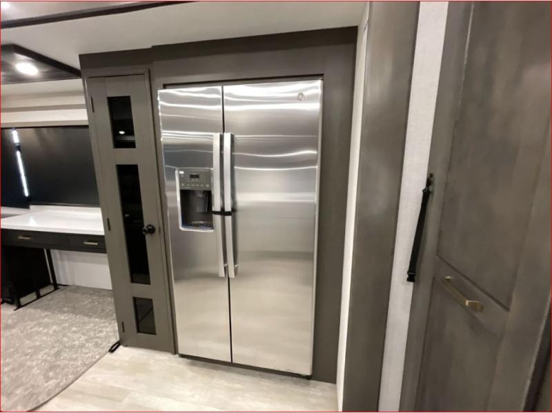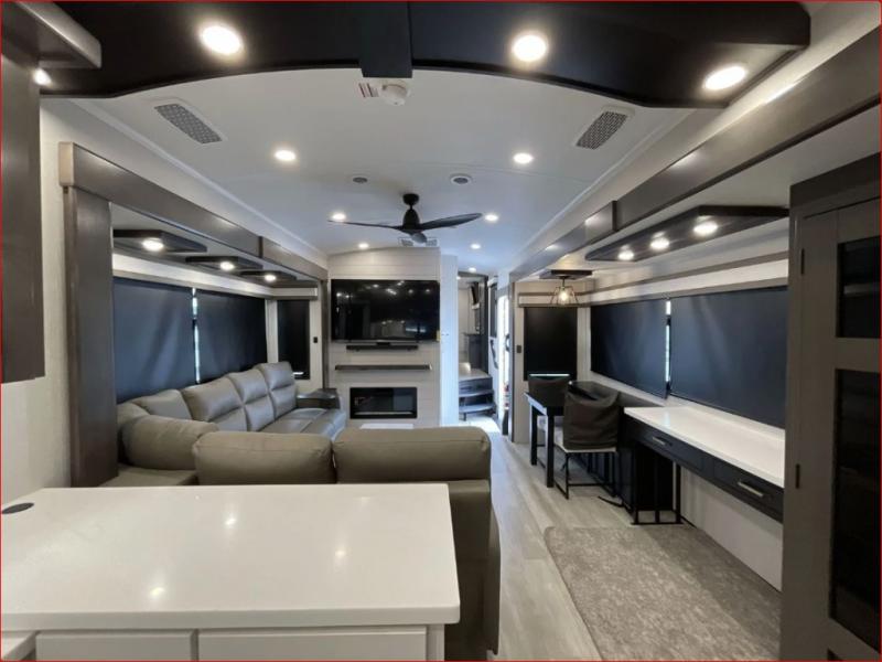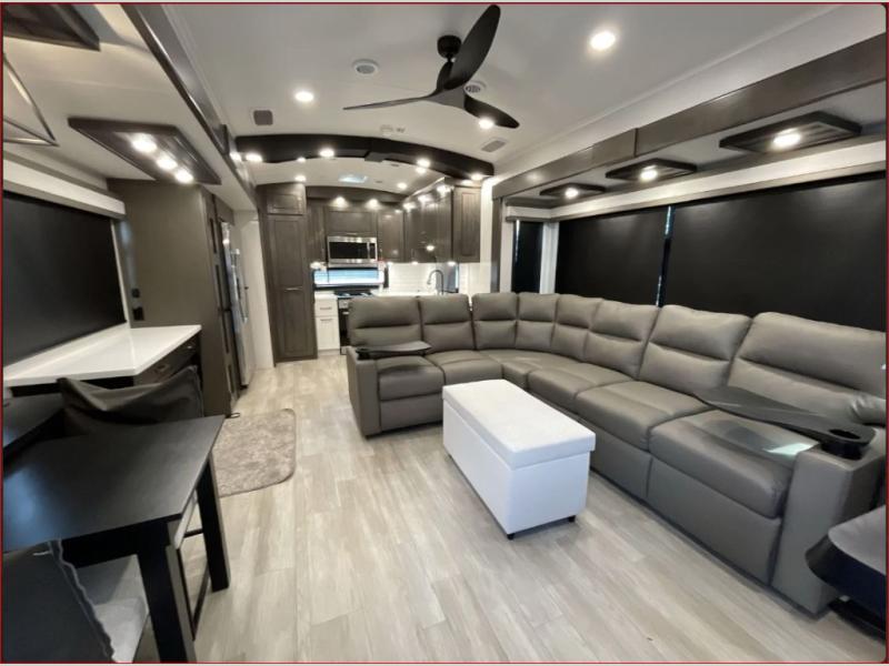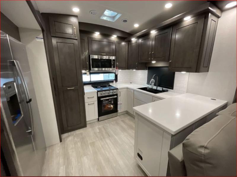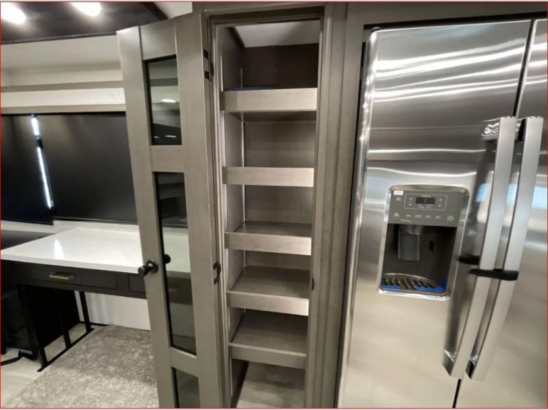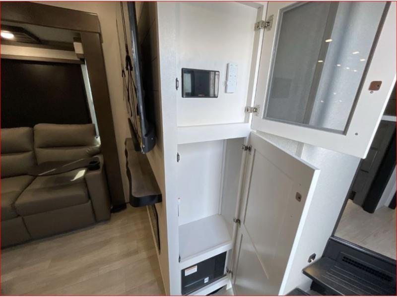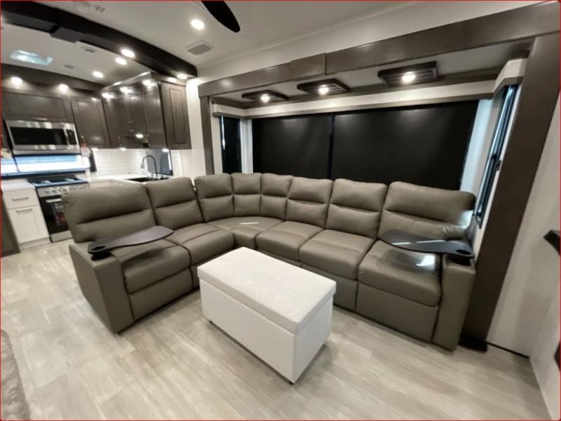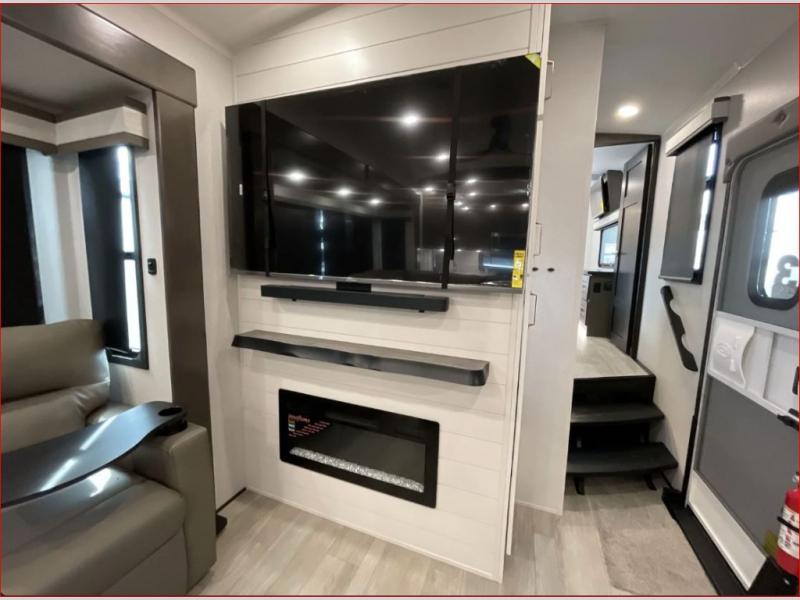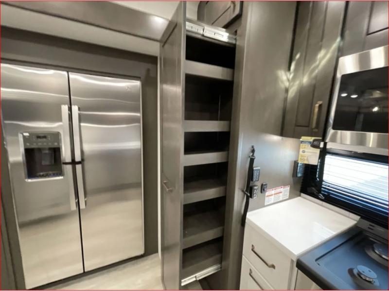 At the front of the 36RK model we have the spacious bedroom featuring a luxurious 72" x 80" king bed, providing ample room to relax and unwind after a long day. A wardrobe and dresser, complete with a TV mounted above, offer generous storage for clothing and personal essentials. Moving down the hall, the full bathroom includes a large 36" x 48" shower with a built-in seat for added comfort, as well as a linen closet for convenient storage. Toward the center and rear of the unit, the open living area expands with dual opposing slides, creating an inviting and comfortable space. One slide houses a 100" L-shaped sofa and theater seating across from the entertainment center with a cozy fireplace, perfect for relaxing evenings. The opposite slide features a pull-out table ideal for dining or game nights, alongside a versatile desk and coffee bar. This same slide also includes a 21-cu. ft. residential refrigerator and a shelved pantry for effortless organization. At the very rear, the U-shaped kitchen is designed for function and style, boasting solid-surface countertops, abundant overhead cabinets, a pull-out pantry, and a pull-out cutting board making meal prep, cooking, and snacking both easy and enjoyable.