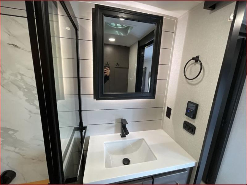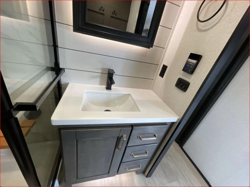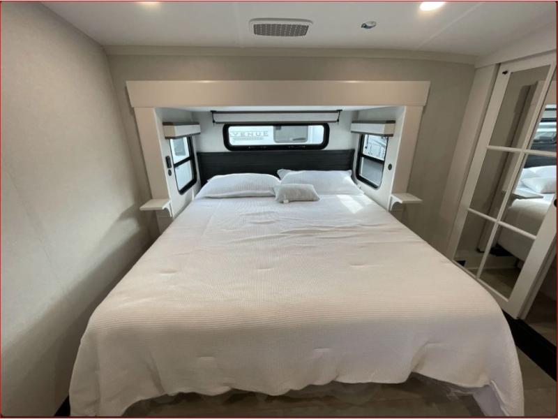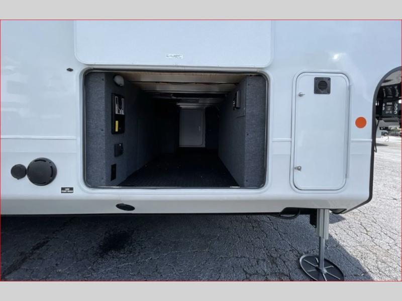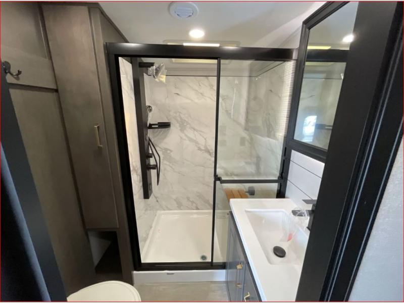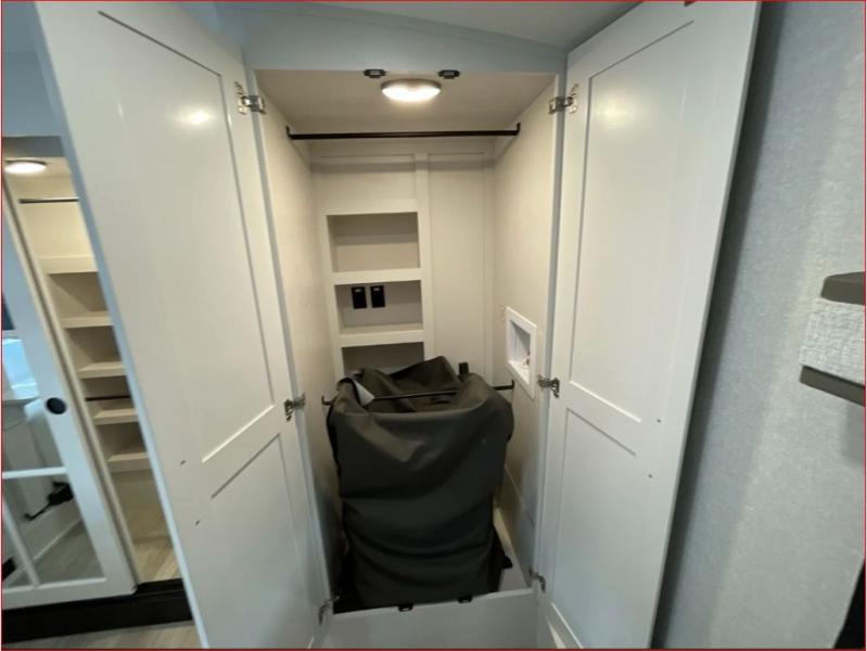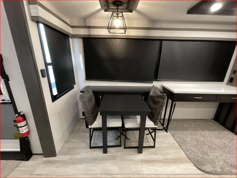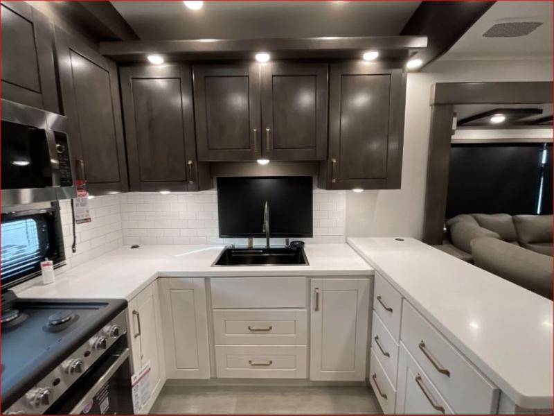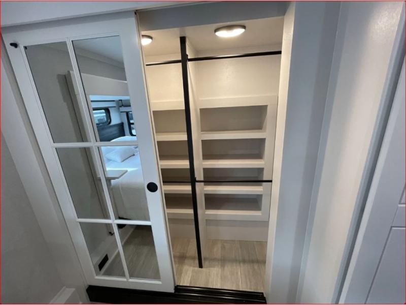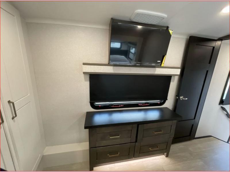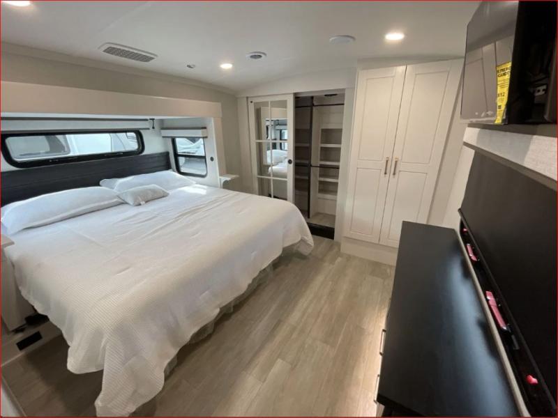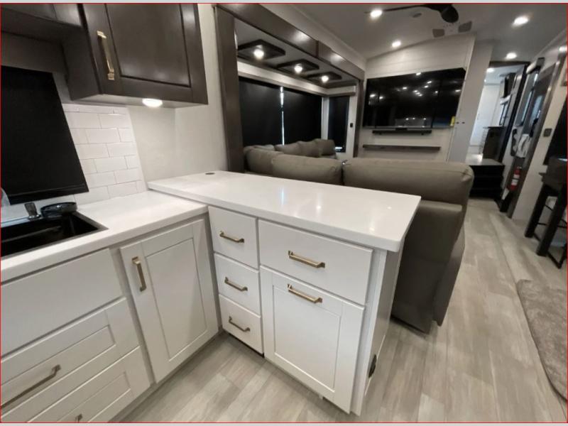 At the front of the 36RK model we have the spacious bedroom featuring a luxurious 72" x 80" king bed, providing ample room to relax and unwind after a long day. A wardrobe and dresser, complete with a TV mounted above, offer generous storage for clothing and personal essentials. Moving down the hall, the full bathroom includes a large 36" x 48" shower with a built-in seat for added comfort, as well as a linen closet for convenient storage. Toward the center and rear of the unit, the open living area expands with dual opposing slides, creating an inviting and comfortable space. One slide houses a 100" L-shaped sofa and theater seating across from the entertainment center with a cozy fireplace, perfect for relaxing evenings. The opposite slide features a pull-out table ideal for dining or game nights, alongside a versatile desk and coffee bar. This same slide also includes a 21-cu. ft. residential refrigerator and a shelved pantry for effortless organization. At the very rear, the U-shaped kitchen is designed for function and style, boasting solid-surface countertops, abundant overhead cabinets, a pull-out pantry, and a pull-out cutting board making meal prep, cooking, and snacking both easy and enjoyable.