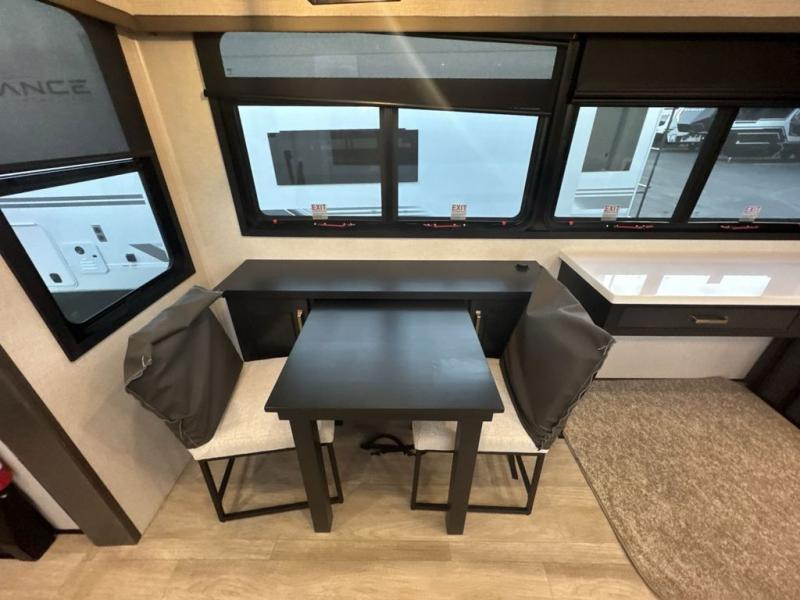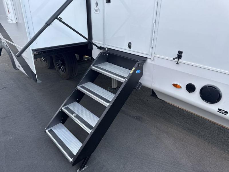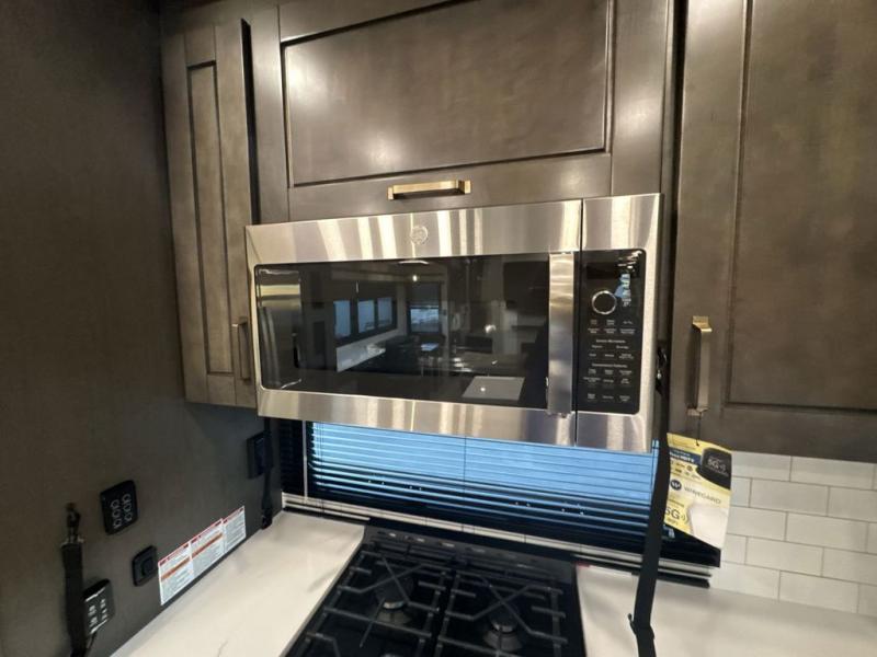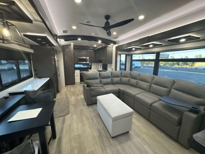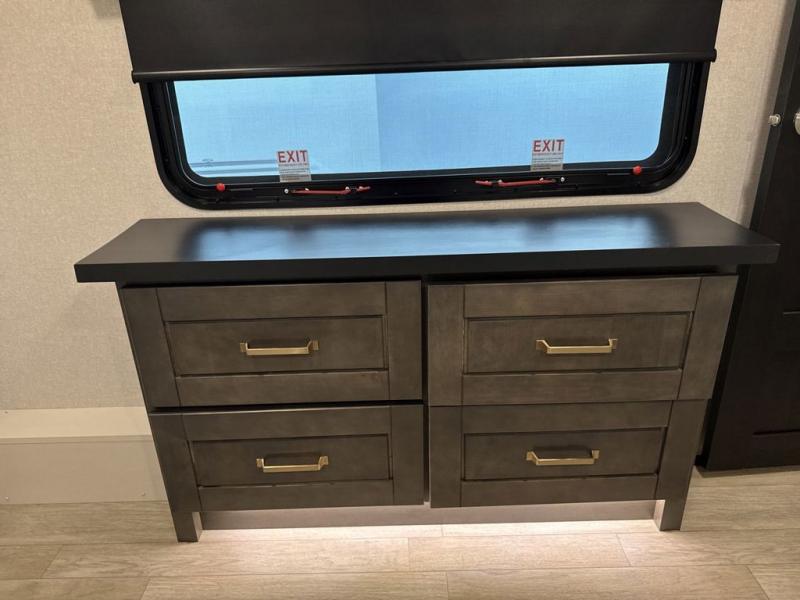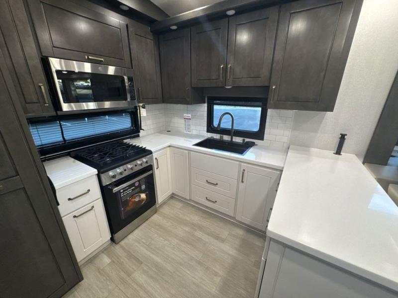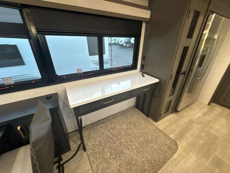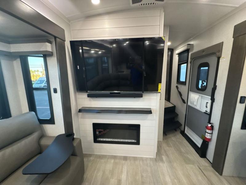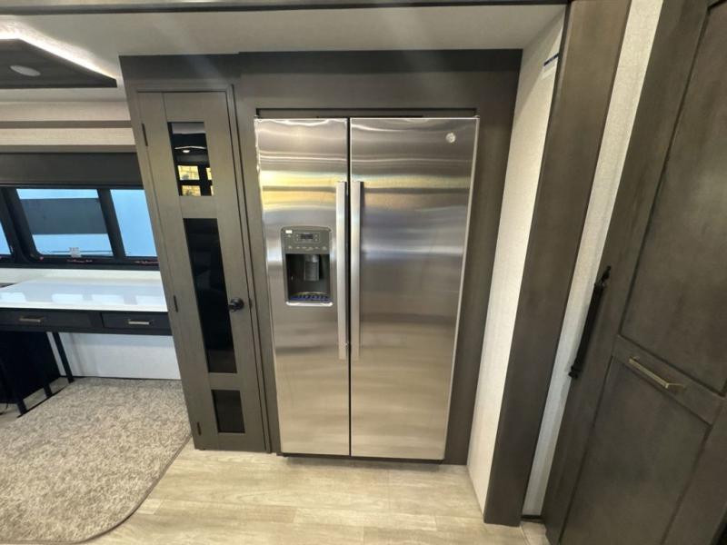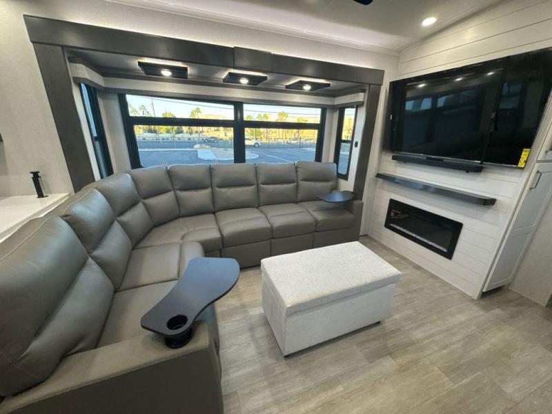 At the front of the 36RK model we have the spacious bedroom featuring a luxurious 72" x 80" king bed, providing ample room to relax and unwind after a long day. A wardrobe and dresser, complete with a TV mounted above, offer generous storage for clothing and personal essentials. Moving down the hall, the full bathroom includes a large 36" x 48" shower with a built-in seat for added comfort, as well as a linen closet for convenient storage. Toward the center and rear of the unit, the open living area expands with dual opposing slides, creating an inviting and comfortable space. One slide houses a 100" L-shaped sofa and theater seating across from the entertainment center with a cozy fireplace, perfect for relaxing evenings. The opposite slide features a pull-out table ideal for dining or game nights, alongside a versatile desk and coffee bar. This same slide also includes a 21-cu. ft. residential refrigerator and a shelved pantry for effortless organization. At the very rear, the U-shaped kitchen is designed for function and style, boasting solid-surface countertops, abundant overhead cabinets, a pull-out pantry, and a pull-out cutting board making meal prep, cooking, and snacking both easy and enjoyable.