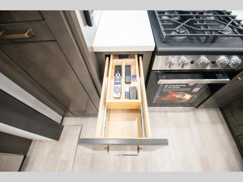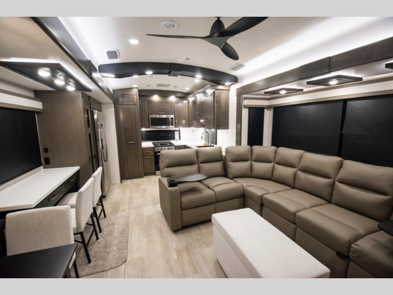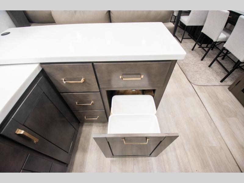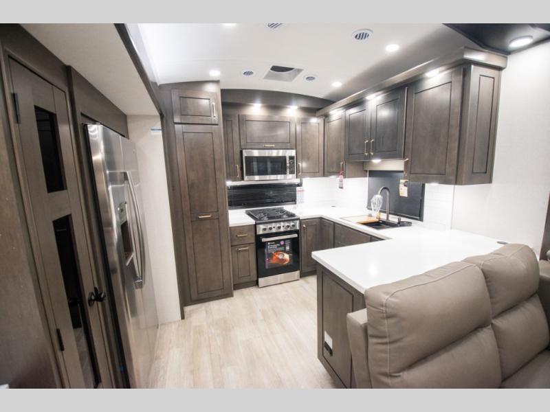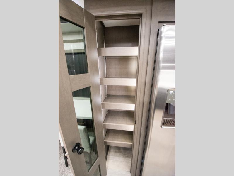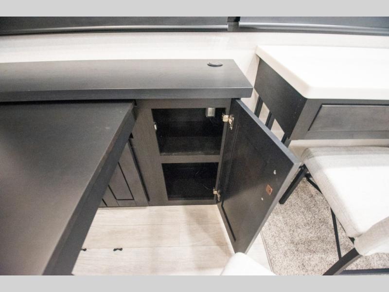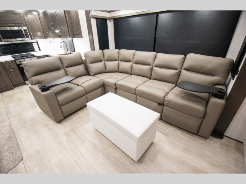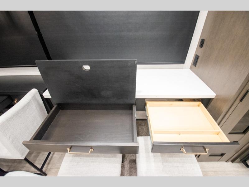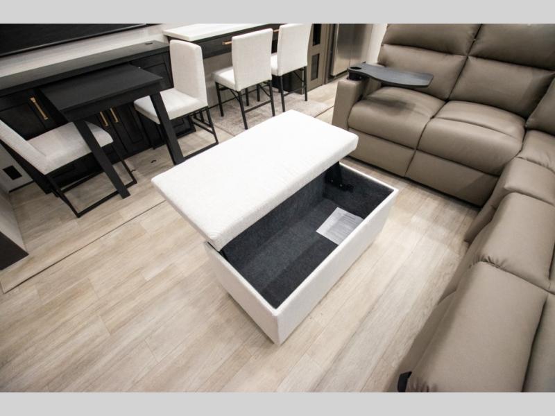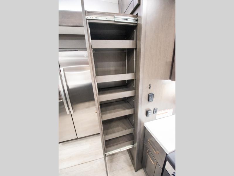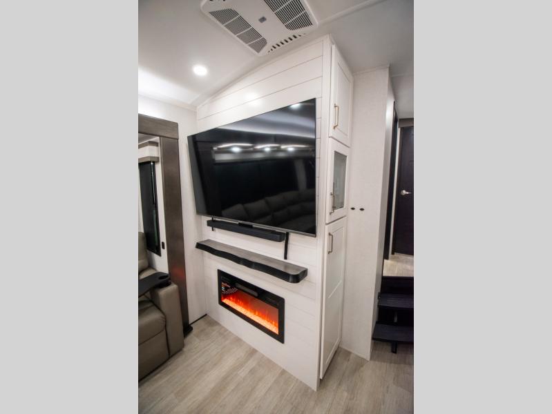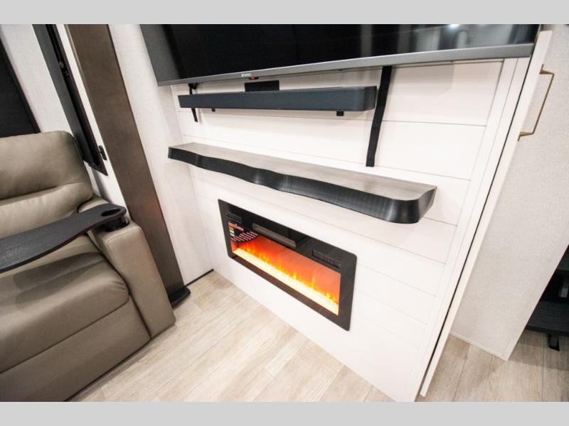 At the front of the 36RK model we have the spacious bedroom featuring a luxurious 72" x 80" king bed, providing ample room to relax and unwind after a long day. A wardrobe and dresser, complete with a TV mounted above, offer generous storage for clothing and personal essentials. Moving down the hall, the full bathroom includes a large 36" x 48" shower with a built-in seat for added comfort, as well as a linen closet for convenient storage. Toward the center and rear of the unit, the open living area expands with dual opposing slides, creating an inviting and comfortable space. One slide houses a 100" L-shaped sofa and theater seating across from the entertainment center with a cozy fireplace, perfect for relaxing evenings. The opposite slide features a pull-out table ideal for dining or game nights, alongside a versatile desk and coffee bar. This same slide also includes a 21-cu. ft. residential refrigerator and a shelved pantry for effortless organization. At the very rear, the U-shaped kitchen is designed for function and style, boasting solid-surface countertops, abundant overhead cabinets, a pull-out pantry, and a pull-out cutting board making meal prep, cooking, and snacking both easy and enjoyable.