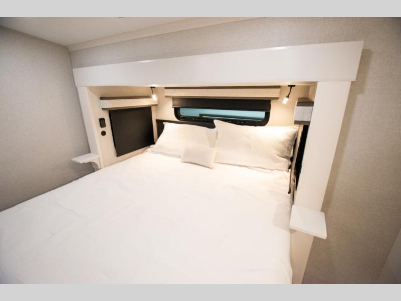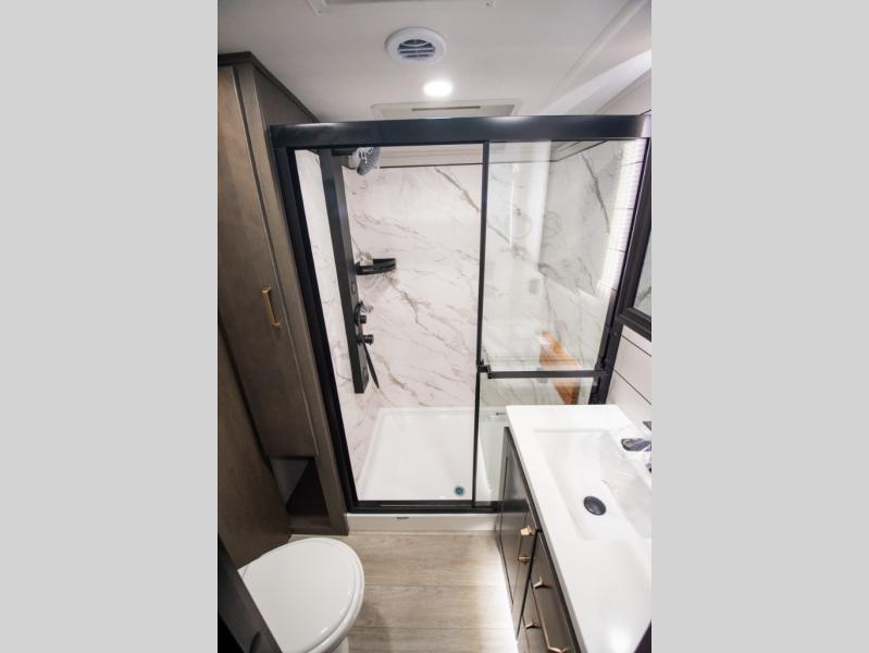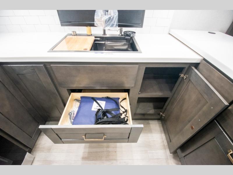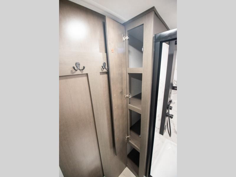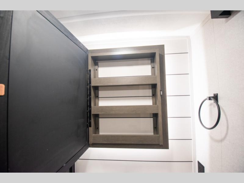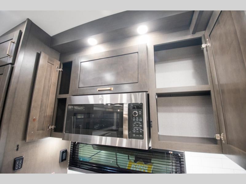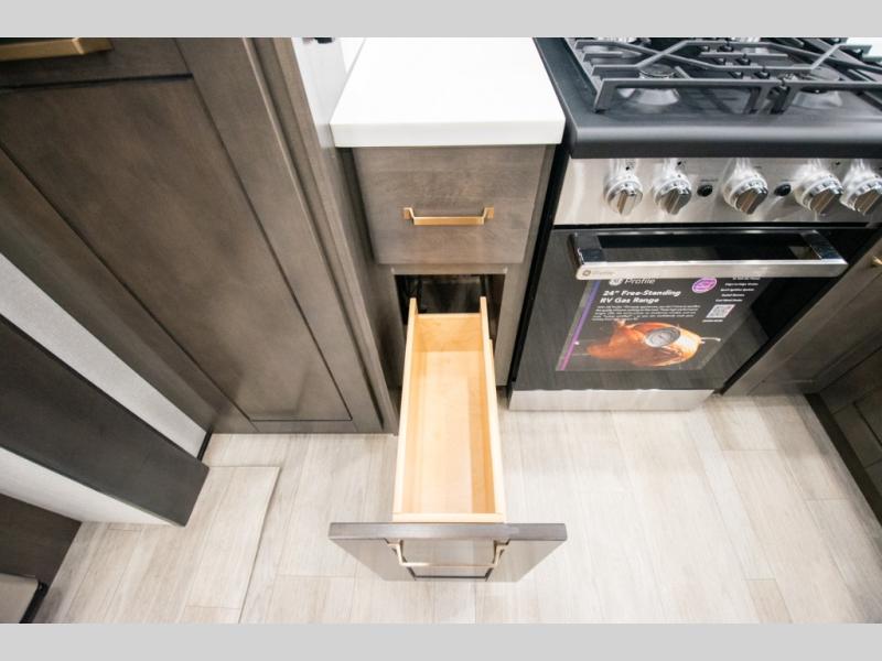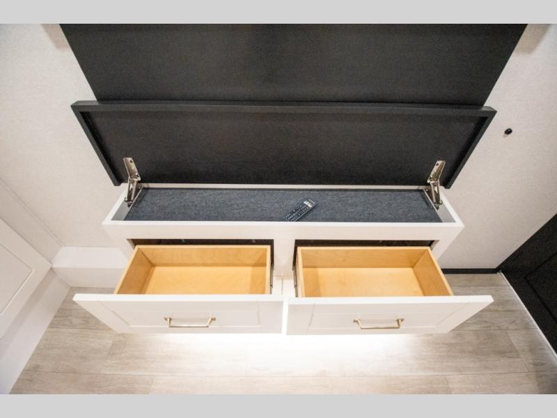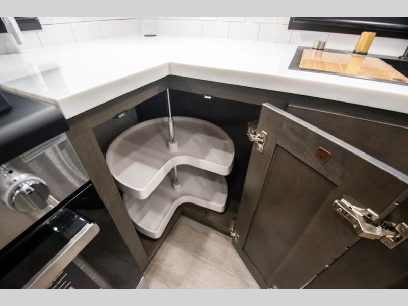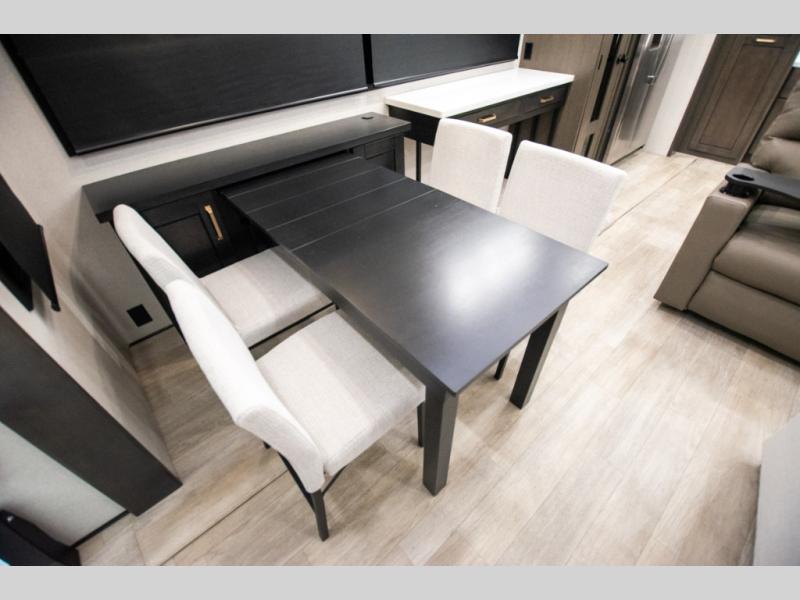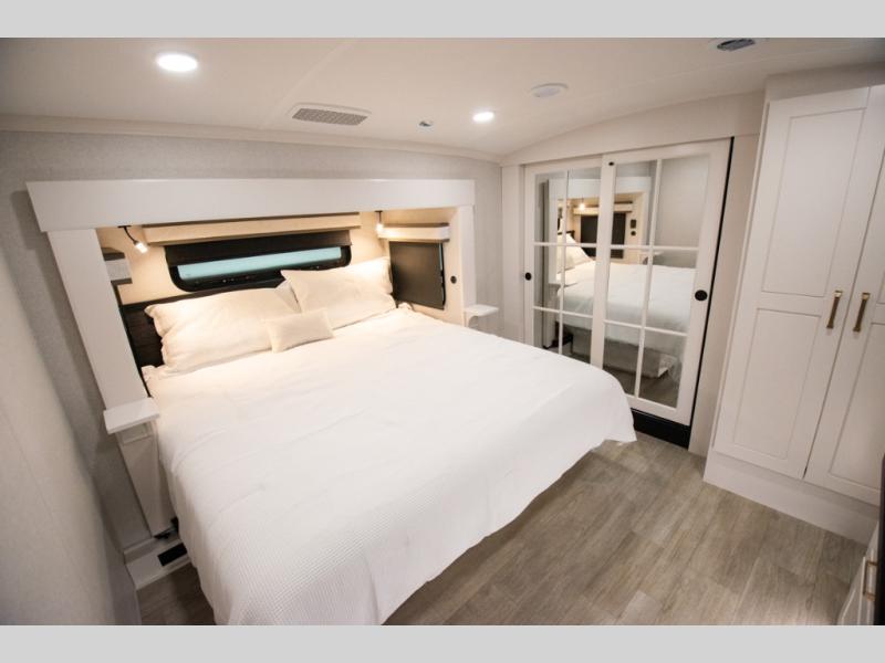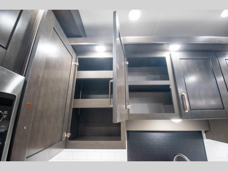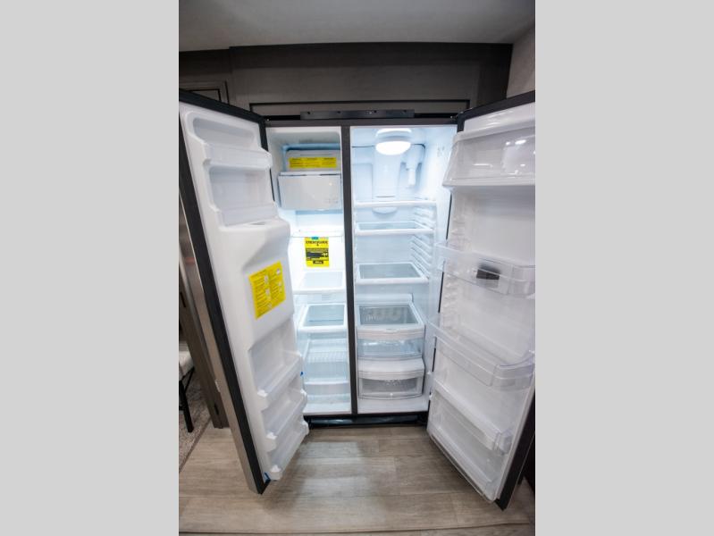 At the front of the 36RK model we have the spacious bedroom featuring a luxurious 72" x 80" king bed, providing ample room to relax and unwind after a long day. A wardrobe and dresser, complete with a TV mounted above, offer generous storage for clothing and personal essentials. Moving down the hall, the full bathroom includes a large 36" x 48" shower with a built-in seat for added comfort, as well as a linen closet for convenient storage. Toward the center and rear of the unit, the open living area expands with dual opposing slides, creating an inviting and comfortable space. One slide houses a 100" L-shaped sofa and theater seating across from the entertainment center with a cozy fireplace, perfect for relaxing evenings. The opposite slide features a pull-out table ideal for dining or game nights, alongside a versatile desk and coffee bar. This same slide also includes a 21-cu. ft. residential refrigerator and a shelved pantry for effortless organization. At the very rear, the U-shaped kitchen is designed for function and style, boasting solid-surface countertops, abundant overhead cabinets, a pull-out pantry, and a pull-out cutting board making meal prep, cooking, and snacking both easy and enjoyable.