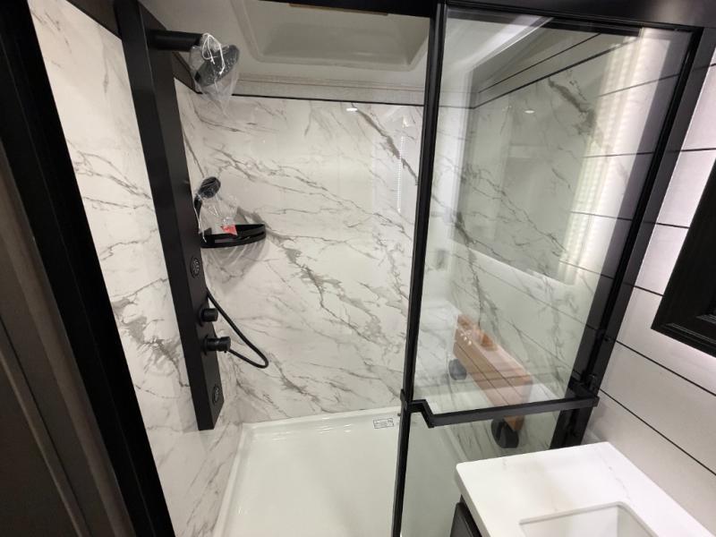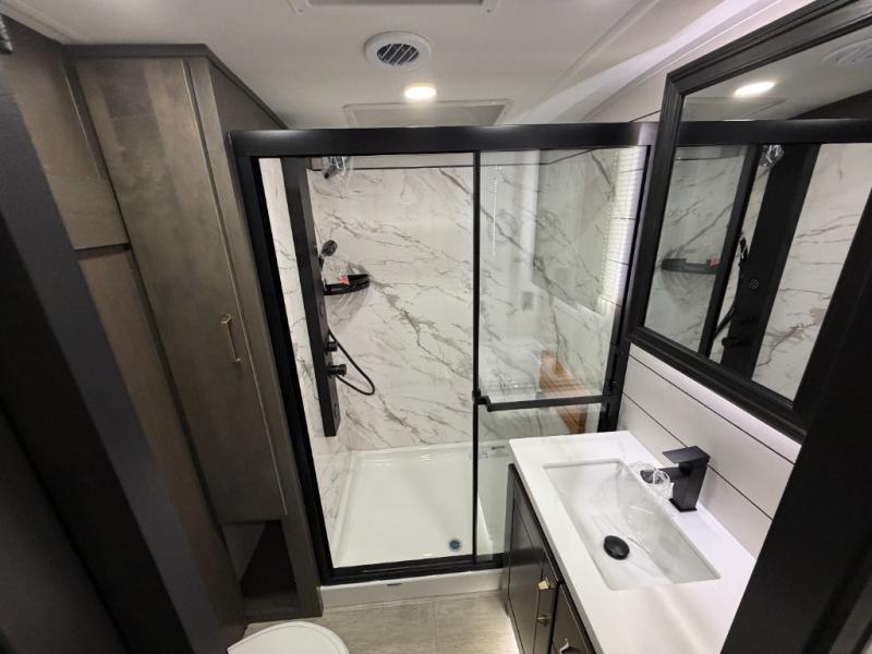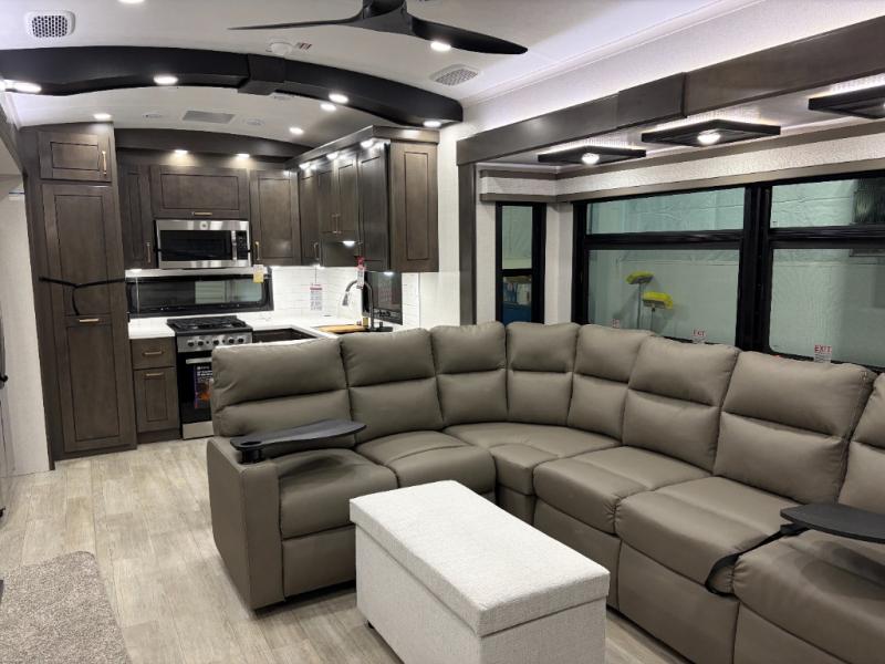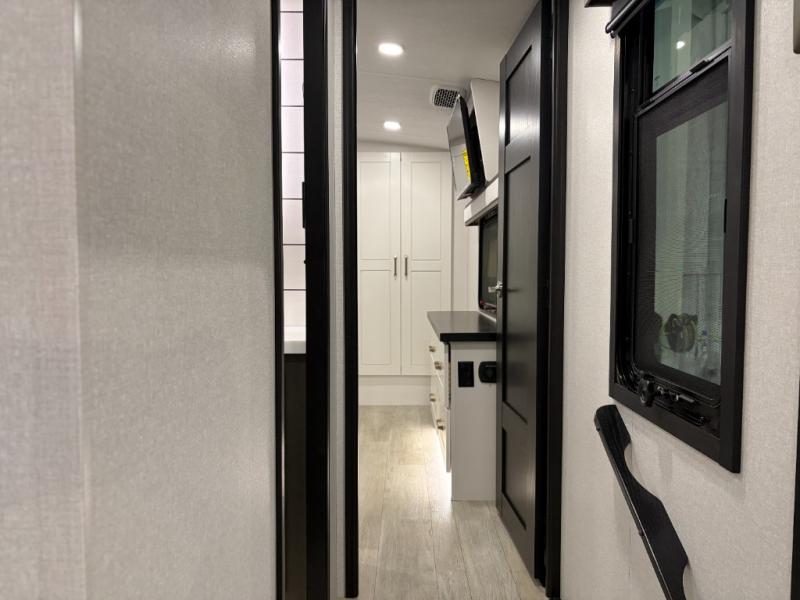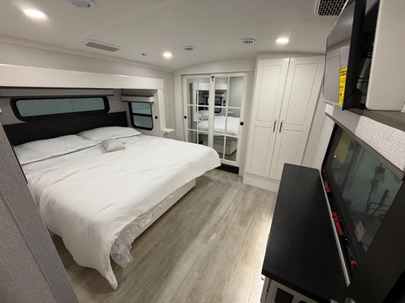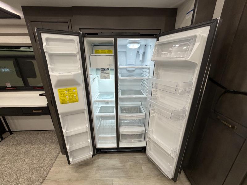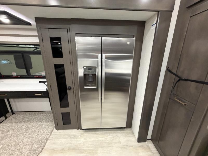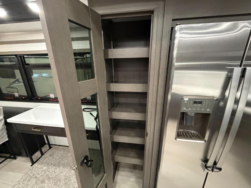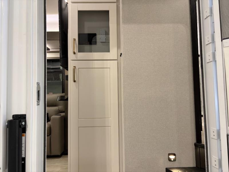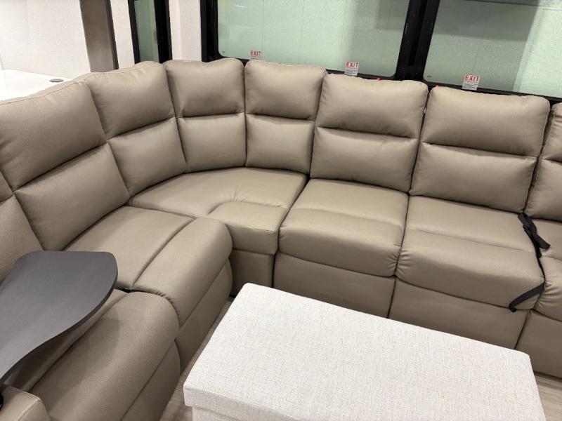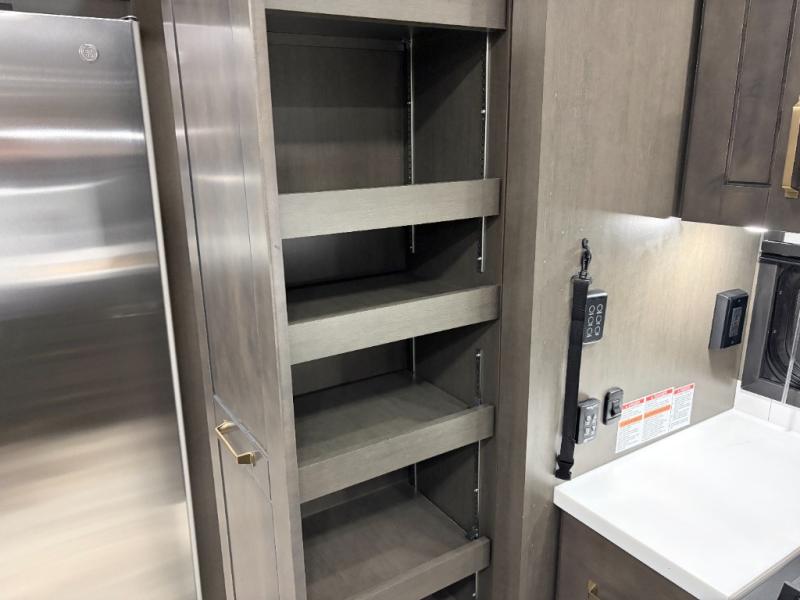 At the front of the 36RK model we have the spacious bedroom featuring a luxurious 72" x 80" king bed, providing ample room to relax and unwind after a long day. A wardrobe and dresser, complete with a TV mounted above, offer generous storage for clothing and personal essentials. Moving down the hall, the full bathroom includes a large 36" x 48" shower with a built-in seat for added comfort, as well as a linen closet for convenient storage. Toward the center and rear of the unit, the open living area expands with dual opposing slides, creating an inviting and comfortable space. One slide houses a 100" L-shaped sofa and theater seating across from the entertainment center with a cozy fireplace, perfect for relaxing evenings. The opposite slide features a pull-out table ideal for dining or game nights, alongside a versatile desk and coffee bar. This same slide also includes a 21-cu. ft. residential refrigerator and a shelved pantry for effortless organization. At the very rear, the U-shaped kitchen is designed for function and style, boasting solid-surface countertops, abundant overhead cabinets, a pull-out pantry, and a pull-out cutting board making meal prep, cooking, and snacking both easy and enjoyable.