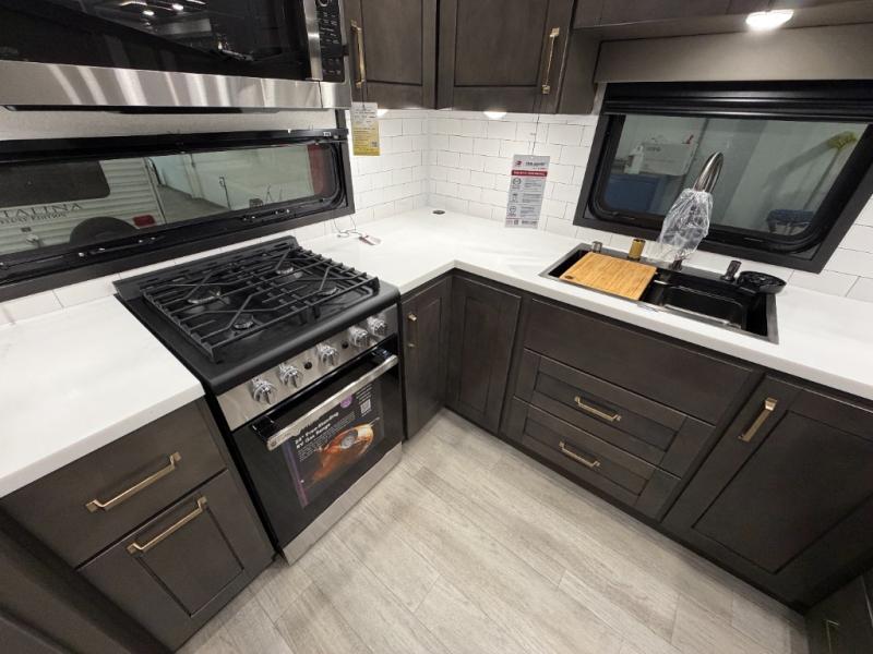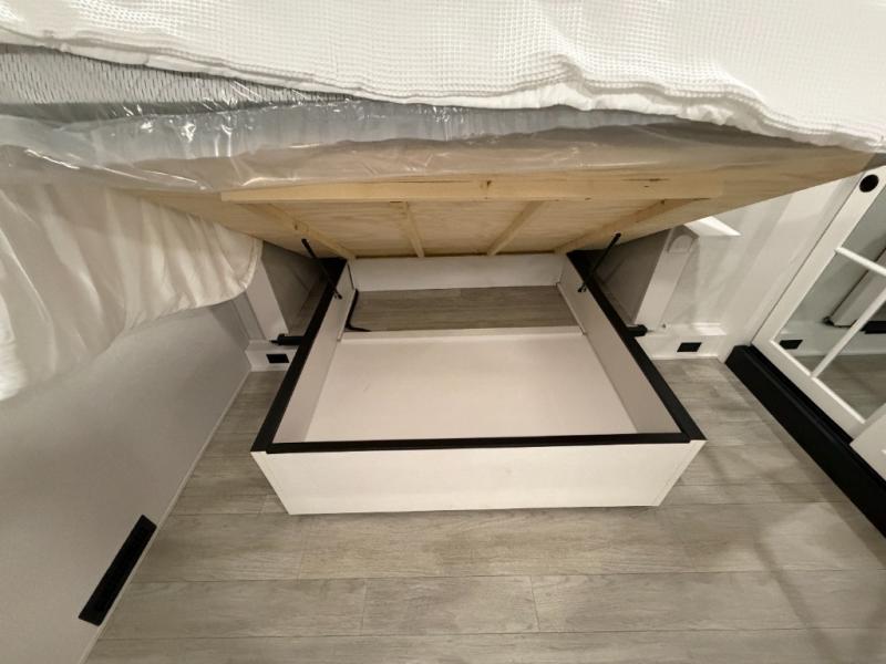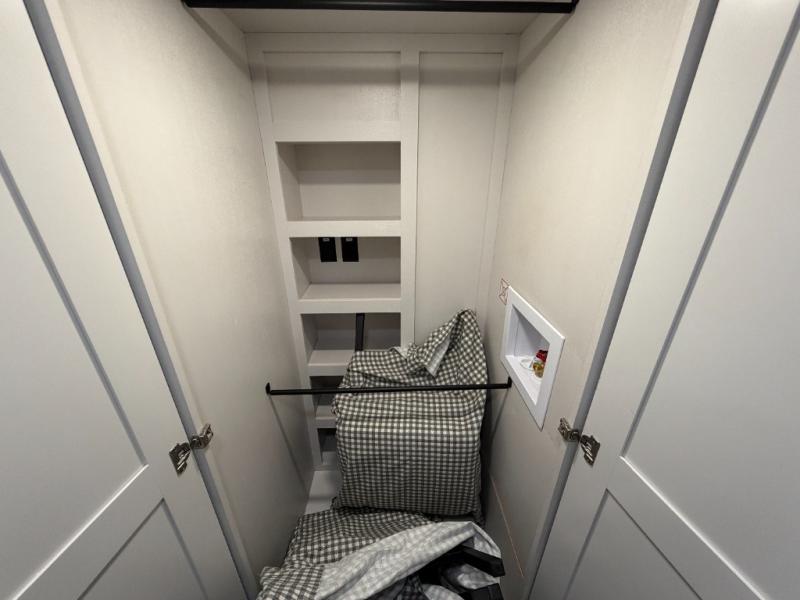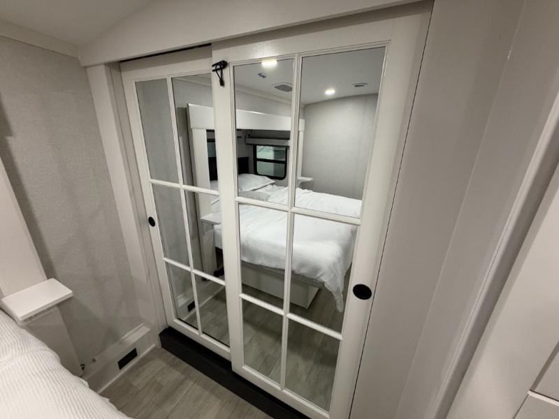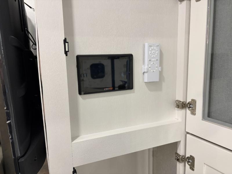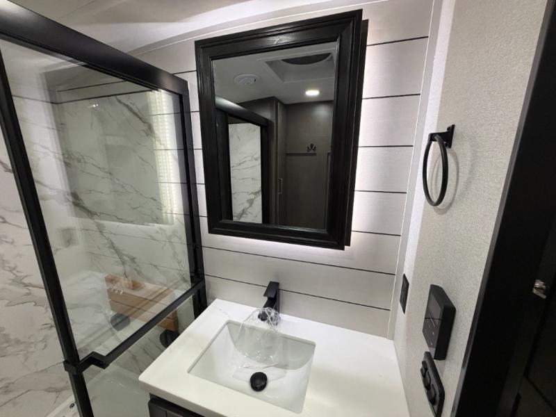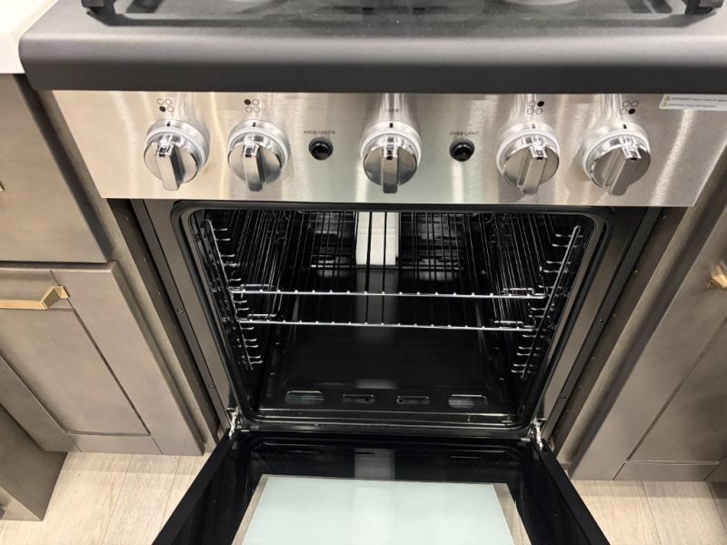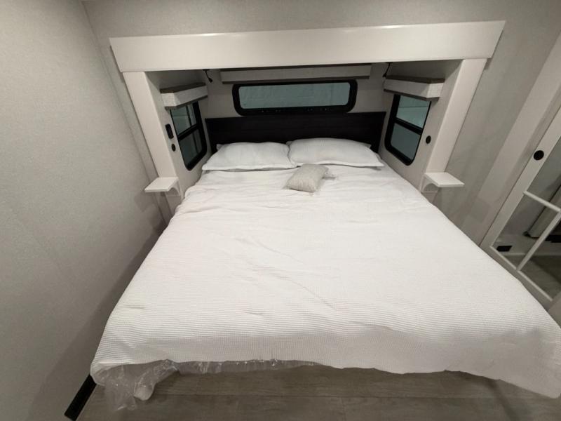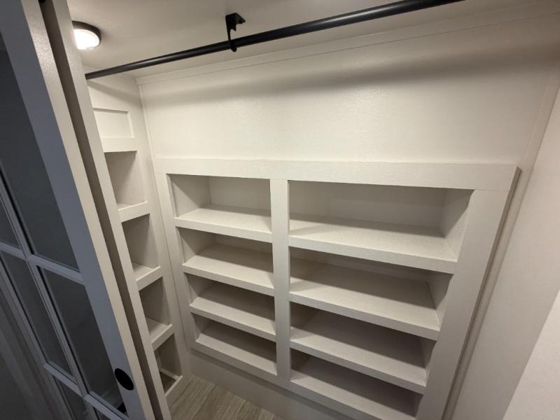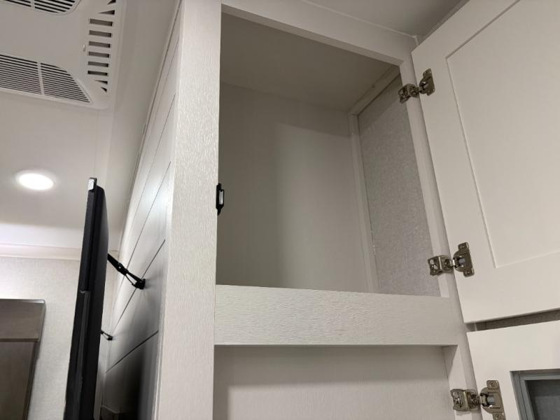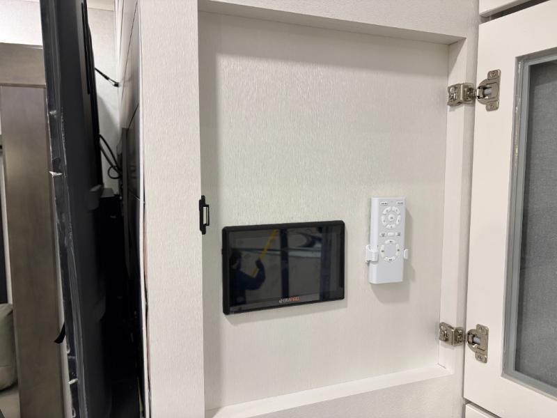 At the front of the 36RK model we have the spacious bedroom featuring a luxurious 72" x 80" king bed, providing ample room to relax and unwind after a long day. A wardrobe and dresser, complete with a TV mounted above, offer generous storage for clothing and personal essentials. Moving down the hall, the full bathroom includes a large 36" x 48" shower with a built-in seat for added comfort, as well as a linen closet for convenient storage. Toward the center and rear of the unit, the open living area expands with dual opposing slides, creating an inviting and comfortable space. One slide houses a 100" L-shaped sofa and theater seating across from the entertainment center with a cozy fireplace, perfect for relaxing evenings. The opposite slide features a pull-out table ideal for dining or game nights, alongside a versatile desk and coffee bar. This same slide also includes a 21-cu. ft. residential refrigerator and a shelved pantry for effortless organization. At the very rear, the U-shaped kitchen is designed for function and style, boasting solid-surface countertops, abundant overhead cabinets, a pull-out pantry, and a pull-out cutting board making meal prep, cooking, and snacking both easy and enjoyable.