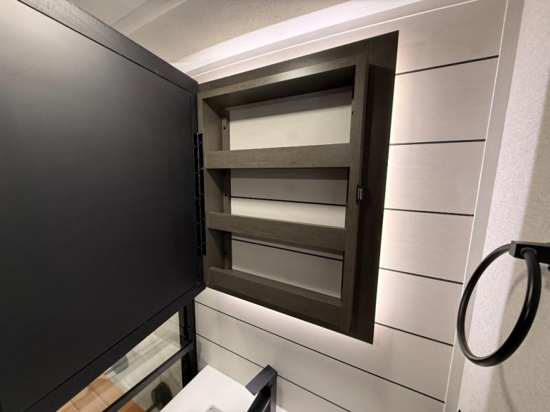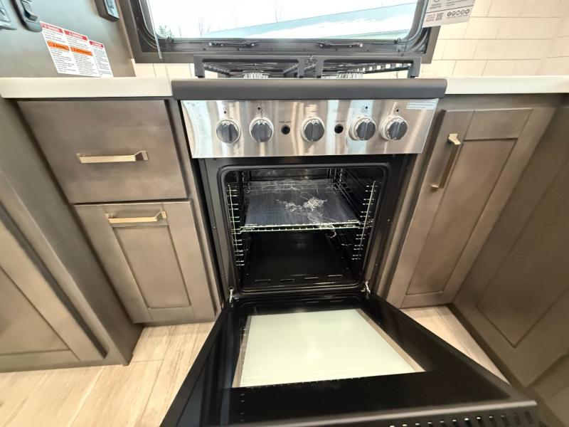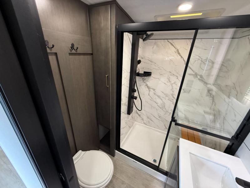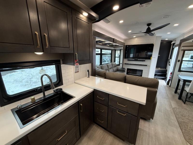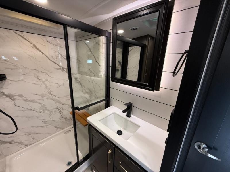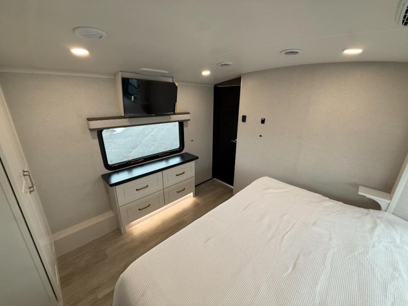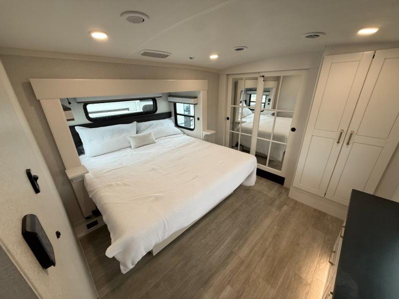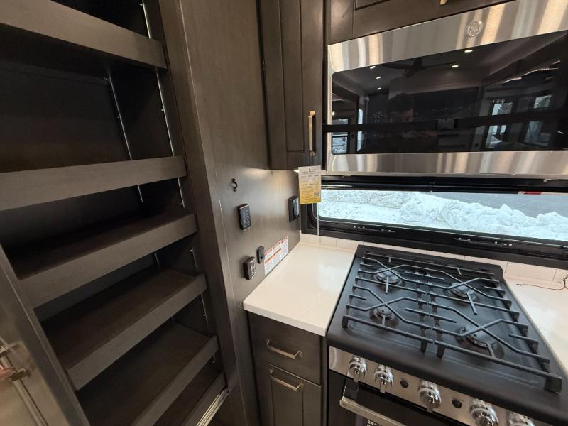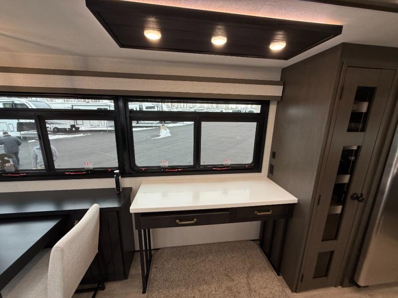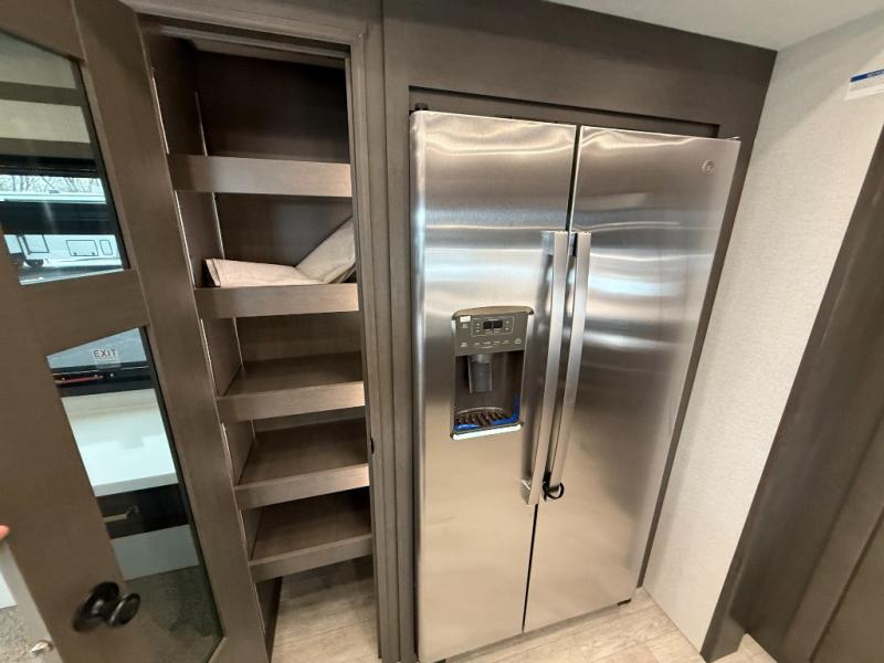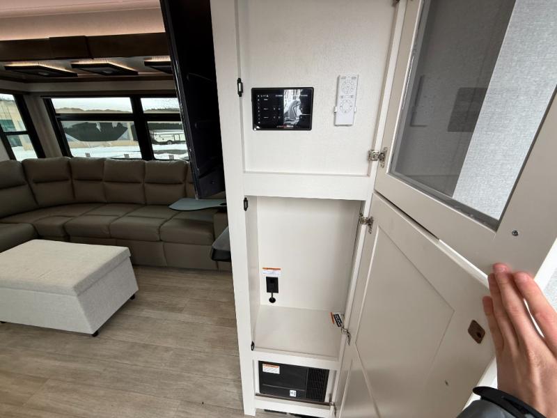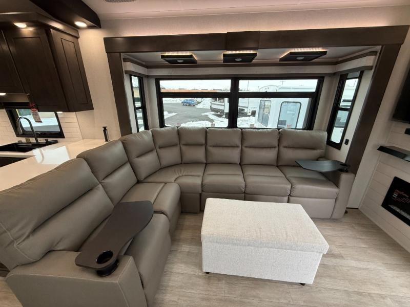 At the front of the 36RK model we have the spacious bedroom featuring a luxurious 72" x 80" king bed, providing ample room to relax and unwind after a long day. A wardrobe and dresser, complete with a TV mounted above, offer generous storage for clothing and personal essentials. Moving down the hall, the full bathroom includes a large 36" x 48" shower with a built-in seat for added comfort, as well as a linen closet for convenient storage. Toward the center and rear of the unit, the open living area expands with dual opposing slides, creating an inviting and comfortable space. One slide houses a 100" L-shaped sofa and theater seating across from the entertainment center with a cozy fireplace, perfect for relaxing evenings. The opposite slide features a pull-out table ideal for dining or game nights, alongside a versatile desk and coffee bar. This same slide also includes a 21-cu. ft. residential refrigerator and a shelved pantry for effortless organization. At the very rear, the U-shaped kitchen is designed for function and style, boasting solid-surface countertops, abundant overhead cabinets, a pull-out pantry, and a pull-out cutting board making meal prep, cooking, and snacking both easy and enjoyable.
