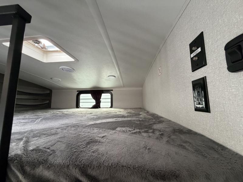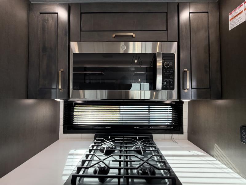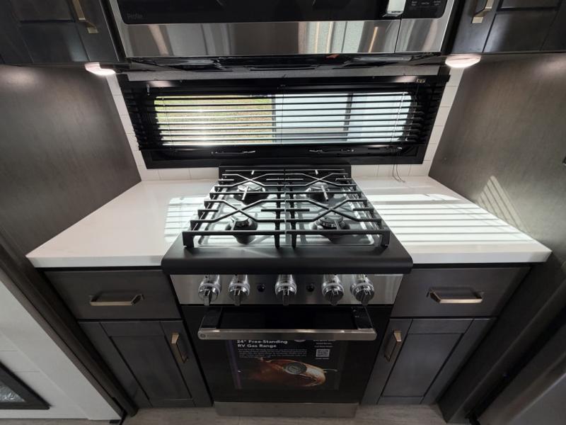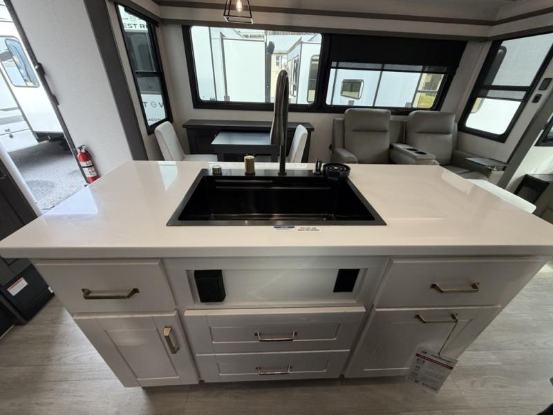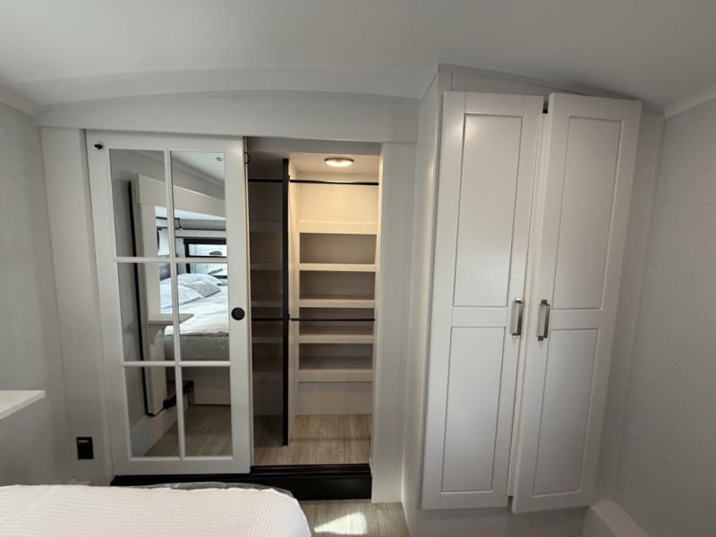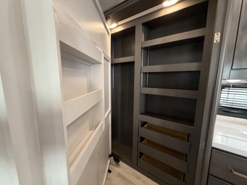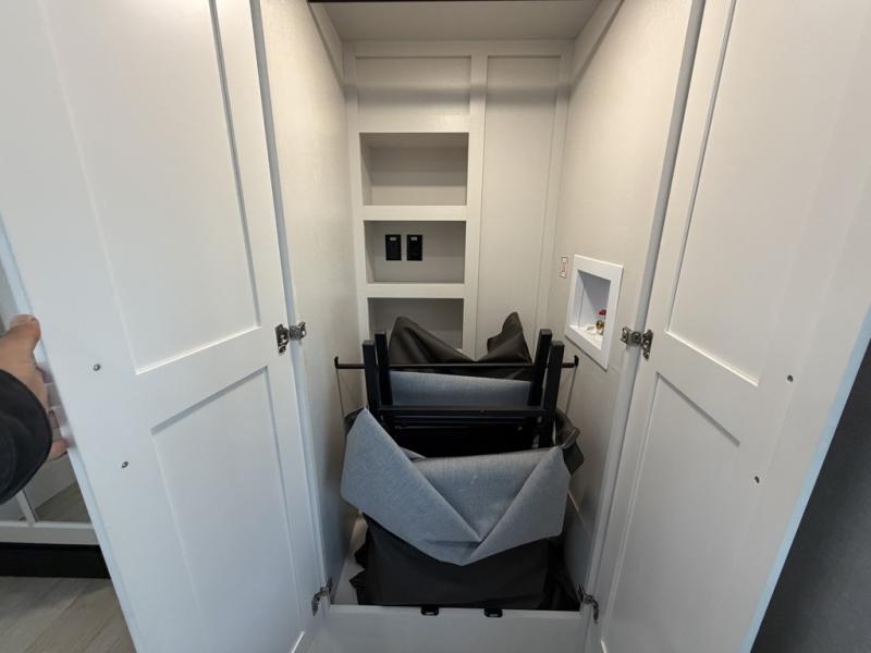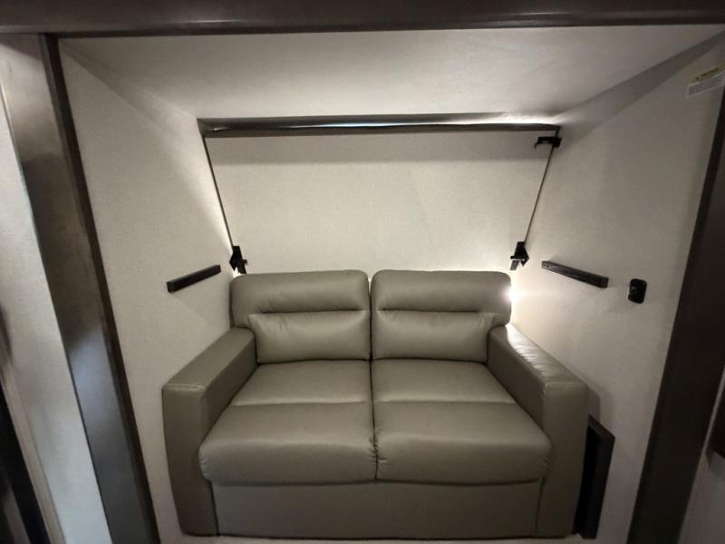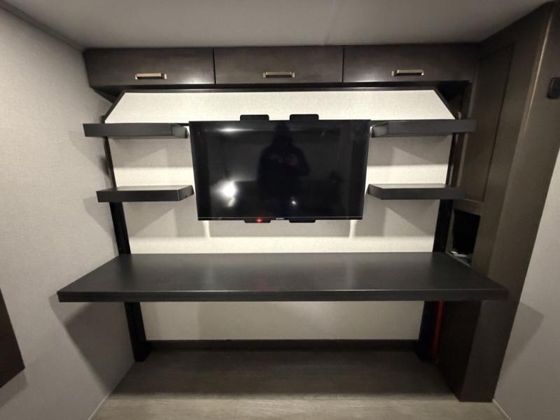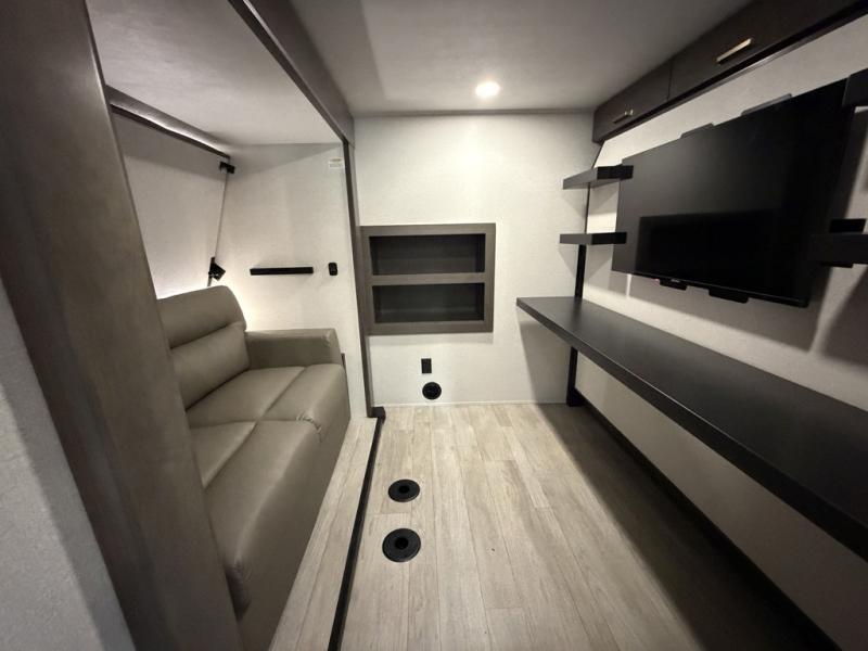 At the front of the unit, the private bedroom offers a retreat with a spacious 72" x 80" king bed, a wardrobe with drawers and a built-in hamper, and a dresser with a TV above, providing ample storage for clothing and essentials. Down the hall, the full bathroom features a 36" x 48" shower with a comfortable seat for added accessibility and relaxation. At the center of the unit, the versatile den serves perfectly as both an office and an additional sleeping area. It includes a 60" tri-fold sofa with a flip-up bunk above, a removable table for work or leisure, and across the room, a 60" x 74" Murphy bed complemented by a desk, shelves, and even a loft above, ideal for accommodating guests or creating a productive workspace on the road. Toward the rear, the open concept living area expands with dual opposing slides for a spacious and inviting atmosphere. One slide features the fully equipped kitchen with a hidden pantry, shelving for dry goods, a convection microwave with a built-in air fryer, a 21-cu. ft. refrigerator, and a 24" range. At the center, the kitchen island includes a sink and a pull-out cutting board, making meal prep both easy and enjoyable. Opposite the kitchen, you’ll find a theater seat and a roll-top dining table perfect for lounging or dining, while at the very back, a 78" sofa provides extra seating or converts into additional sleeping space when needed.