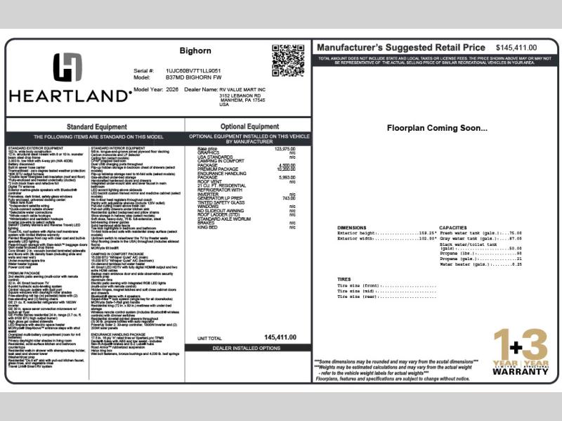 Built with precision and designed for comfort, the Heartland Bighorn fifth wheels combine rugged construction with residential luxury. Its 102-inch-wide body design delivers exceptional interior space, while the CoreShield Walls with 2-inch vacuum-bonded laminated sidewalls and high-density foam insulation provide superior strength, durability, and climate control. The ThermaShield zero-degree tested insulation package, features a fully enclosed, heated underbelly and double-layer fiberglass batt insulation, keeps you comfortable in different climates, from scorching summers to freezing winters. Convenience meets innovation with the pass-through storage featuring Slam-latch baggage doors, offering easy, one-handed access to your gear while maintaining a secure, weather-tight seal.