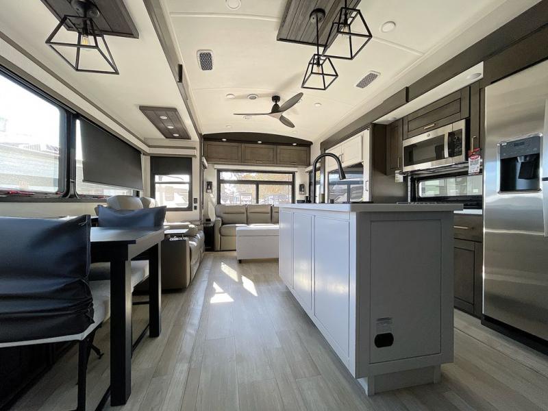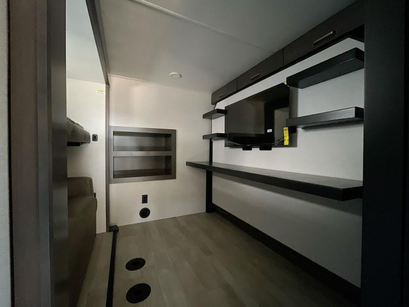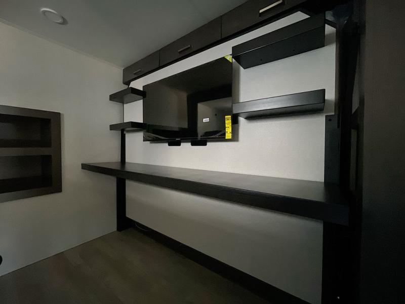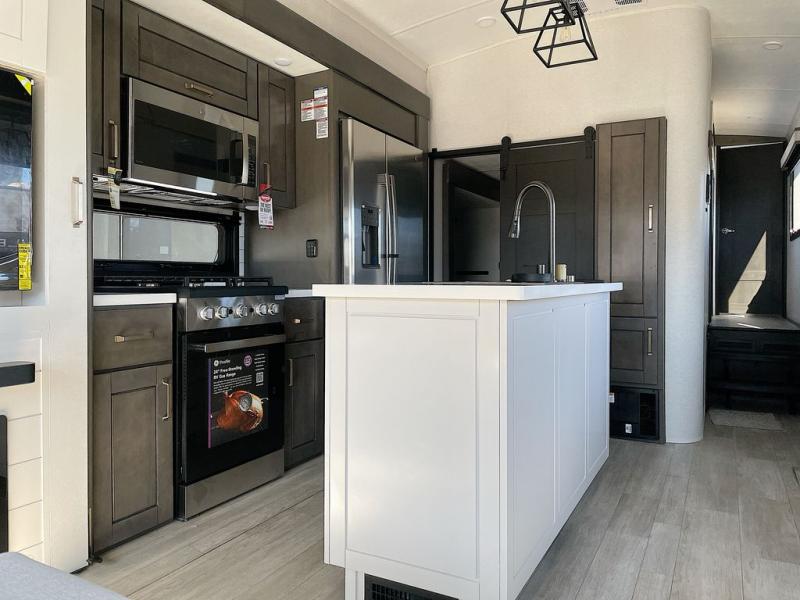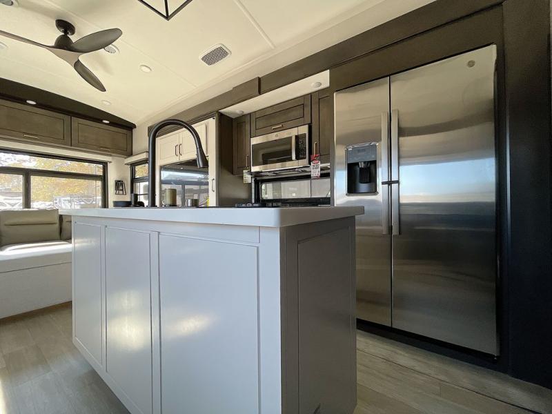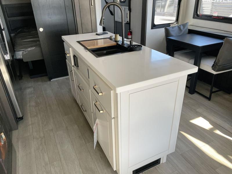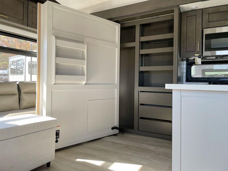 At the front of the unit, the private bedroom offers a retreat with a spacious 72" x 80" king bed, a wardrobe with drawers and a built-in hamper, and a dresser with a TV above, providing ample storage for clothing and essentials. Down the hall, the full bathroom features a 36" x 48" shower with a comfortable seat for added accessibility and relaxation. At the center of the unit, the versatile den serves perfectly as both an office and an additional sleeping area. It includes a 60" tri-fold sofa with a flip-up bunk above, a removable table for work or leisure, and across the room, a 60" x 74" Murphy bed complemented by a desk, shelves, and even a loft above, ideal for accommodating guests or creating a productive workspace on the road. Toward the rear, the open concept living area expands with dual opposing slides for a spacious and inviting atmosphere. One slide features the fully equipped kitchen with a hidden pantry, shelving for dry goods, a convection microwave with a built-in air fryer, a 21-cu. ft. refrigerator, and a 24" range. At the center, the kitchen island includes a sink and a pull-out cutting board, making meal prep both easy and enjoyable. Opposite the kitchen, you’ll find a theater seat and a roll-top dining table perfect for lounging or dining, while at the very back, a 78" sofa provides extra seating or converts into additional sleeping space when needed.