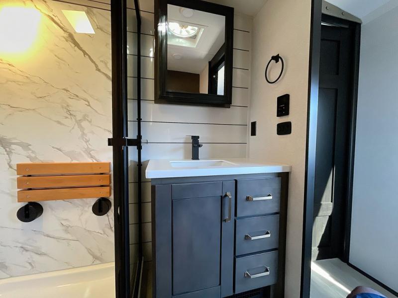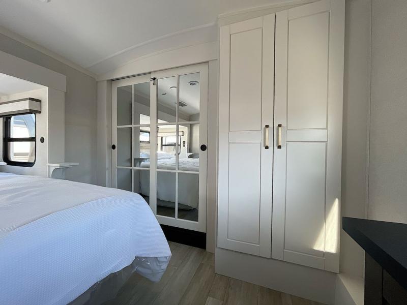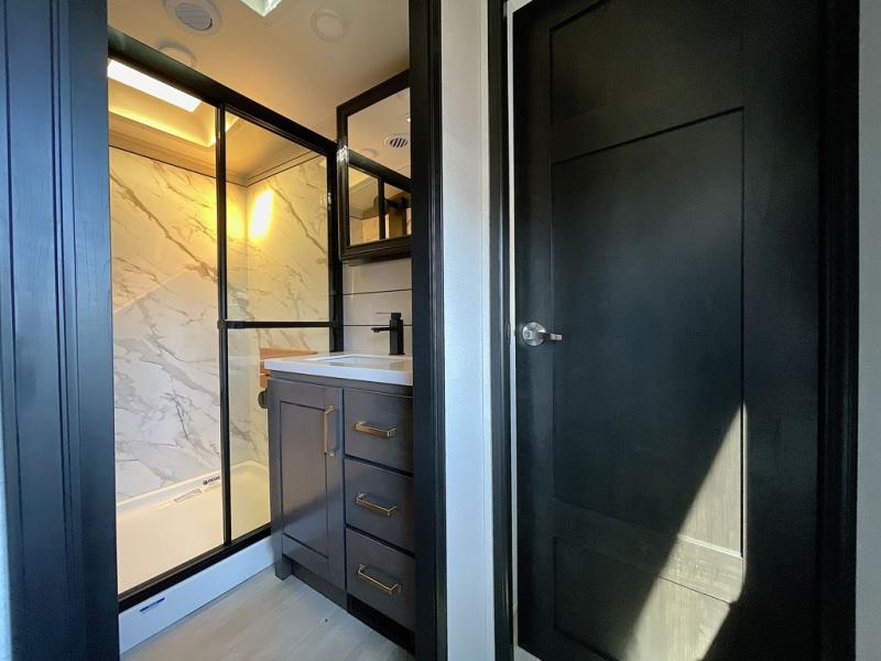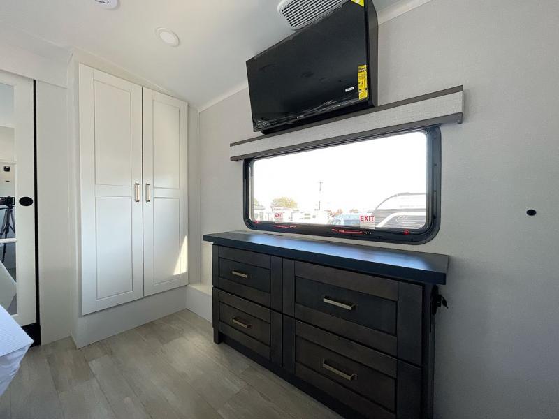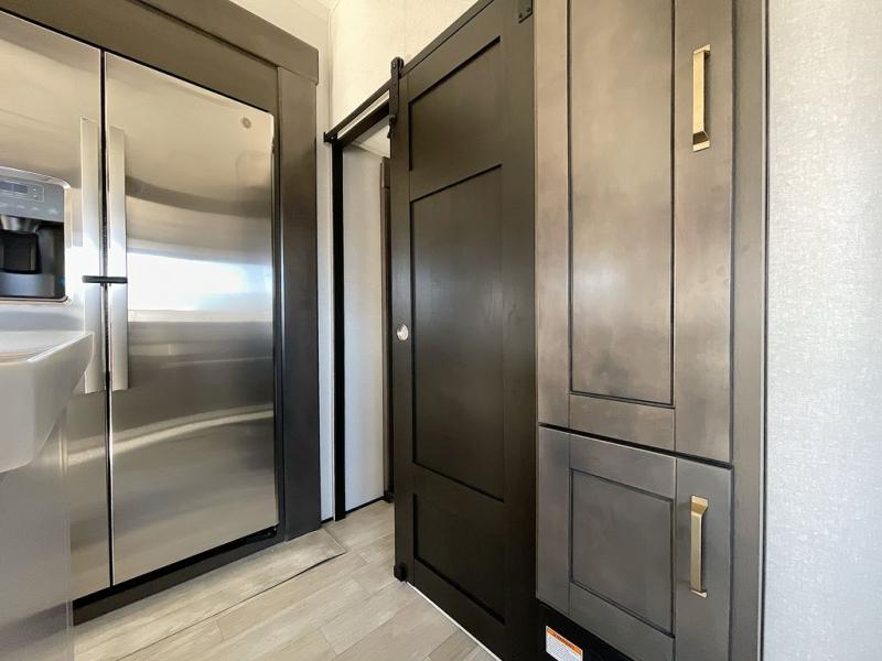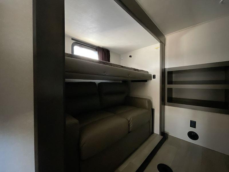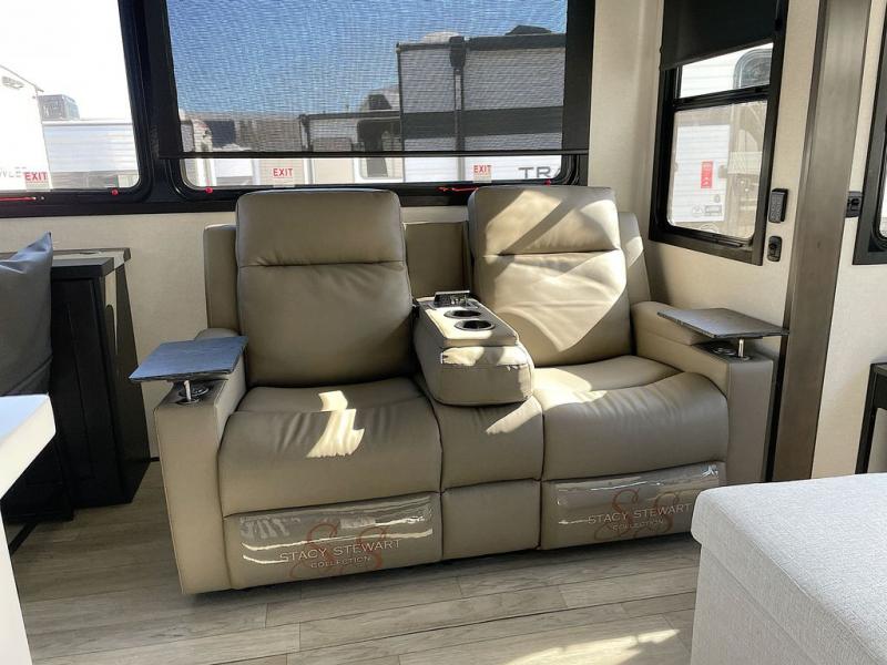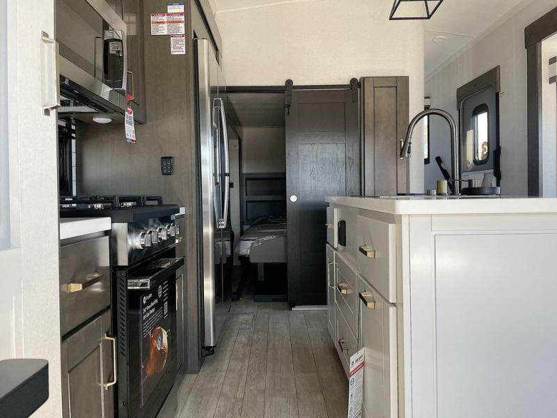 At the front of the unit, the private bedroom offers a retreat with a spacious 72" x 80" king bed, a wardrobe with drawers and a built-in hamper, and a dresser with a TV above, providing ample storage for clothing and essentials. Down the hall, the full bathroom features a 36" x 48" shower with a comfortable seat for added accessibility and relaxation. At the center of the unit, the versatile den serves perfectly as both an office and an additional sleeping area. It includes a 60" tri-fold sofa with a flip-up bunk above, a removable table for work or leisure, and across the room, a 60" x 74" Murphy bed complemented by a desk, shelves, and even a loft above, ideal for accommodating guests or creating a productive workspace on the road. Toward the rear, the open concept living area expands with dual opposing slides for a spacious and inviting atmosphere. One slide features the fully equipped kitchen with a hidden pantry, shelving for dry goods, a convection microwave with a built-in air fryer, a 21-cu. ft. refrigerator, and a 24" range. At the center, the kitchen island includes a sink and a pull-out cutting board, making meal prep both easy and enjoyable. Opposite the kitchen, you’ll find a theater seat and a roll-top dining table perfect for lounging or dining, while at the very back, a 78" sofa provides extra seating or converts into additional sleeping space when needed.