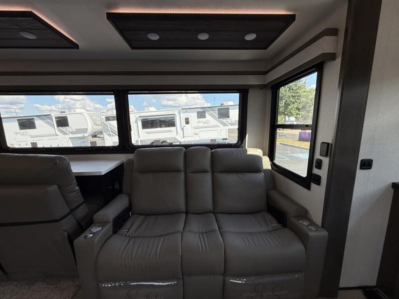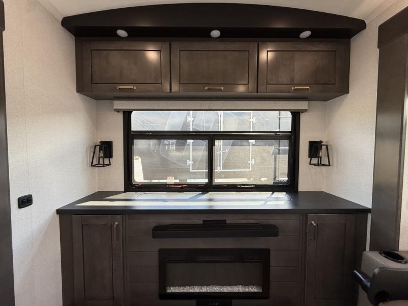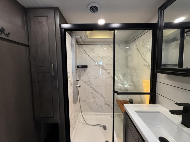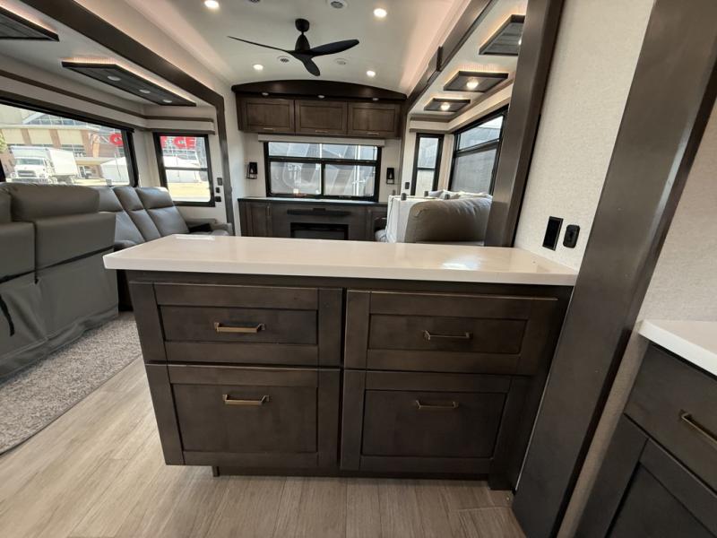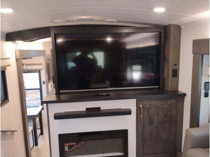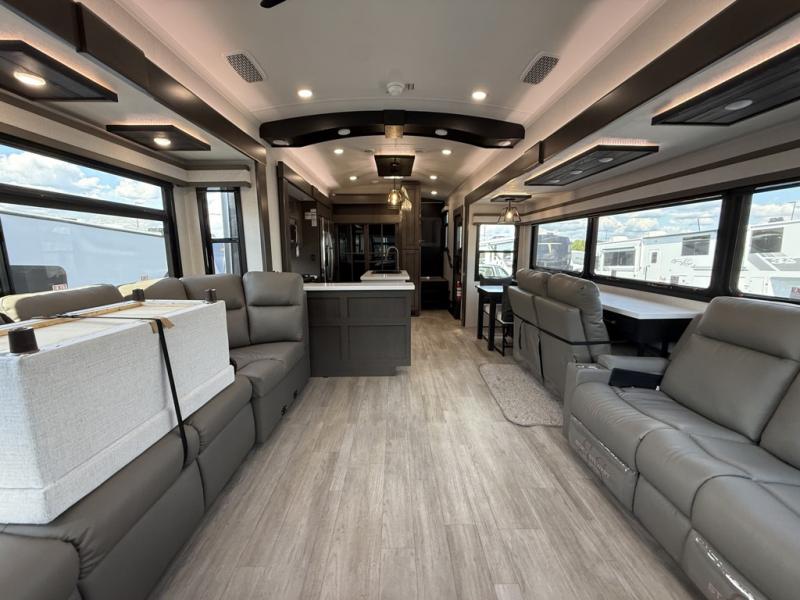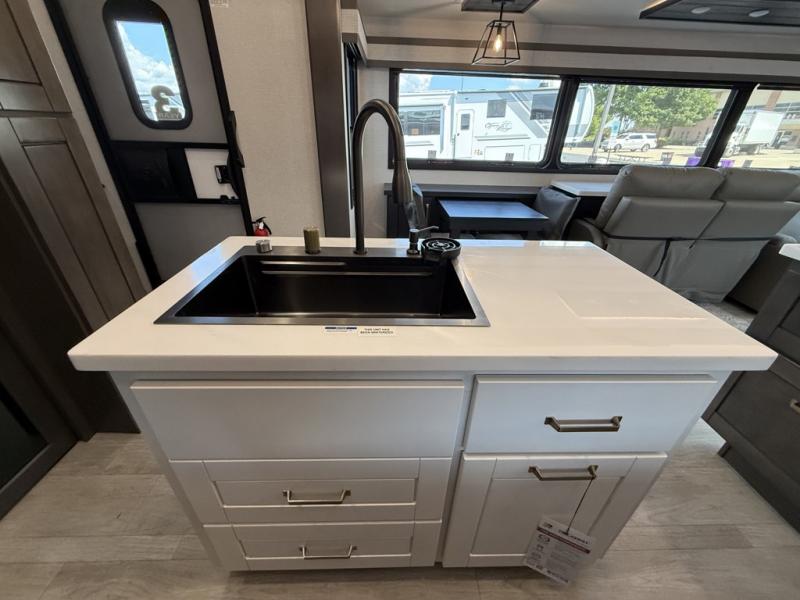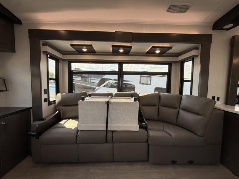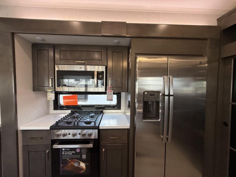 At the front of this 38RE layout, you’ll find a private bedroom featuring a spacious 72" x 80" king bed slide-out, creating a comfortable retreat to rest and recharge. The room also includes a wardrobe and dresser with a TV above, providing ample storage for clothing and essentials. Moving down the hall, the full bathroom offers both comfort and convenience with its 36" x 48" shower complete with a built-in seat for accessibility, plus linen shelves for added storage. At the heart of the unit, the kitchen is thoughtfully designed with everything needed to cook in comfort, including a pantry, a pull-out cutting board in the island, and a 21-cu. ft. refrigerator. Meal preparation is a breeze with the 24" range or the convection microwave featuring a built-in air fryer. Across from the kitchen, the large slide-out hosts a roll-out table perfect for dining or game nights, as well as a desk/coffee bar and cozy theater seating. At the rear, the entertainment center stands out with a TV lift and fireplace, while the L-shaped lounge and additional theater seat create the ultimate space to relax and enjoy movie nights in style.
