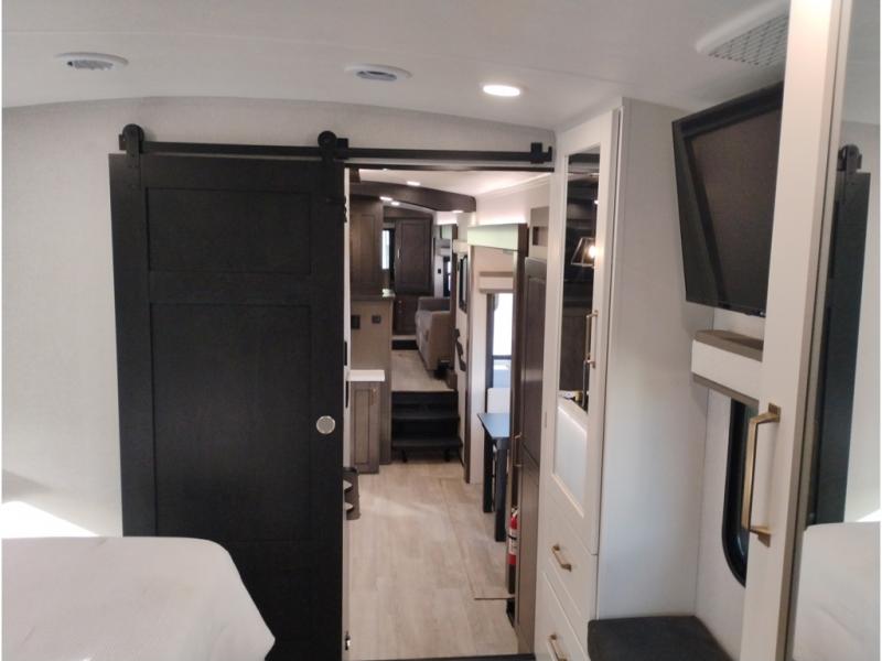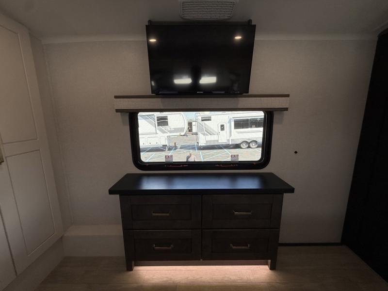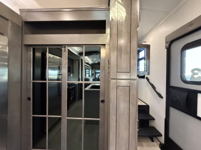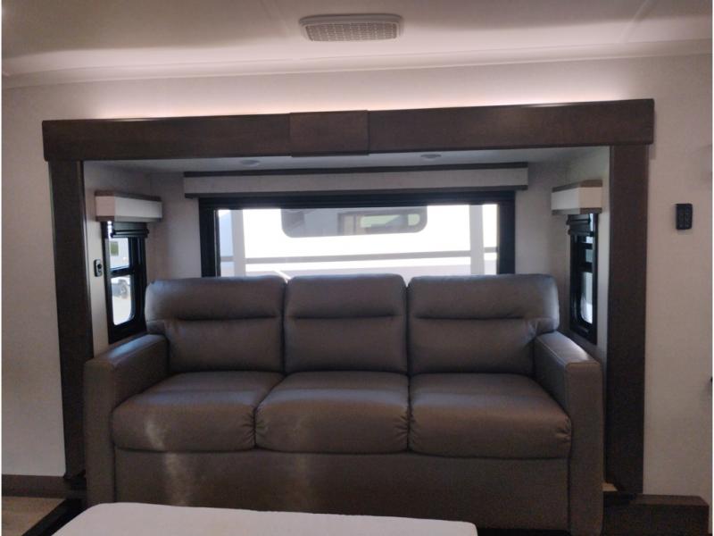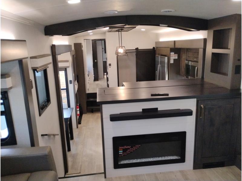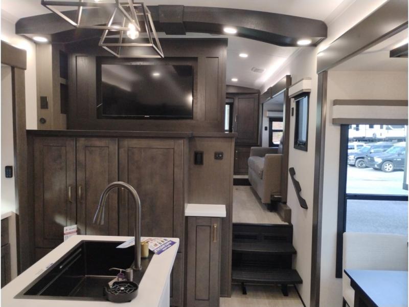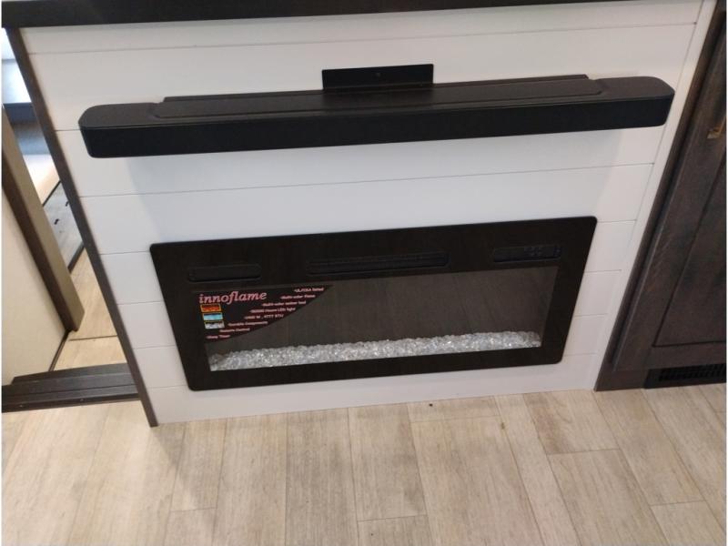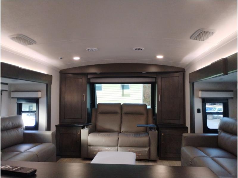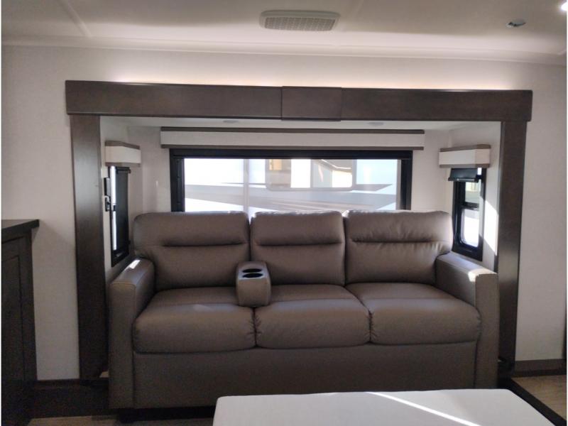 At the front of this 38RE layout, you’ll find a private bedroom featuring a spacious 72" x 80" king bed slide-out, creating a comfortable retreat to rest and recharge. The room also includes a wardrobe and dresser with a TV above, providing ample storage for clothing and essentials. Moving down the hall, the full bathroom offers both comfort and convenience with its 36" x 48" shower complete with a built-in seat for accessibility, plus linen shelves for added storage. At the heart of the unit, the kitchen is thoughtfully designed with everything needed to cook in comfort, including a pantry, a pull-out cutting board in the island, and a 21-cu. ft. refrigerator. Meal preparation is a breeze with the 24" range or the convection microwave featuring a built-in air fryer. Across from the kitchen, the large slide-out hosts a roll-out table perfect for dining or game nights, as well as a desk/coffee bar and cozy theater seating. At the rear, the entertainment center stands out with a TV lift and fireplace, while the L-shaped lounge and additional theater seat create the ultimate space to relax and enjoy movie nights in style.