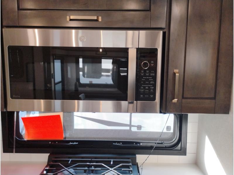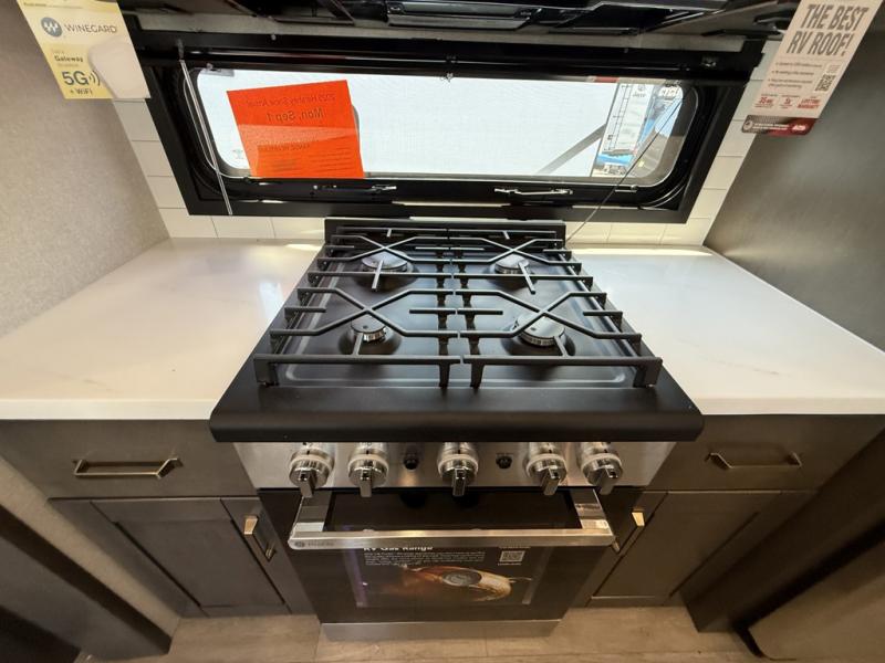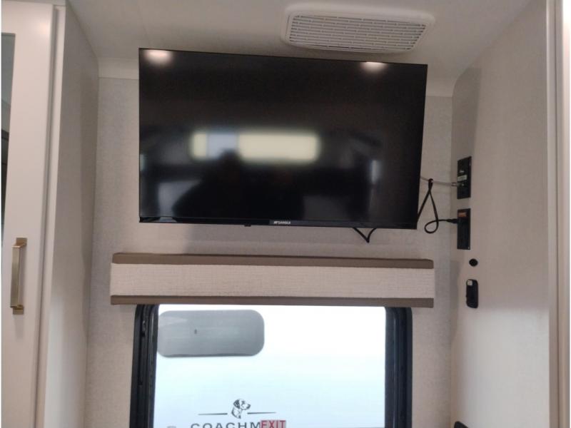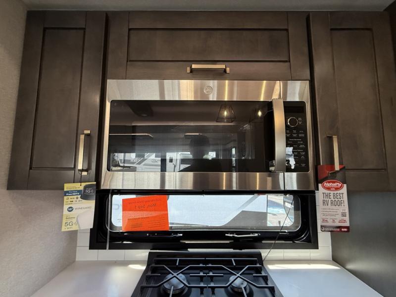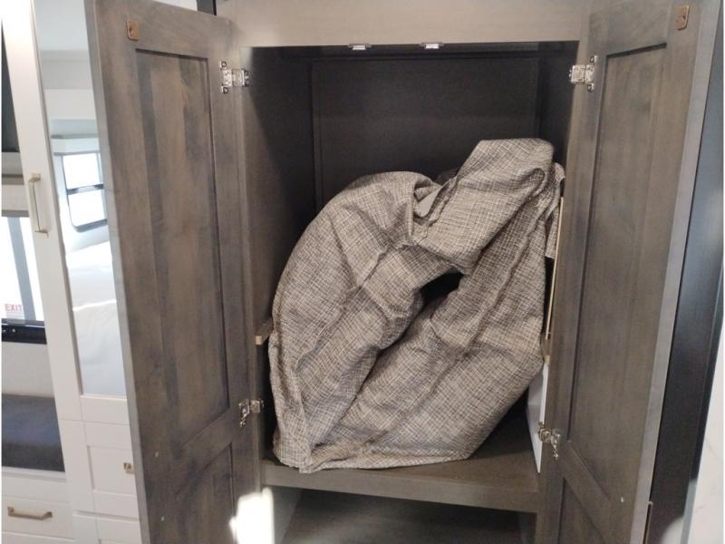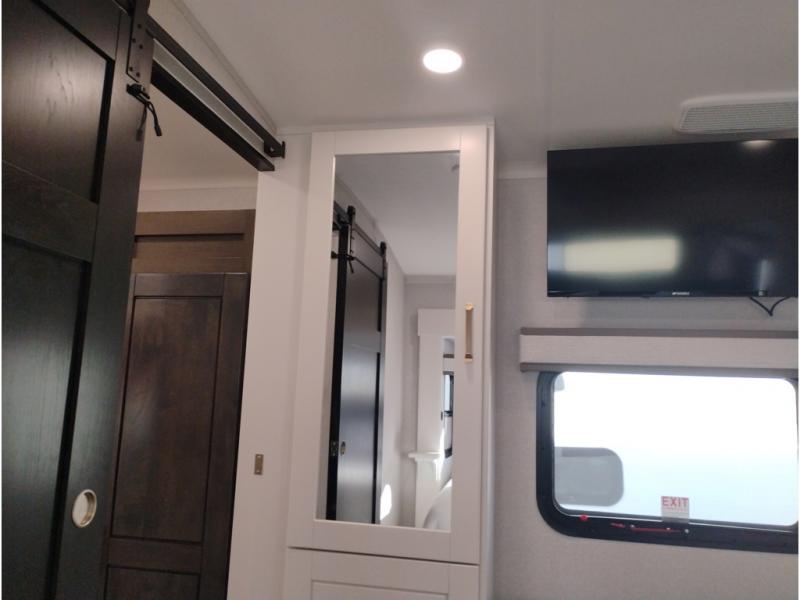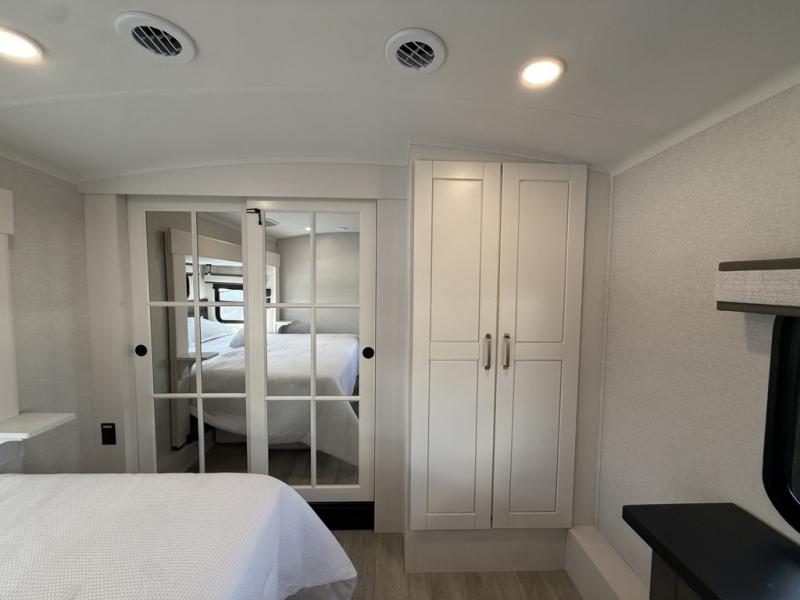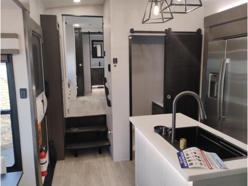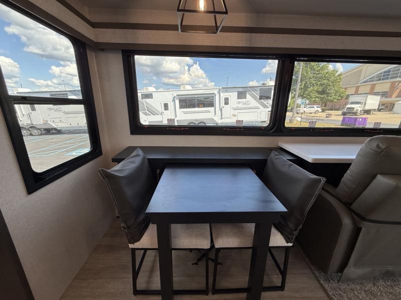 At the front of this 38RE layout, you’ll find a private bedroom featuring a spacious 72" x 80" king bed slide-out, creating a comfortable retreat to rest and recharge. The room also includes a wardrobe and dresser with a TV above, providing ample storage for clothing and essentials. Moving down the hall, the full bathroom offers both comfort and convenience with its 36" x 48" shower complete with a built-in seat for accessibility, plus linen shelves for added storage. At the heart of the unit, the kitchen is thoughtfully designed with everything needed to cook in comfort, including a pantry, a pull-out cutting board in the island, and a 21-cu. ft. refrigerator. Meal preparation is a breeze with the 24" range or the convection microwave featuring a built-in air fryer. Across from the kitchen, the large slide-out hosts a roll-out table perfect for dining or game nights, as well as a desk/coffee bar and cozy theater seating. At the rear, the entertainment center stands out with a TV lift and fireplace, while the L-shaped lounge and additional theater seat create the ultimate space to relax and enjoy movie nights in style.