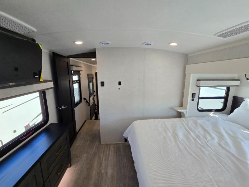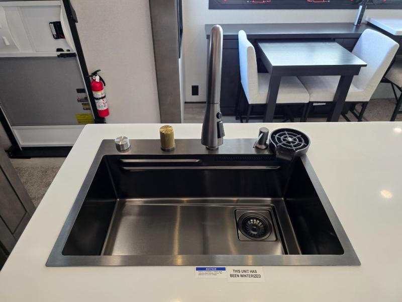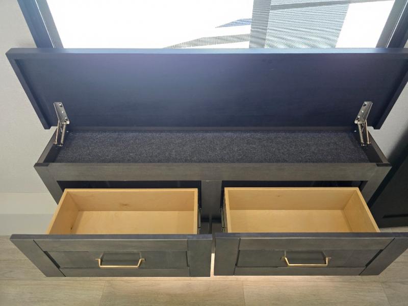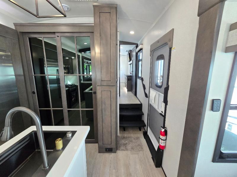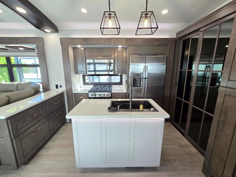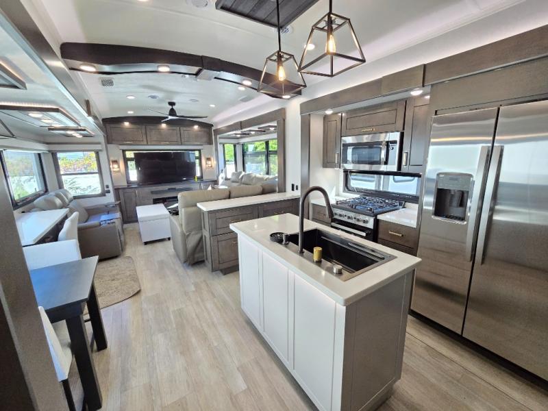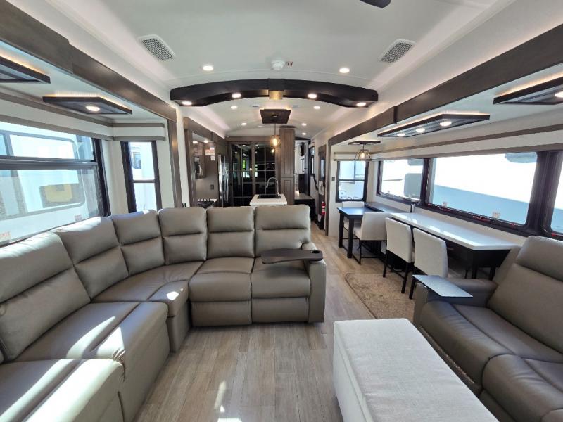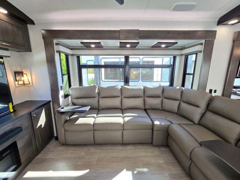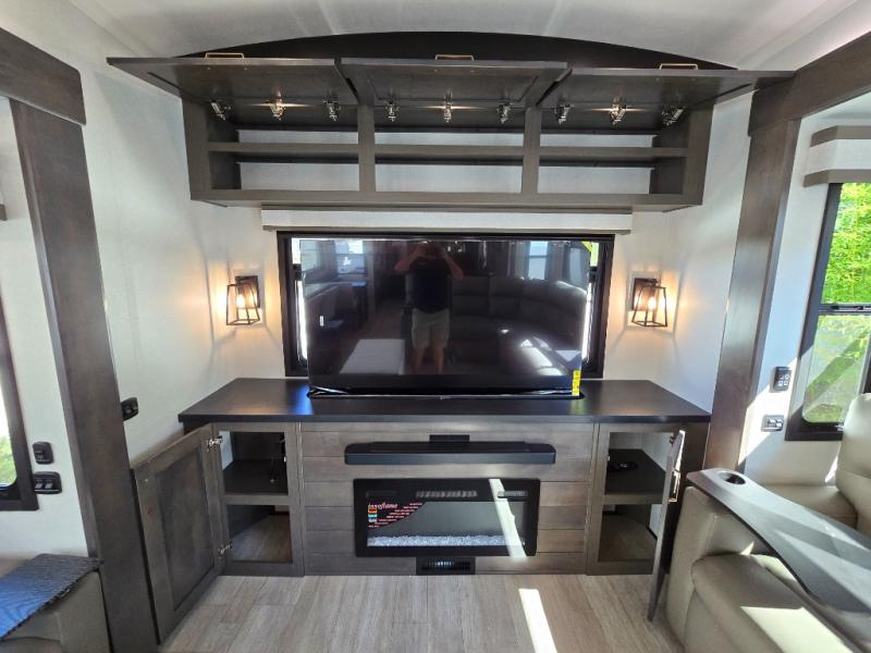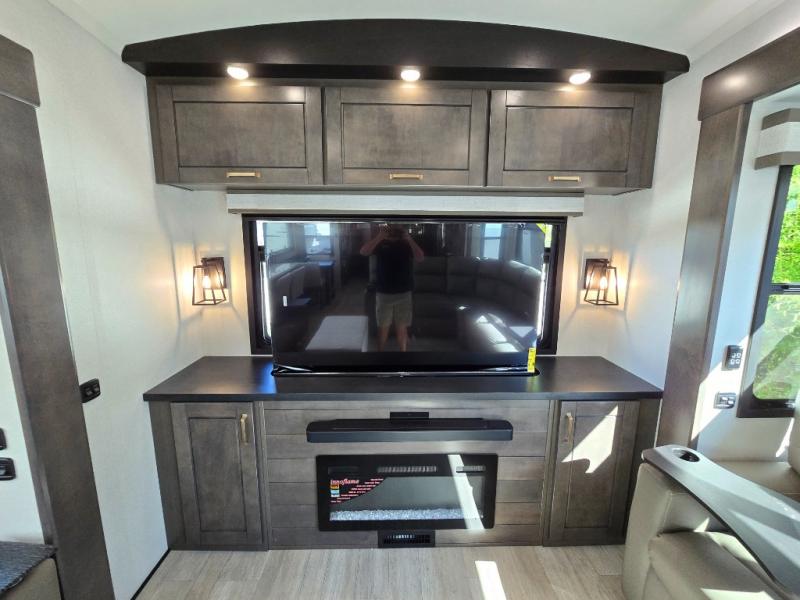 At the front of this 38RE layout, you’ll find a private bedroom featuring a spacious 72" x 80" king bed slide-out, creating a comfortable retreat to rest and recharge. The room also includes a wardrobe and dresser with a TV above, providing ample storage for clothing and essentials. Moving down the hall, the full bathroom offers both comfort and convenience with its 36" x 48" shower complete with a built-in seat for accessibility, plus linen shelves for added storage. At the heart of the unit, the kitchen is thoughtfully designed with everything needed to cook in comfort, including a pantry, a pull-out cutting board in the island, and a 21-cu. ft. refrigerator. Meal preparation is a breeze with the 24" range or the convection microwave featuring a built-in air fryer. Across from the kitchen, the large slide-out hosts a roll-out table perfect for dining or game nights, as well as a desk/coffee bar and cozy theater seating. At the rear, the entertainment center stands out with a TV lift and fireplace, while the L-shaped lounge and additional theater seat create the ultimate space to relax and enjoy movie nights in style.