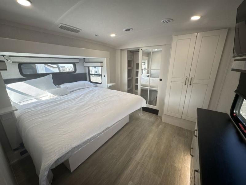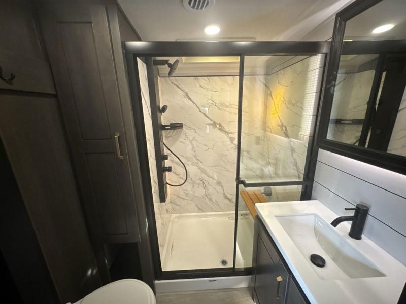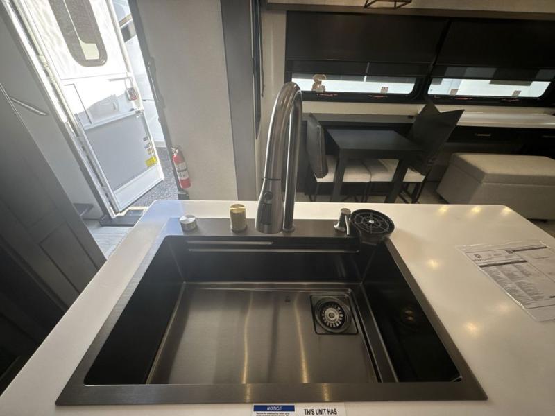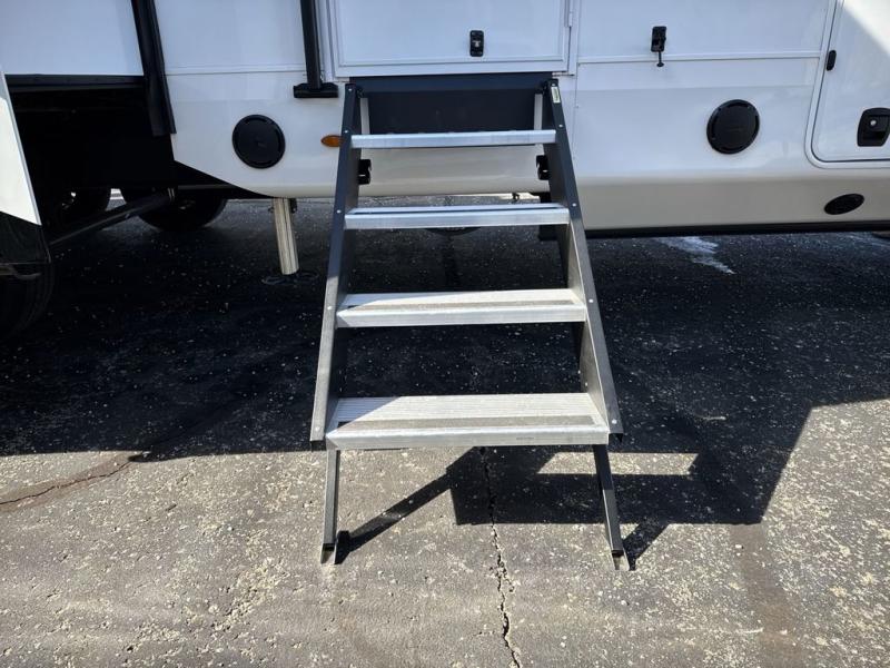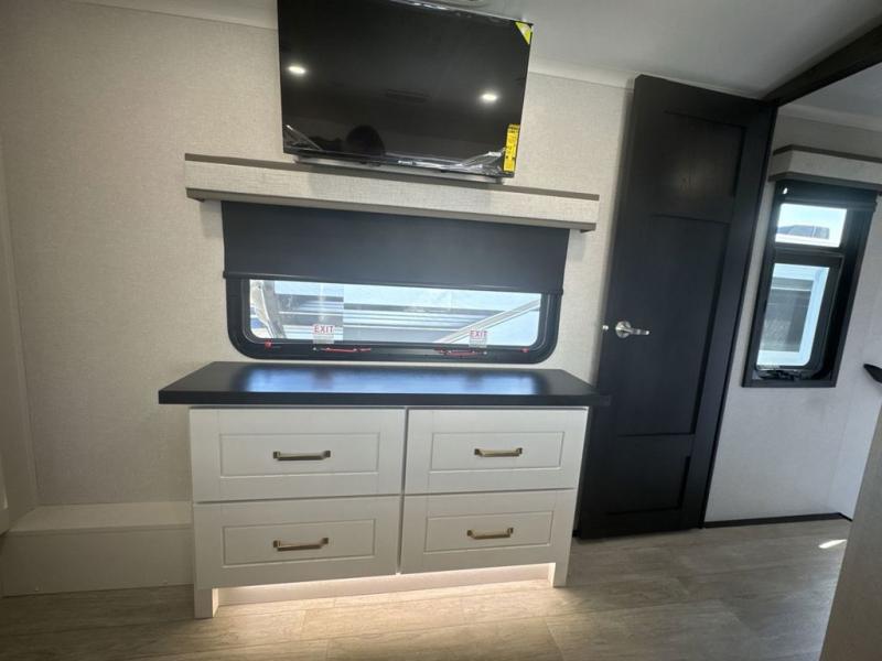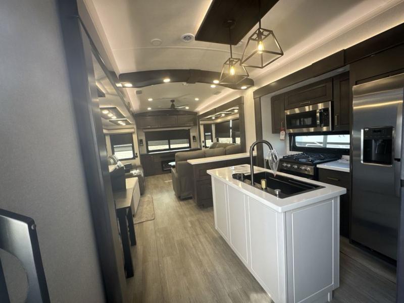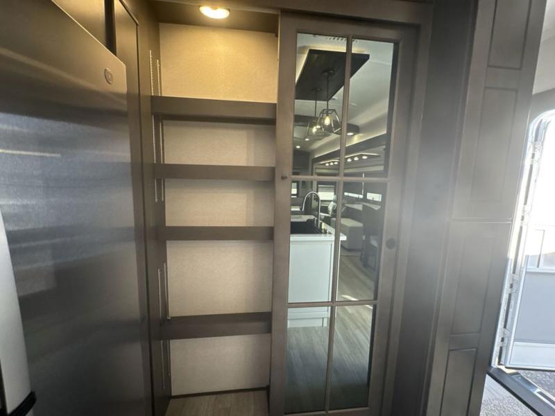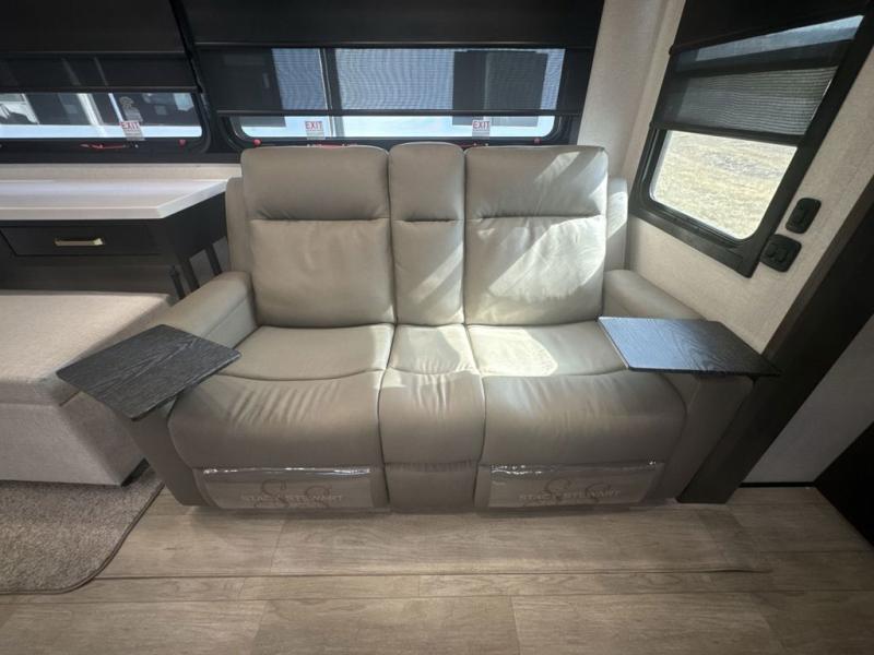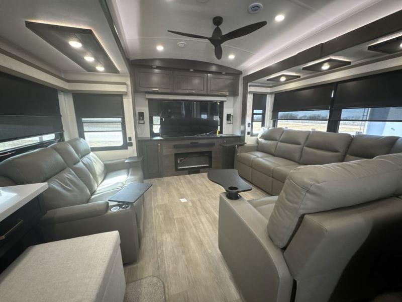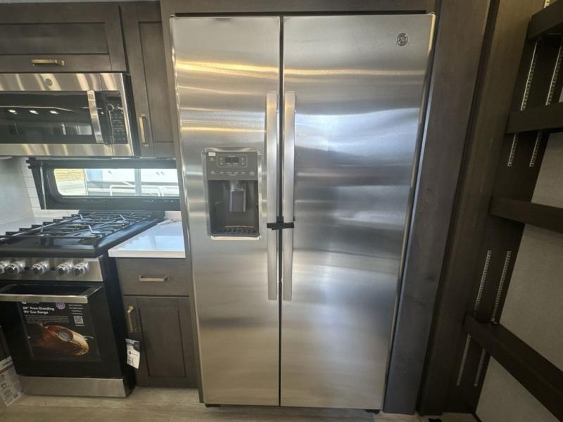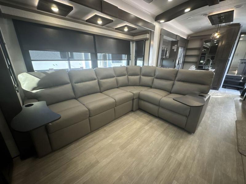 At the front of this 38RE layout, you’ll find a private bedroom featuring a spacious 72" x 80" king bed slide-out, creating a comfortable retreat to rest and recharge. The room also includes a wardrobe and dresser with a TV above, providing ample storage for clothing and essentials. Moving down the hall, the full bathroom offers both comfort and convenience with its 36" x 48" shower complete with a built-in seat for accessibility, plus linen shelves for added storage. At the heart of the unit, the kitchen is thoughtfully designed with everything needed to cook in comfort, including a pantry, a pull-out cutting board in the island, and a 21-cu. ft. refrigerator. Meal preparation is a breeze with the 24" range or the convection microwave featuring a built-in air fryer. Across from the kitchen, the large slide-out hosts a roll-out table perfect for dining or game nights, as well as a desk/coffee bar and cozy theater seating. At the rear, the entertainment center stands out with a TV lift and fireplace, while the L-shaped lounge and additional theater seat create the ultimate space to relax and enjoy movie nights in style.