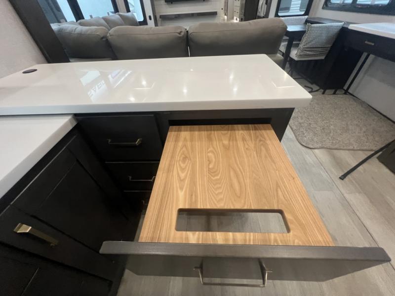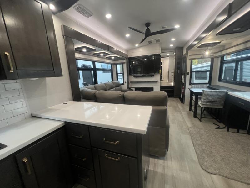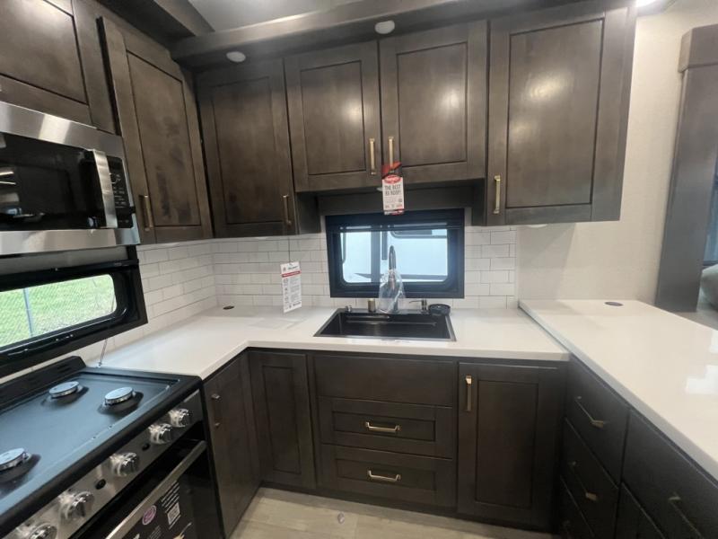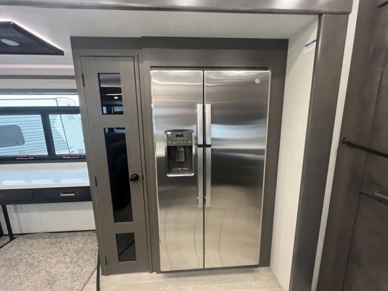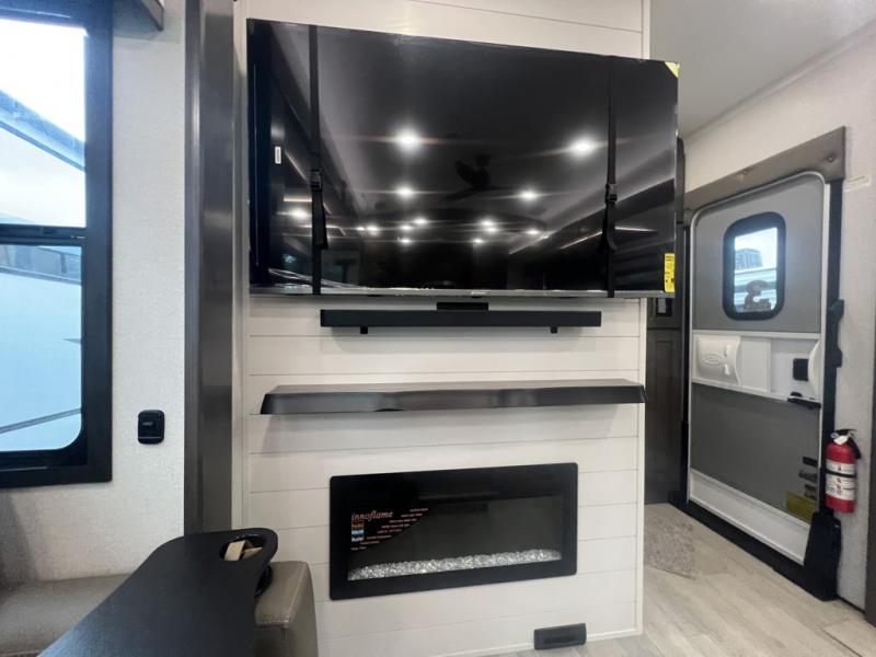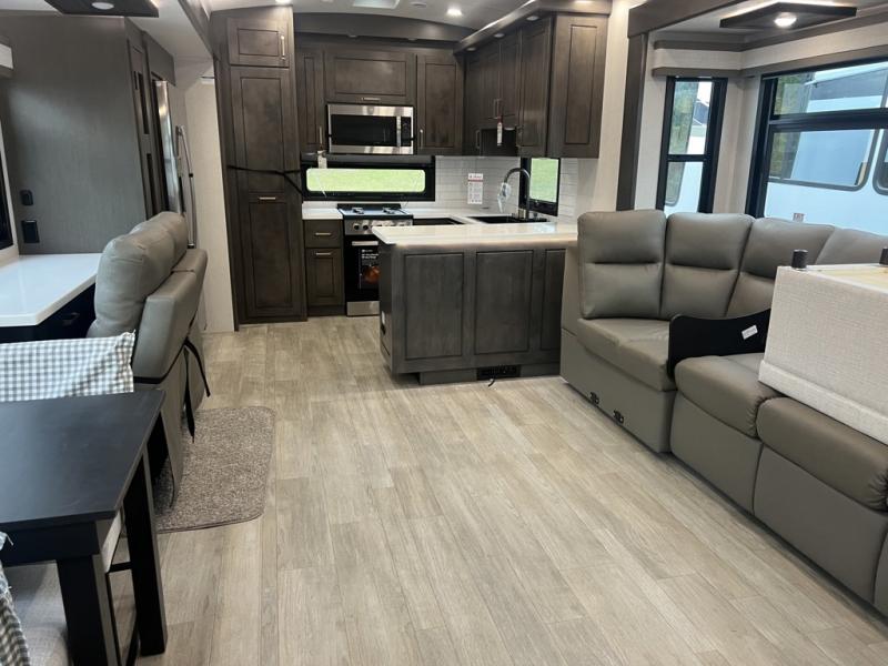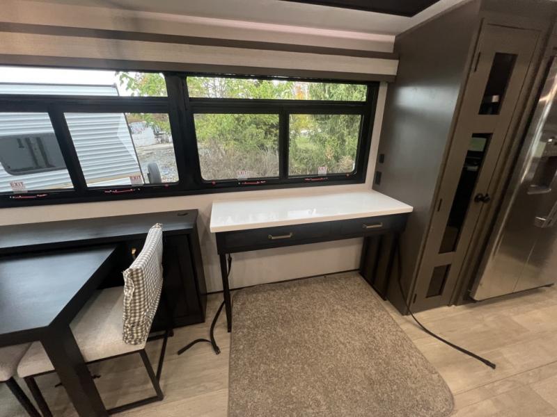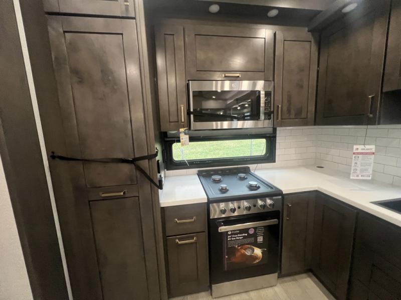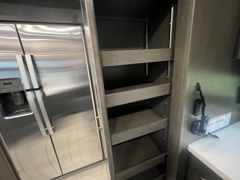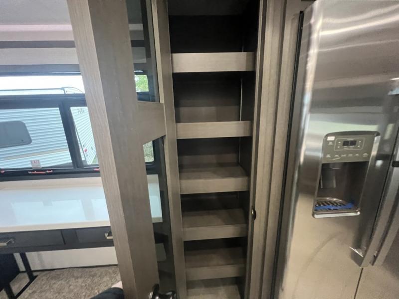 Starting from the back, this impressive 39RK features a rear kitchen designed in a convenient U-shape for easy accessibility and efficient meal prep. The kitchen is fully equipped with plenty of overhead cabinets, a convection microwave with an air fryer, a 24" range, and a pull-out pantry, perfect for the chef on the trip to cook in comfort. Across the kitchen, the large slide-out houses a 21-cu. ft. refrigerator and a second pantry with shelves, providing even more space to store groceries, snacks, and coffee essentials. The nearby desk/coffee bar and roll-out table create an inviting area to enjoy meals or unwind with a cup of coffee. The living area offers a spacious 100" L-shaped sofa and a theater seat facing the TV and fireplace, making it an ideal spot for relaxing or hosting movie nights. Moving forward, you’ll find a convenient half bathroom with linen shelves for added storage and accessibility. At the front, the private bedroom features a 72" x 80" king bed in a slide-out with a dresser across for ample storage. Finally, the full bathroom at the very front includes a 30" x 61" shower with a seat for comfort, a large sink, and a walk-in closet that provides generous space for all your clothing and gear.