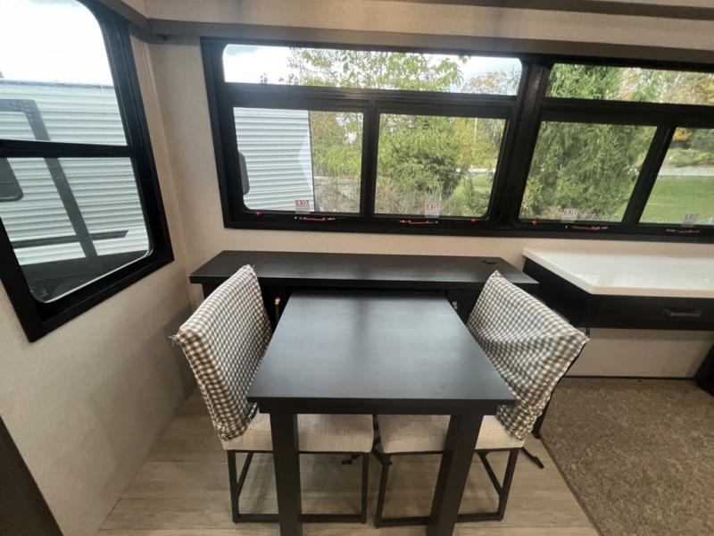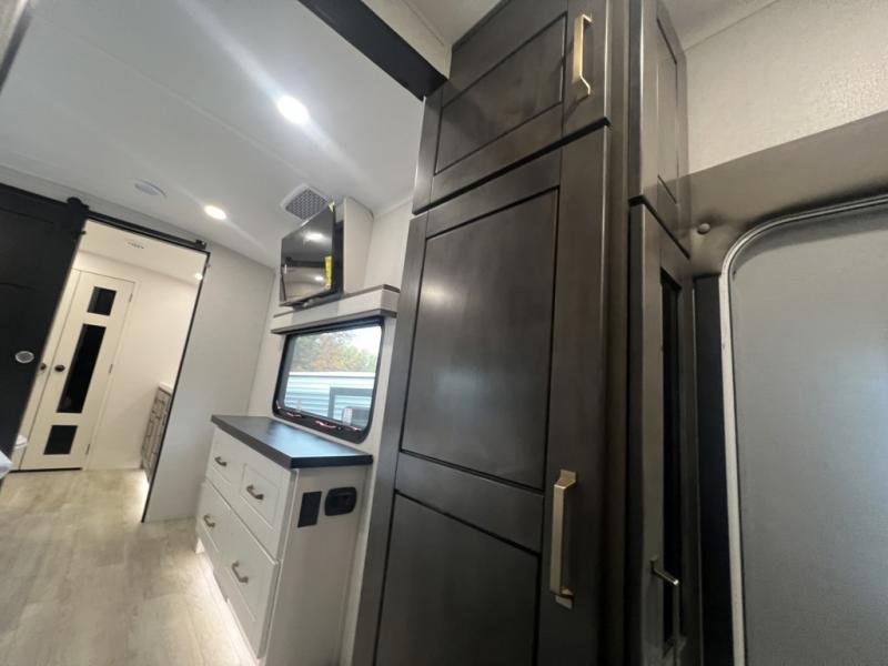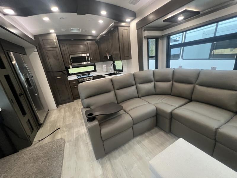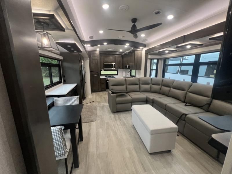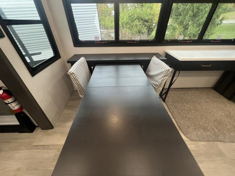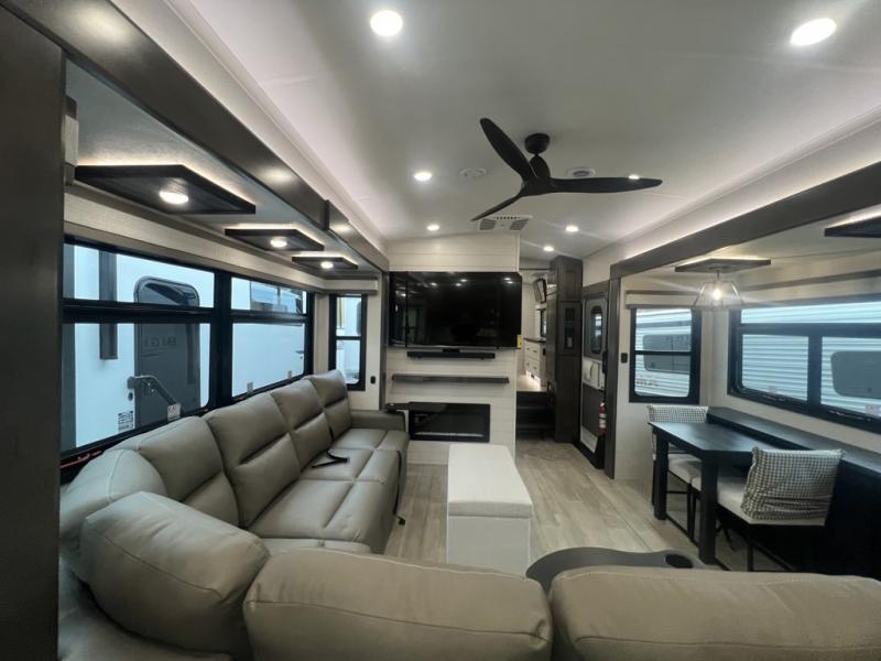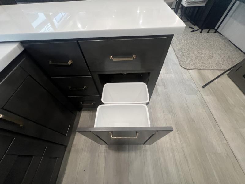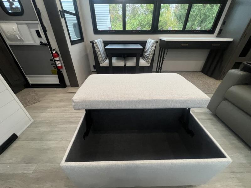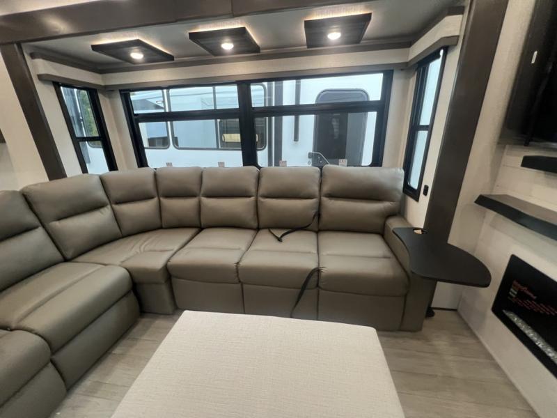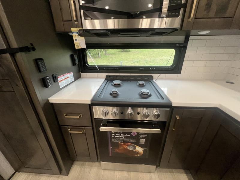 Starting from the back, this impressive 39RK features a rear kitchen designed in a convenient U-shape for easy accessibility and efficient meal prep. The kitchen is fully equipped with plenty of overhead cabinets, a convection microwave with an air fryer, a 24" range, and a pull-out pantry, perfect for the chef on the trip to cook in comfort. Across the kitchen, the large slide-out houses a 21-cu. ft. refrigerator and a second pantry with shelves, providing even more space to store groceries, snacks, and coffee essentials. The nearby desk/coffee bar and roll-out table create an inviting area to enjoy meals or unwind with a cup of coffee. The living area offers a spacious 100" L-shaped sofa and a theater seat facing the TV and fireplace, making it an ideal spot for relaxing or hosting movie nights. Moving forward, you’ll find a convenient half bathroom with linen shelves for added storage and accessibility. At the front, the private bedroom features a 72" x 80" king bed in a slide-out with a dresser across for ample storage. Finally, the full bathroom at the very front includes a 30" x 61" shower with a seat for comfort, a large sink, and a walk-in closet that provides generous space for all your clothing and gear.