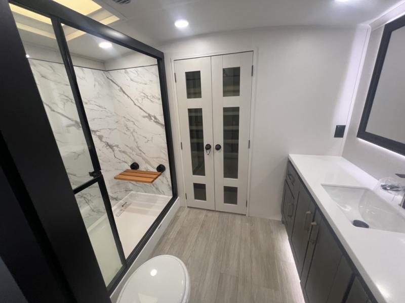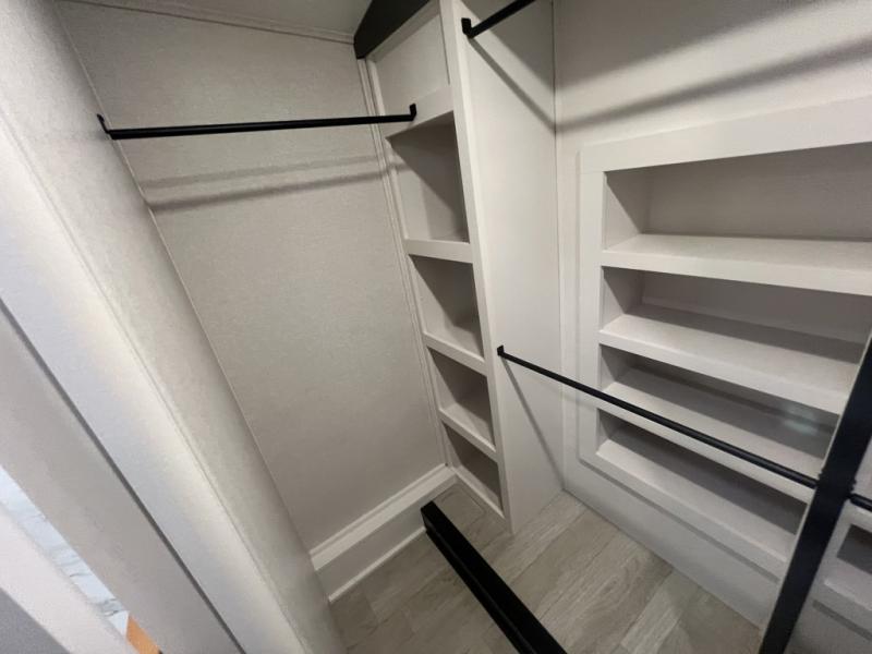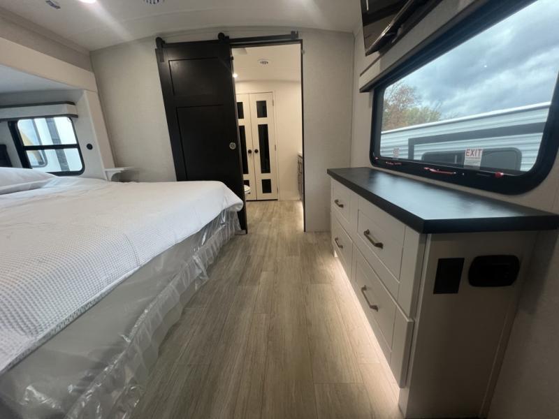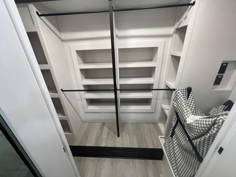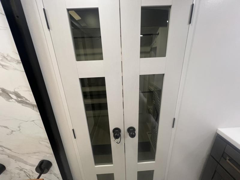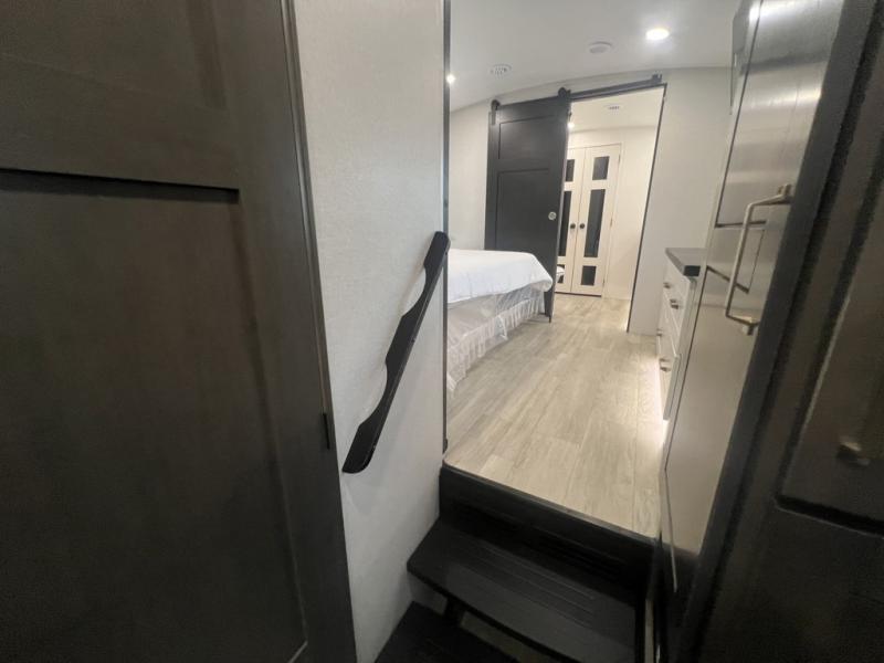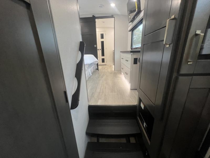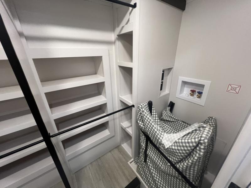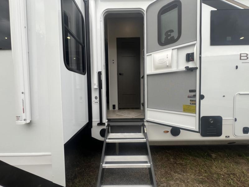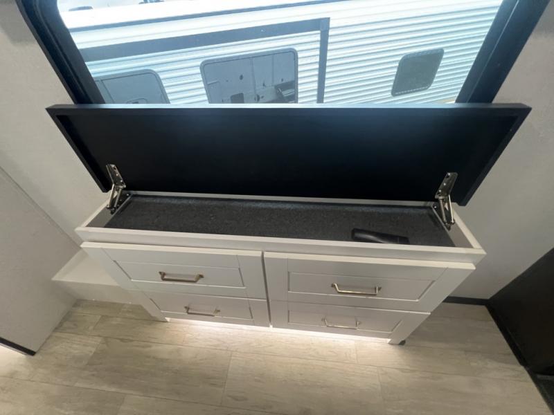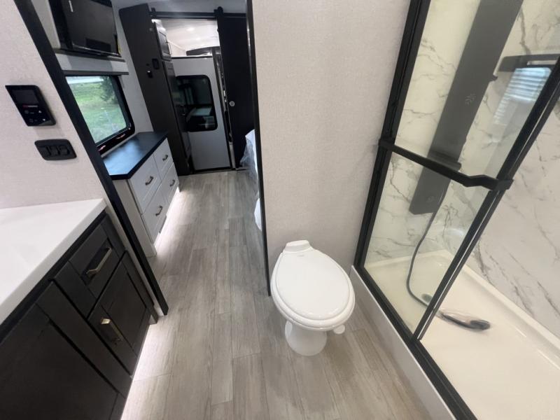 Starting from the back, this impressive 39RK features a rear kitchen designed in a convenient U-shape for easy accessibility and efficient meal prep. The kitchen is fully equipped with plenty of overhead cabinets, a convection microwave with an air fryer, a 24" range, and a pull-out pantry, perfect for the chef on the trip to cook in comfort. Across the kitchen, the large slide-out houses a 21-cu. ft. refrigerator and a second pantry with shelves, providing even more space to store groceries, snacks, and coffee essentials. The nearby desk/coffee bar and roll-out table create an inviting area to enjoy meals or unwind with a cup of coffee. The living area offers a spacious 100" L-shaped sofa and a theater seat facing the TV and fireplace, making it an ideal spot for relaxing or hosting movie nights. Moving forward, you’ll find a convenient half bathroom with linen shelves for added storage and accessibility. At the front, the private bedroom features a 72" x 80" king bed in a slide-out with a dresser across for ample storage. Finally, the full bathroom at the very front includes a 30" x 61" shower with a seat for comfort, a large sink, and a walk-in closet that provides generous space for all your clothing and gear.