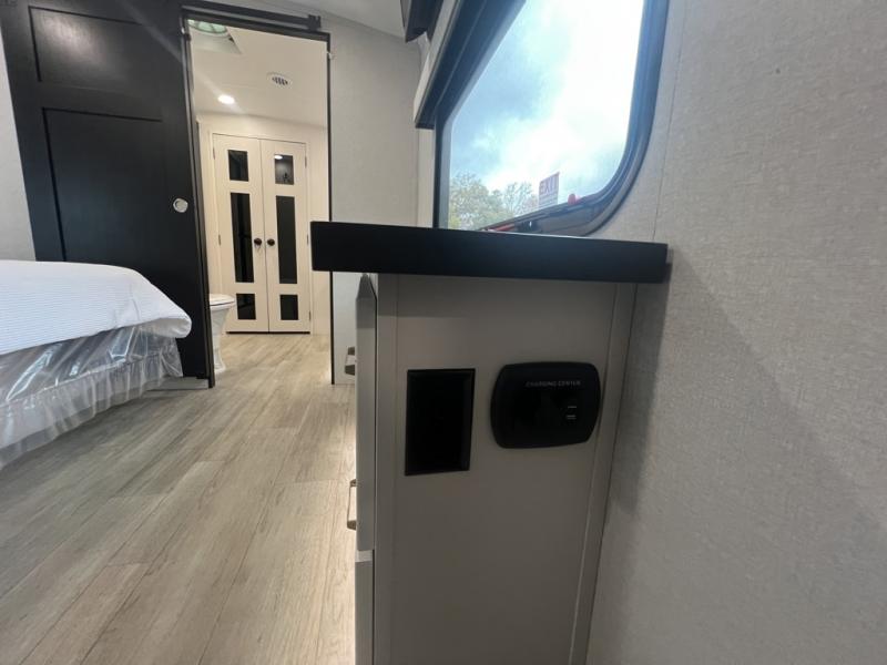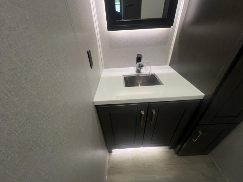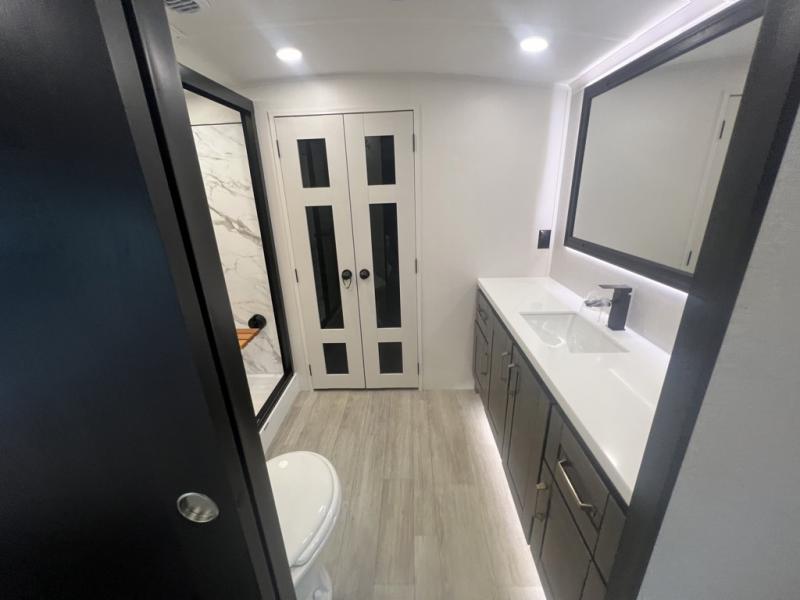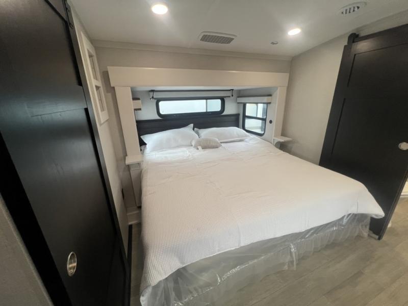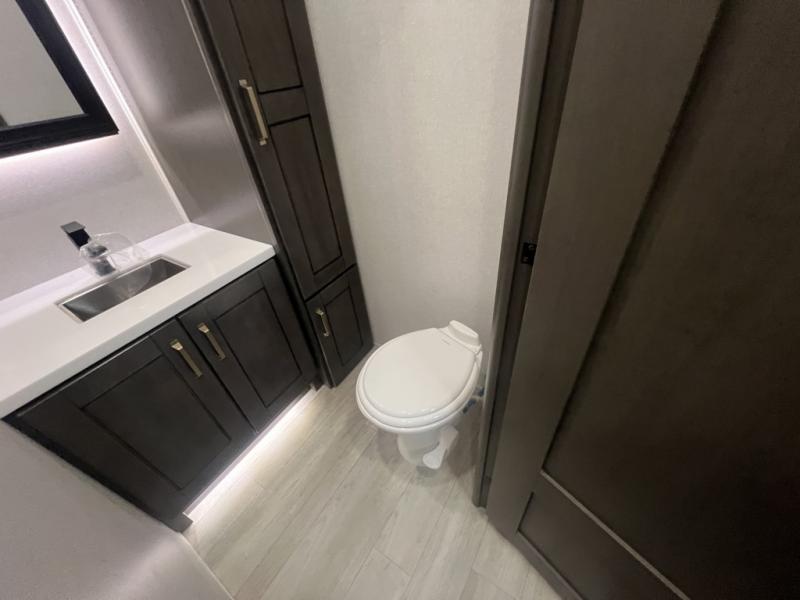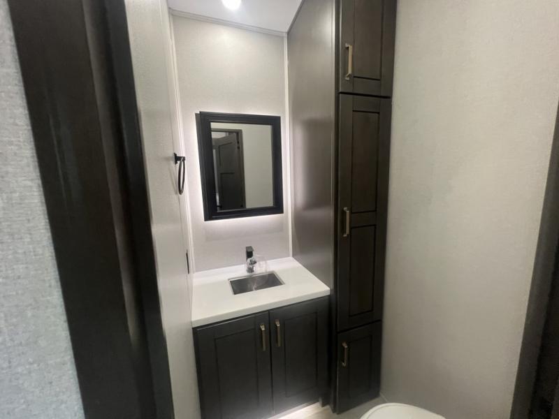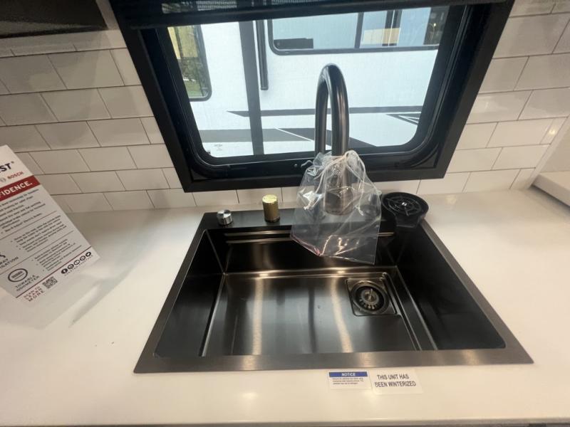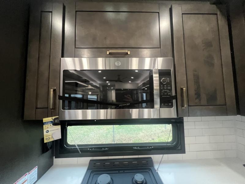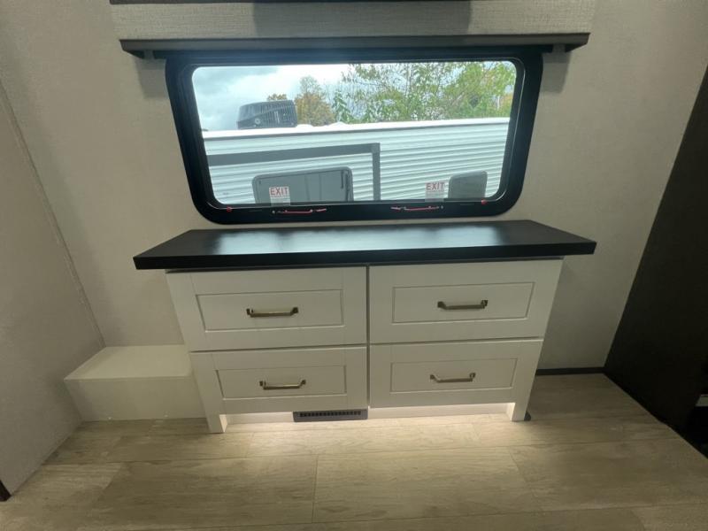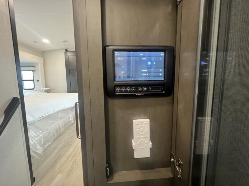 Starting from the back, this impressive 39RK features a rear kitchen designed in a convenient U-shape for easy accessibility and efficient meal prep. The kitchen is fully equipped with plenty of overhead cabinets, a convection microwave with an air fryer, a 24" range, and a pull-out pantry, perfect for the chef on the trip to cook in comfort. Across the kitchen, the large slide-out houses a 21-cu. ft. refrigerator and a second pantry with shelves, providing even more space to store groceries, snacks, and coffee essentials. The nearby desk/coffee bar and roll-out table create an inviting area to enjoy meals or unwind with a cup of coffee. The living area offers a spacious 100" L-shaped sofa and a theater seat facing the TV and fireplace, making it an ideal spot for relaxing or hosting movie nights. Moving forward, you’ll find a convenient half bathroom with linen shelves for added storage and accessibility. At the front, the private bedroom features a 72" x 80" king bed in a slide-out with a dresser across for ample storage. Finally, the full bathroom at the very front includes a 30" x 61" shower with a seat for comfort, a large sink, and a walk-in closet that provides generous space for all your clothing and gear.