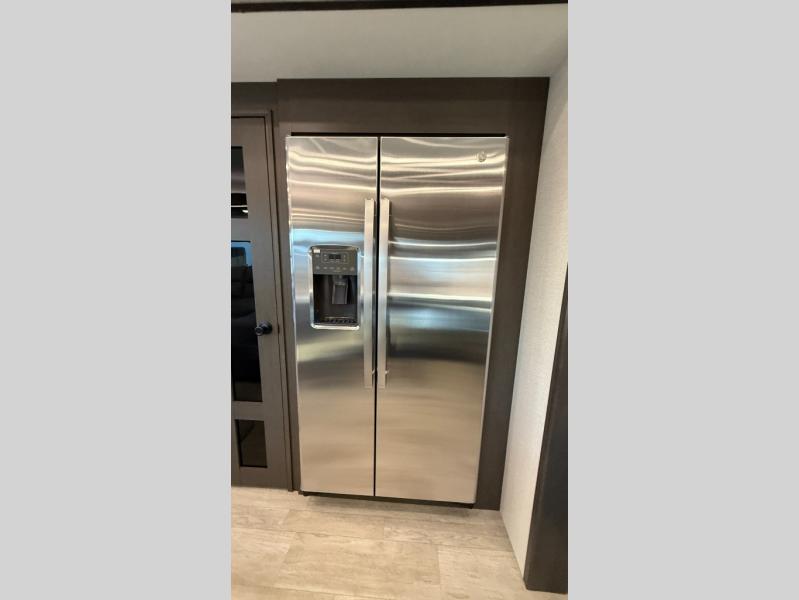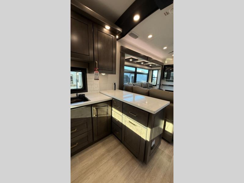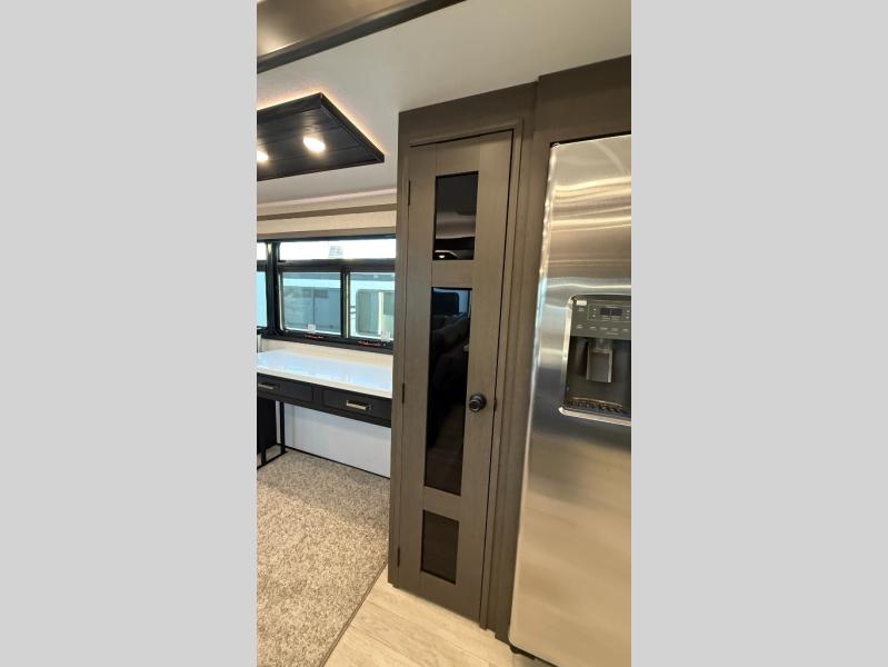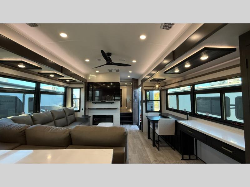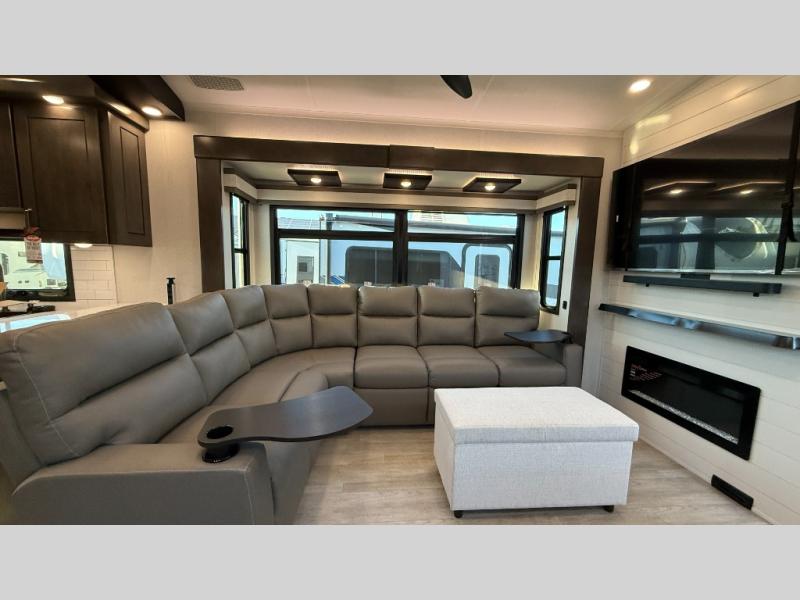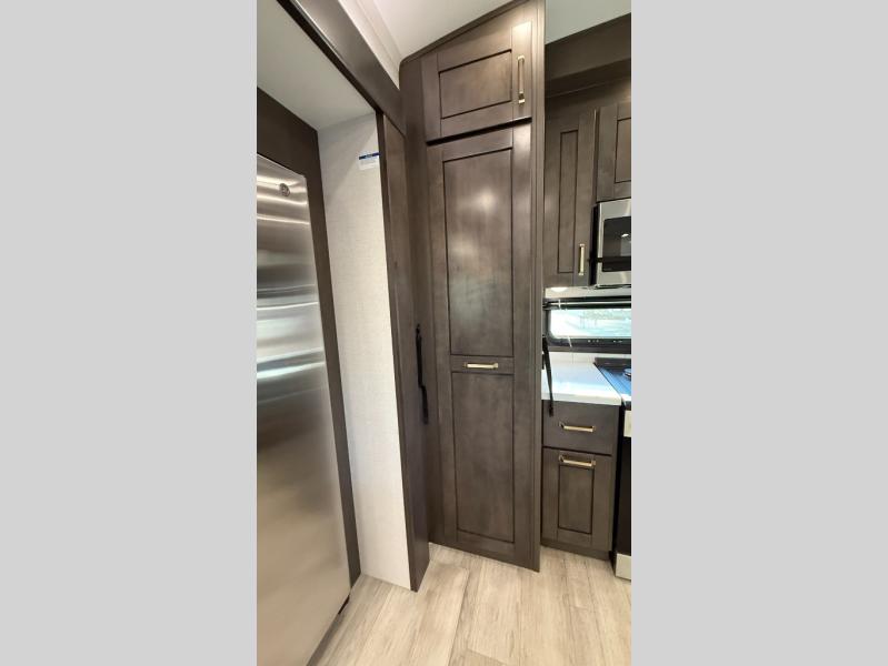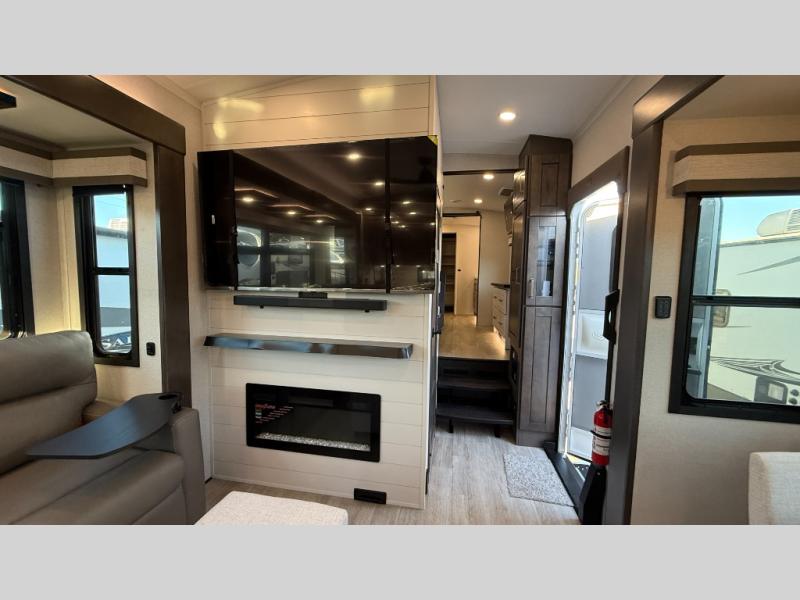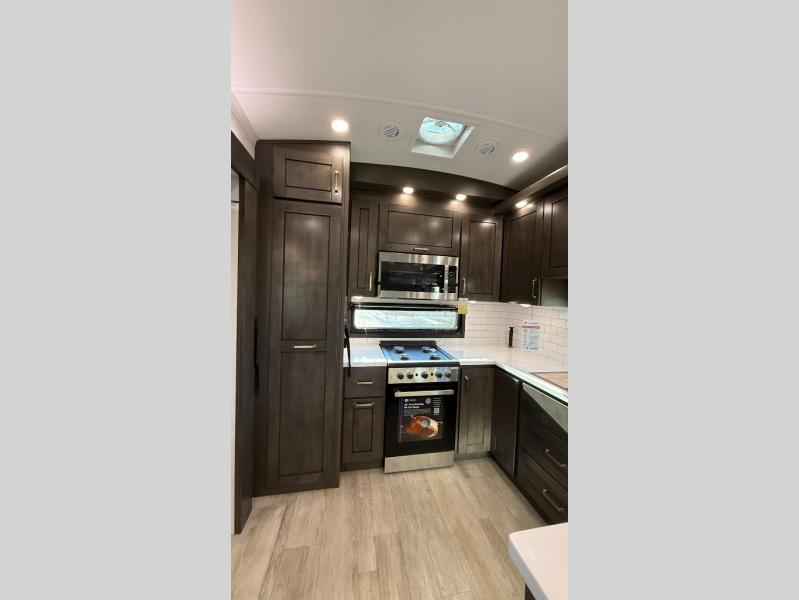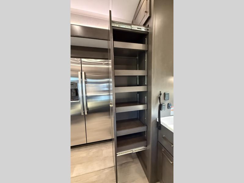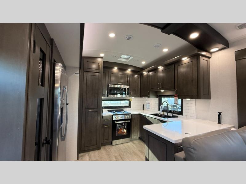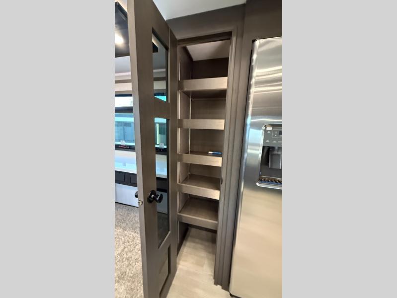 Starting from the back, this impressive 39RK features a rear kitchen designed in a convenient U-shape for easy accessibility and efficient meal prep. The kitchen is fully equipped with plenty of overhead cabinets, a convection microwave with an air fryer, a 24" range, and a pull-out pantry, perfect for the chef on the trip to cook in comfort. Across the kitchen, the large slide-out houses a 21-cu. ft. refrigerator and a second pantry with shelves, providing even more space to store groceries, snacks, and coffee essentials. The nearby desk/coffee bar and roll-out table create an inviting area to enjoy meals or unwind with a cup of coffee. The living area offers a spacious 100" L-shaped sofa and a theater seat facing the TV and fireplace, making it an ideal spot for relaxing or hosting movie nights. Moving forward, you’ll find a convenient half bathroom with linen shelves for added storage and accessibility. At the front, the private bedroom features a 72" x 80" king bed in a slide-out with a dresser across for ample storage. Finally, the full bathroom at the very front includes a 30" x 61" shower with a seat for comfort, a large sink, and a walk-in closet that provides generous space for all your clothing and gear.