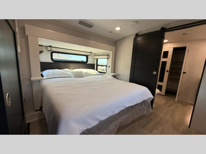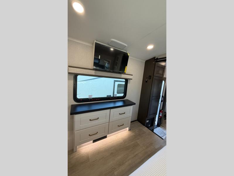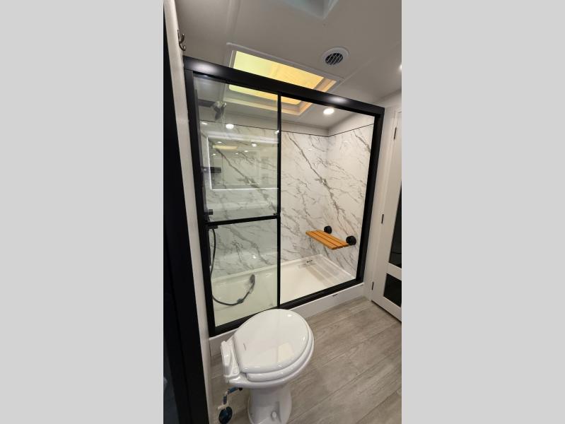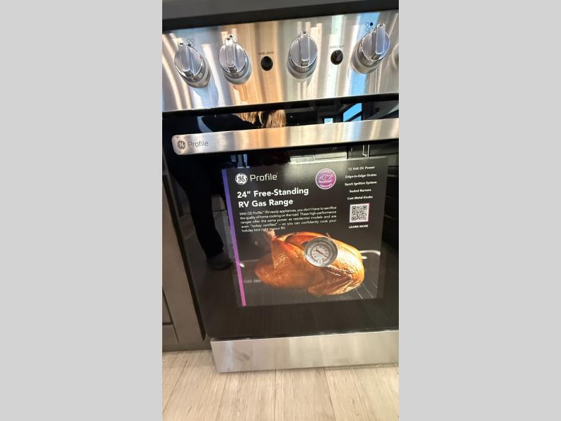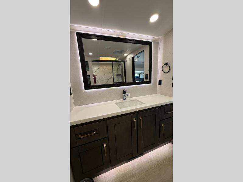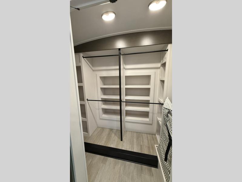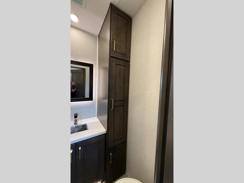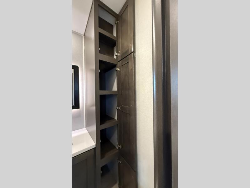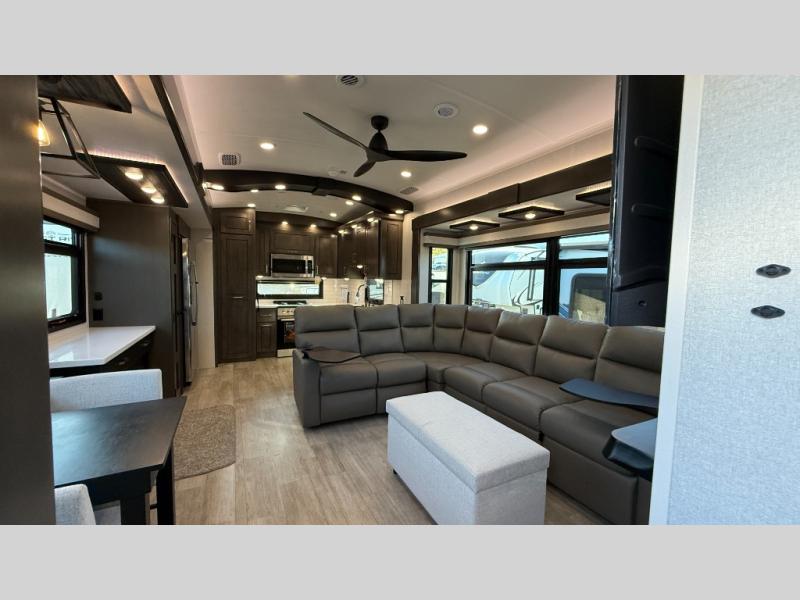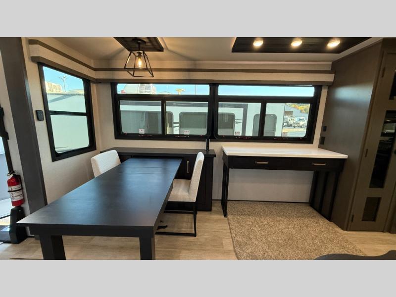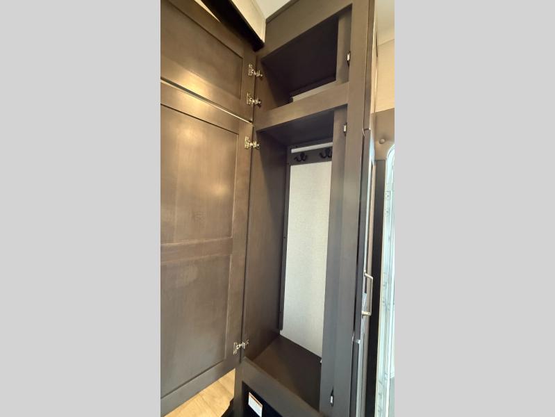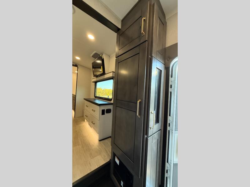 Starting from the back, this impressive 39RK features a rear kitchen designed in a convenient U-shape for easy accessibility and efficient meal prep. The kitchen is fully equipped with plenty of overhead cabinets, a convection microwave with an air fryer, a 24" range, and a pull-out pantry, perfect for the chef on the trip to cook in comfort. Across the kitchen, the large slide-out houses a 21-cu. ft. refrigerator and a second pantry with shelves, providing even more space to store groceries, snacks, and coffee essentials. The nearby desk/coffee bar and roll-out table create an inviting area to enjoy meals or unwind with a cup of coffee. The living area offers a spacious 100" L-shaped sofa and a theater seat facing the TV and fireplace, making it an ideal spot for relaxing or hosting movie nights. Moving forward, you’ll find a convenient half bathroom with linen shelves for added storage and accessibility. At the front, the private bedroom features a 72" x 80" king bed in a slide-out with a dresser across for ample storage. Finally, the full bathroom at the very front includes a 30" x 61" shower with a seat for comfort, a large sink, and a walk-in closet that provides generous space for all your clothing and gear.