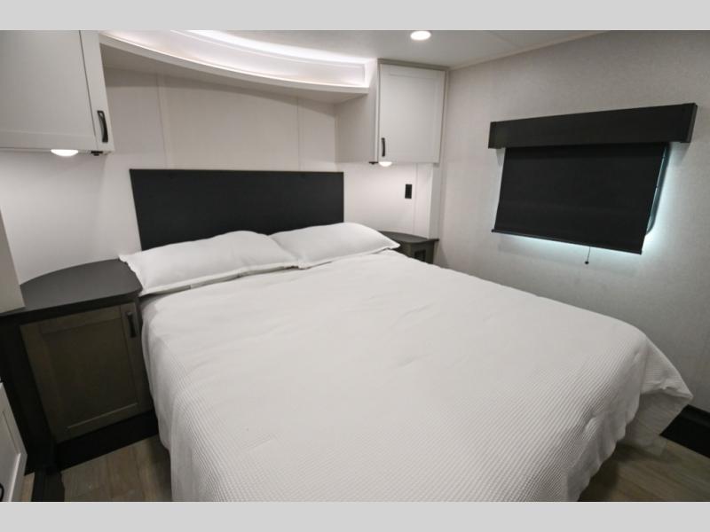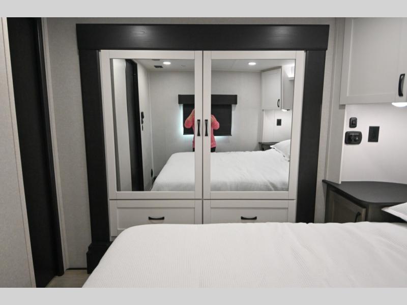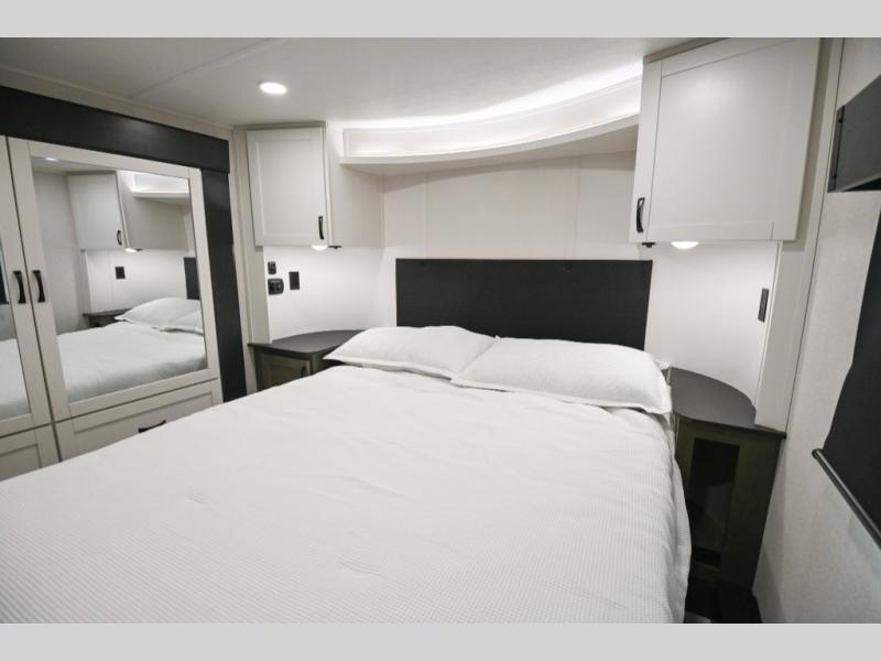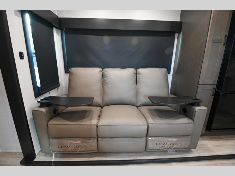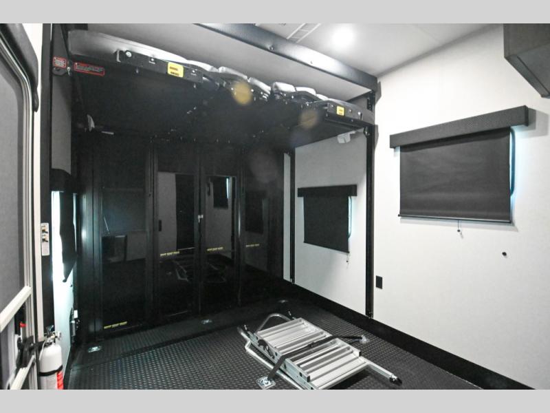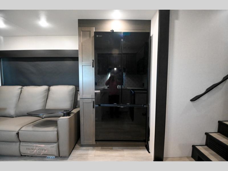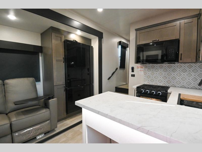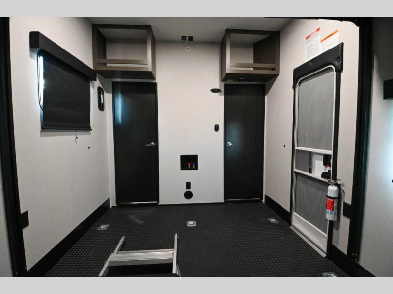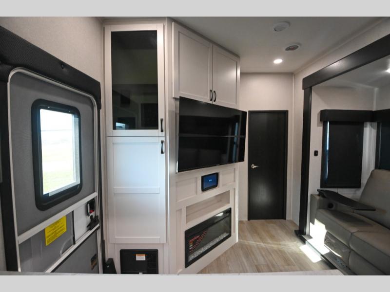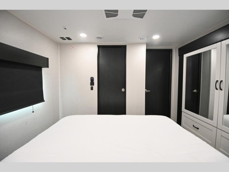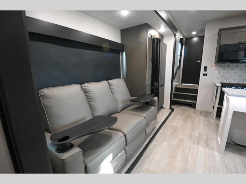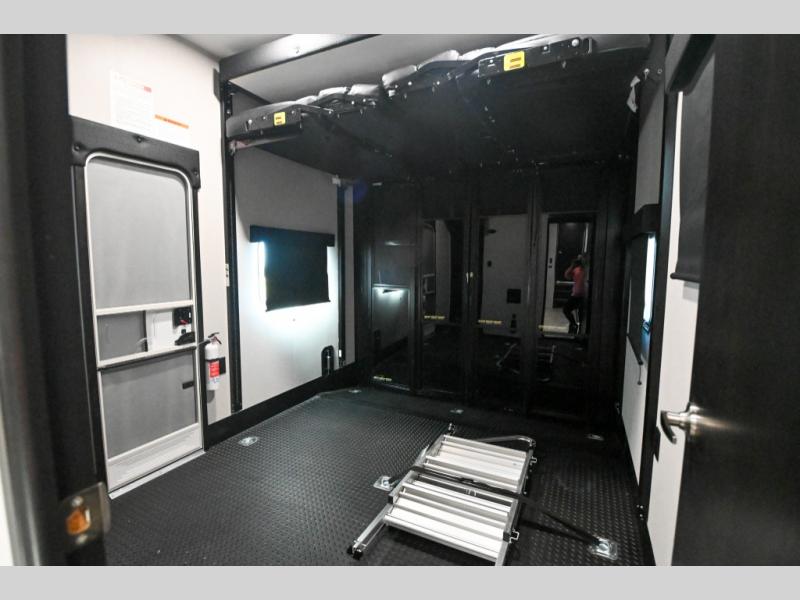 Have a good night's sleep on the road in the front bedroom, featuring an Olympic queen bed, a wardrobe, a shelf, overhead cabinets, and drawers. This is the perfect spot to recharge after a long day of adventure. The 11' garage is a game-changer, featuring a Happi Jack power bunk for easy loading and unloading of your toys. The cargo table is perfect for working on projects or storing gear. The kitchen is fully equipped with three pantries, overhead cabinets, microwave, a sink, and a refrigerator, making meal prep and cooking so easy! The sofa is the perfect spot to unwind, the entertainment center provides endless hours of fun, and the full bathroom and half bath provide convenient spaces for freshening up, making it ideal for families or groups.