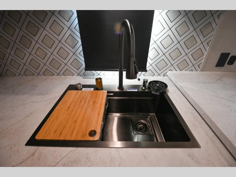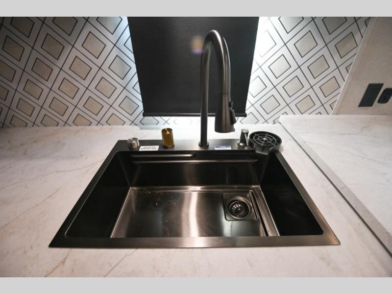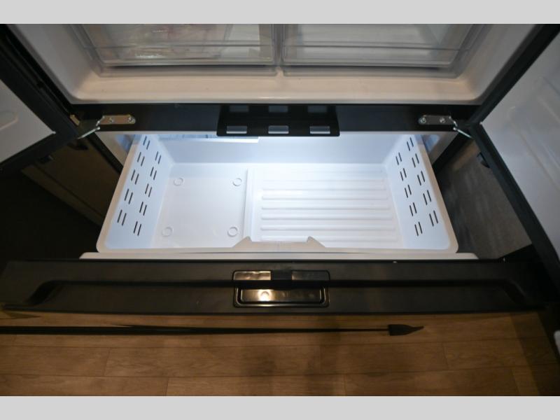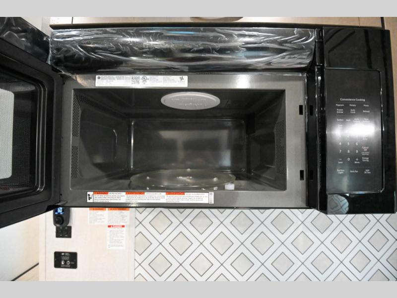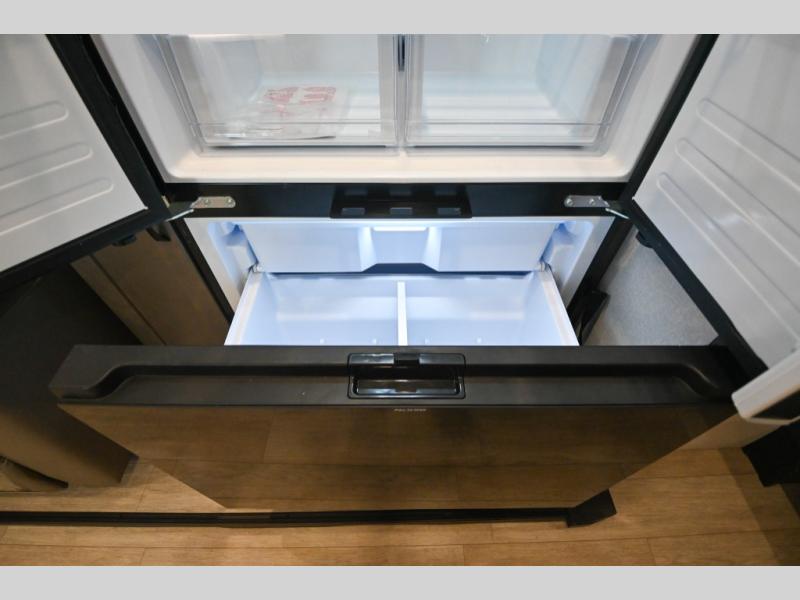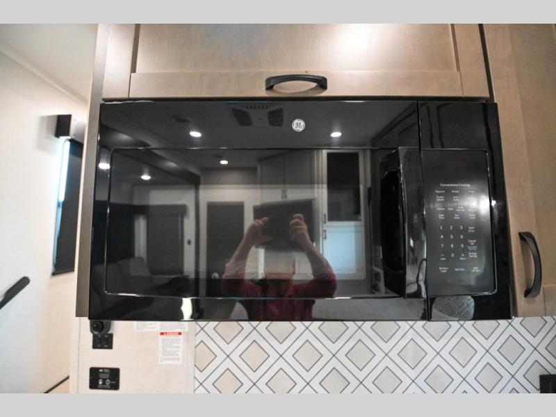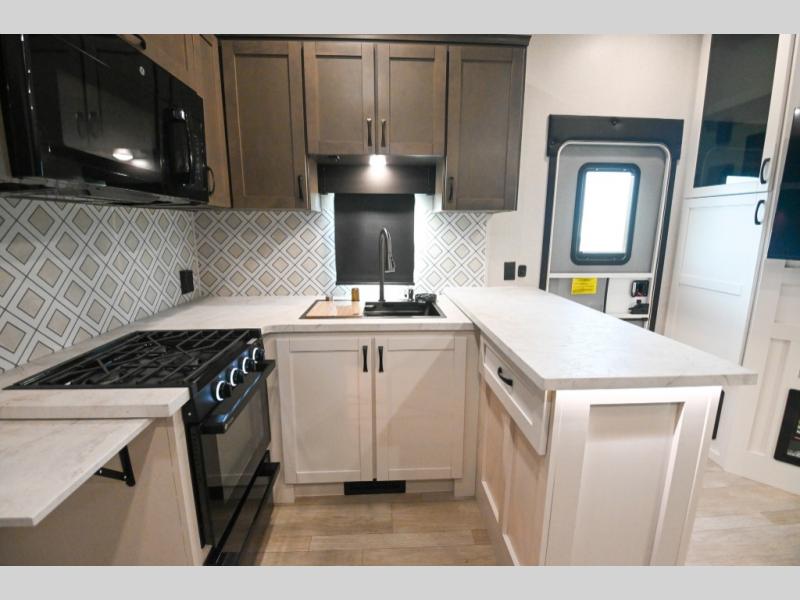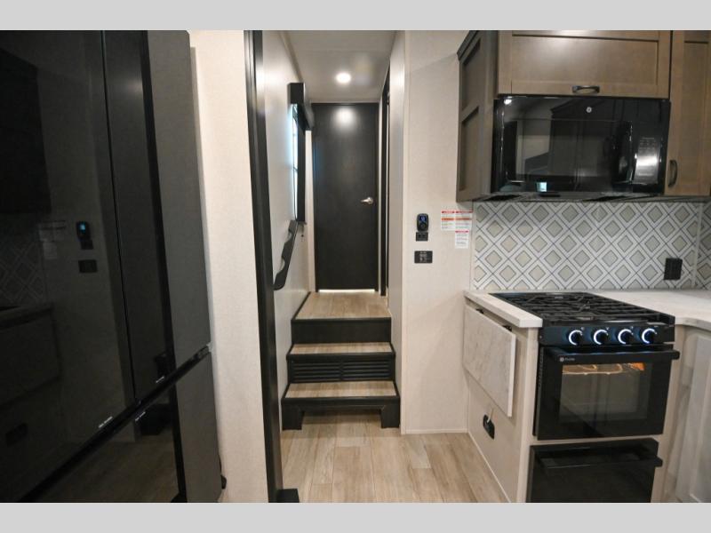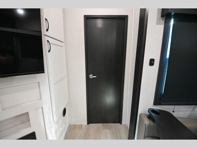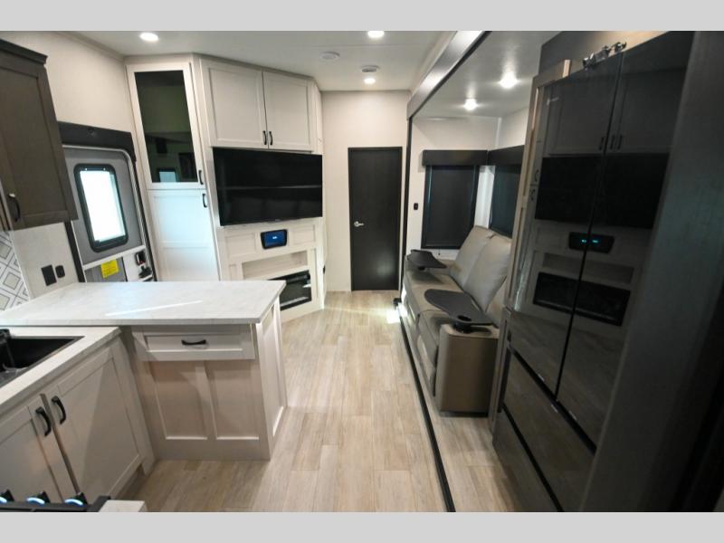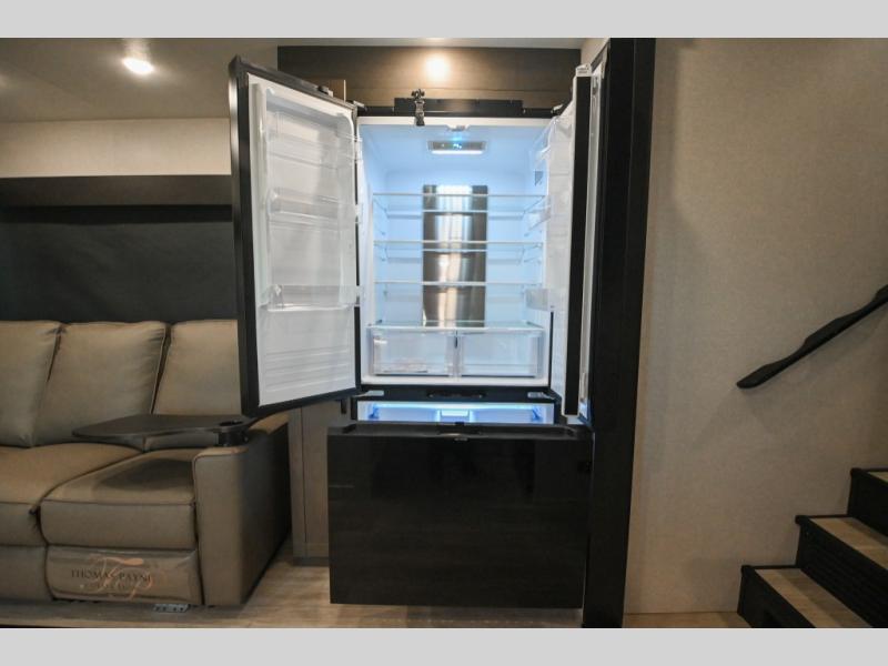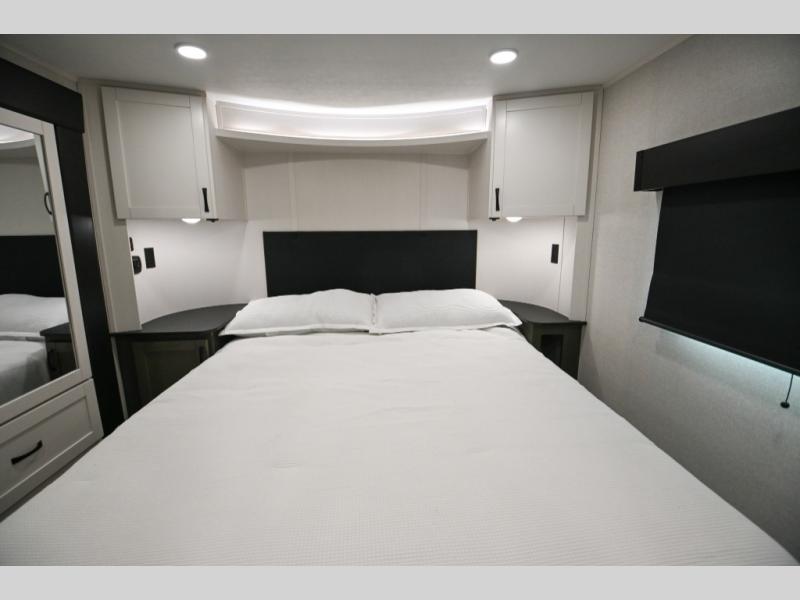 Have a good night's sleep on the road in the front bedroom, featuring an Olympic queen bed, a wardrobe, a shelf, overhead cabinets, and drawers. This is the perfect spot to recharge after a long day of adventure. The 11' garage is a game-changer, featuring a Happi Jack power bunk for easy loading and unloading of your toys. The cargo table is perfect for working on projects or storing gear. The kitchen is fully equipped with three pantries, overhead cabinets, microwave, a sink, and a refrigerator, making meal prep and cooking so easy! The sofa is the perfect spot to unwind, the entertainment center provides endless hours of fun, and the full bathroom and half bath provide convenient spaces for freshening up, making it ideal for families or groups.