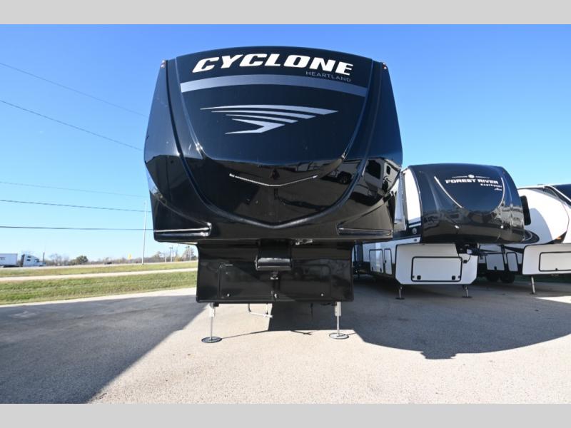 Satisfy your wanderlust with a Heartland Cyclone fifth wheel toy hauler! You won't have to sacrifice any luxury either, with indulgent features like the ducted, fully enclosed, and heated underbelly that provides added protection and warmth. Inside, the LED interior lighting throughout ensures that every corner of your RV is bright and inviting, and the bathroom skylight brings in natural light and fresh air, creating a welcoming and refreshing space. Plus, the central command center with built-in tank monitoring keeps you informed and in control, making it easy to manage your resources. Also, the Premium Exterior Package includes diverse features such as Dexter axles with ABS and tow assist with sway mitigation, and the Keyed-Alike lock system ensures that all your locks are keyed the same, providing added security and convenience. Come find the perfect model for you today!