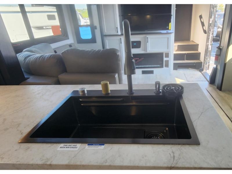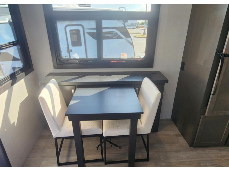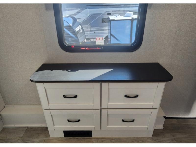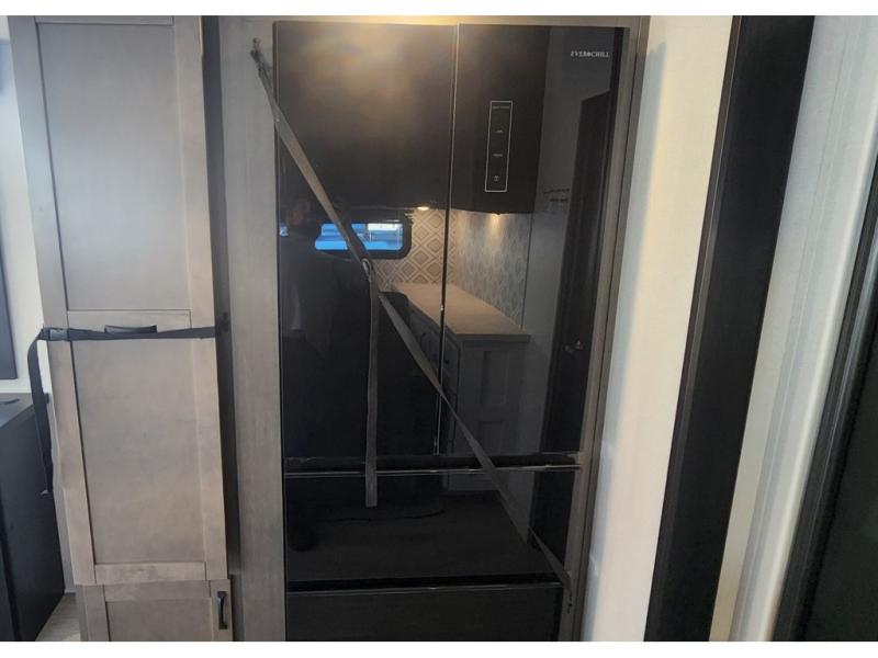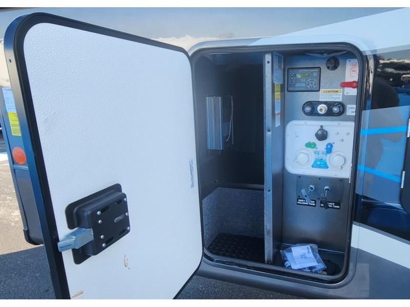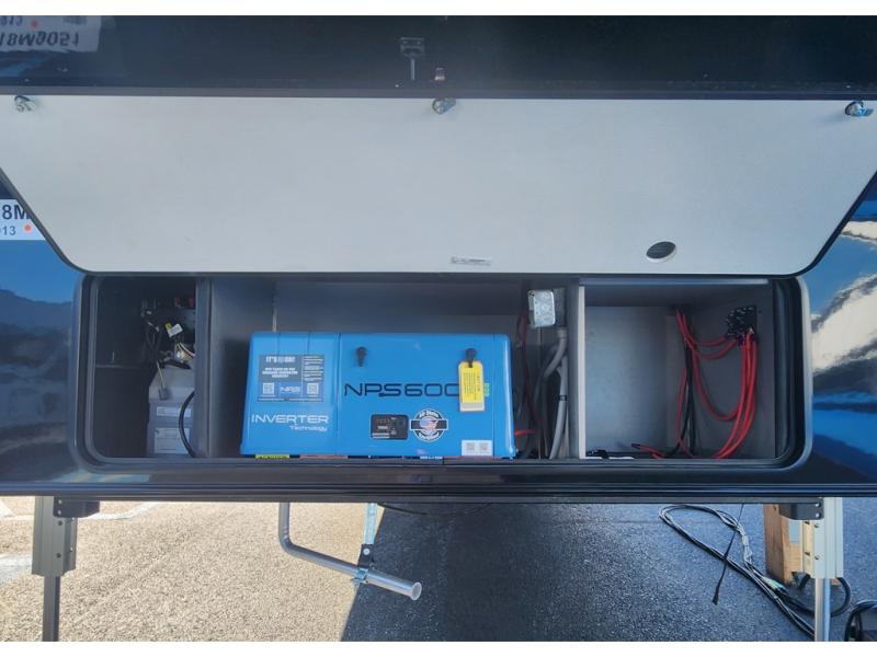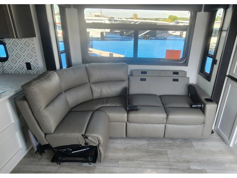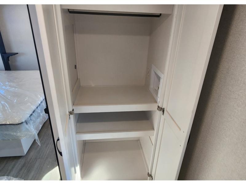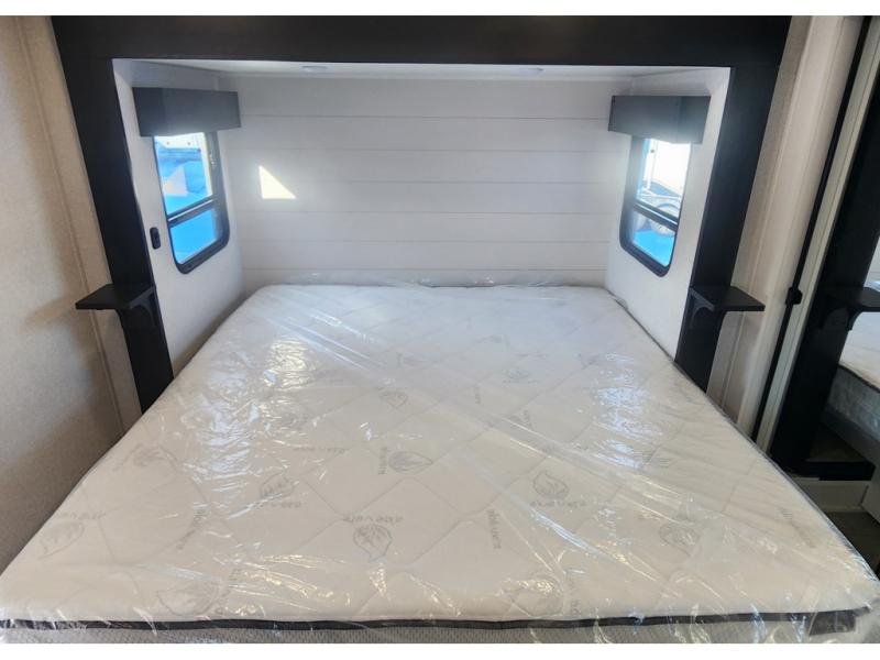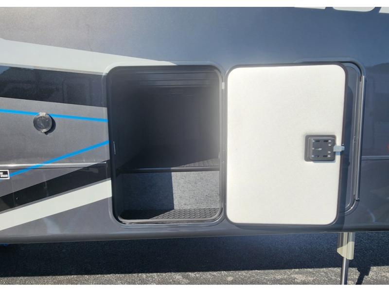 The 13' 6" garage is the perfect space for your toys, with enough room for your ATV, motorcycle, or other gear. Plus, the electric queen bed provides a comfortable spot to rest after a long day. The overhead loft with storage provides additional space for your gear, keeping it out of the way but still accessible. The kitchen is fully equipped with a microwave, sink, overhead cabinets, pantry, and coffee bar. The L-shaped sofa provides ample seating for relaxation, and the TV is perfectly positioned for viewing. The full bathroom is a welcome convenience, providing a private space to freshen up. Also, the front bedroom is a luxurious retreat, featuring a king bed, a walk-in closet, and drawers, and on the exterior, the two entry/exit doors provide easy access to the outside, making it perfect for loading and unloading your gear.
