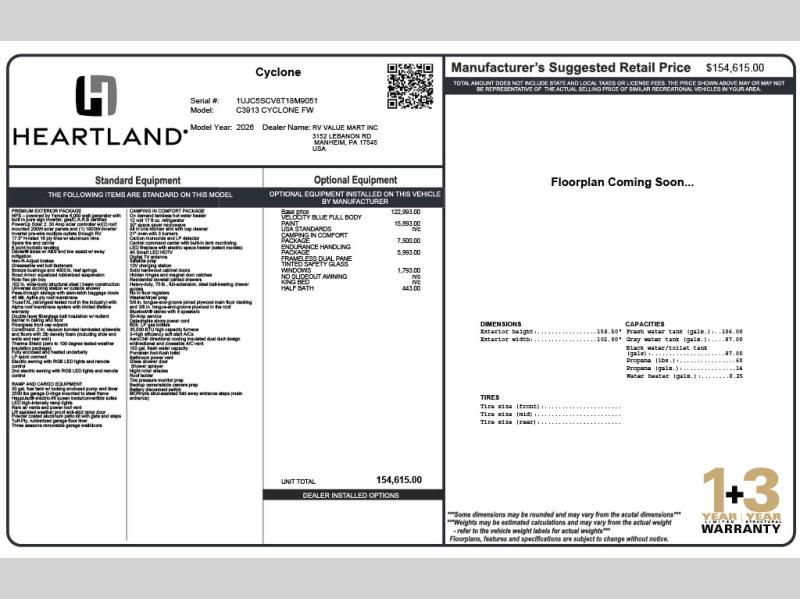 Satisfy your wanderlust with a Heartland Cyclone fifth wheel toy hauler! You won't have to sacrifice any luxury either, with indulgent features like the ducted, fully enclosed, and heated underbelly provides added protection and warmth. Inside, the LED interior lighting throughout ensures that every corner of your RV is bright and inviting, and the bathroom skylight brings in natural light and fresh air, creating a welcoming and refreshing space. Plus, the central command center with built-in tank monitoring keeps you informed and in control, making it easy to manage your resources. Also, the Premium Exterior Package includes diverse features such as Dexter axles with ABS and tow assist with sway mitigation, and the Keyed-Alike lock system ensures that all your locks are keyed the same, providing added security and convenience. Come find the perfect model for you today!