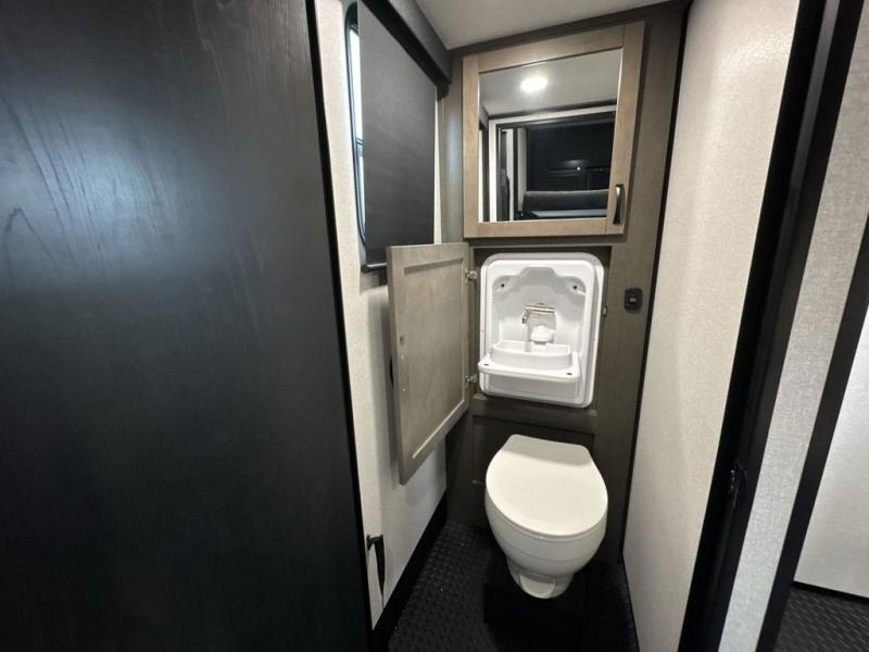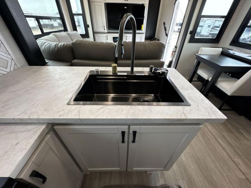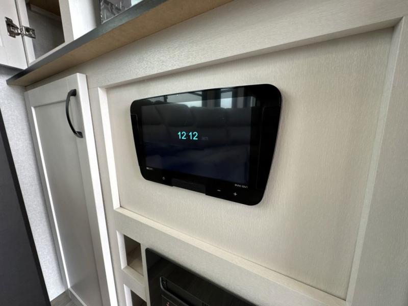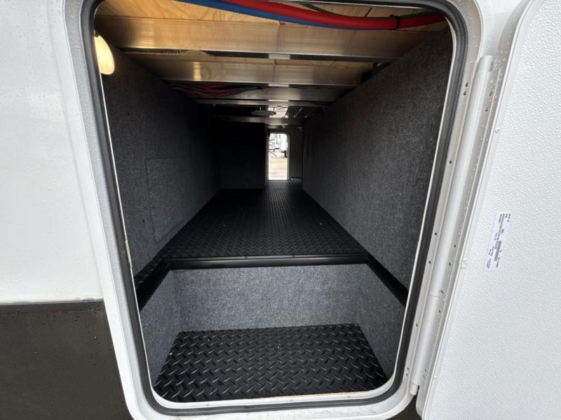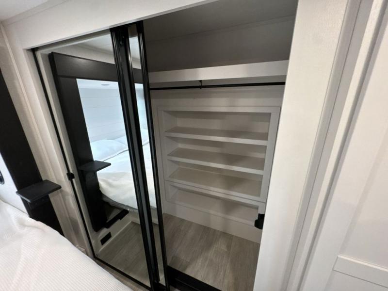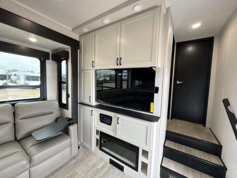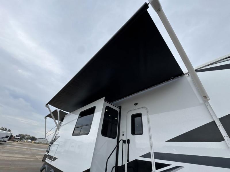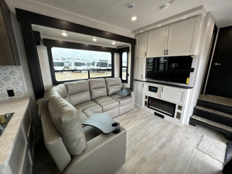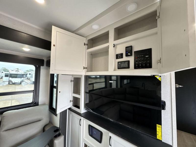 The 13' 6" garage is the perfect space for your toys, with enough room for your ATV, motorcycle, or other gear. Plus, the electric queen bed provides a comfortable spot to rest after a long day. The overhead loft with storage provides additional space for your gear, keeping it out of the way but still accessible. The kitchen is fully equipped with a microwave, sink, overhead cabinets, pantry, and coffee bar. The L-shaped sofa provides ample seating for relaxation, and the TV is perfectly positioned for viewing. The full bathroom is a welcome convenience, providing a private space to freshen up. Also, the front bedroom is a luxurious retreat, featuring a king bed, a walk-in closet, and drawers, and on the exterior, the two entry/exit doors provide easy access to the outside, making it perfect for loading and unloading your gear.