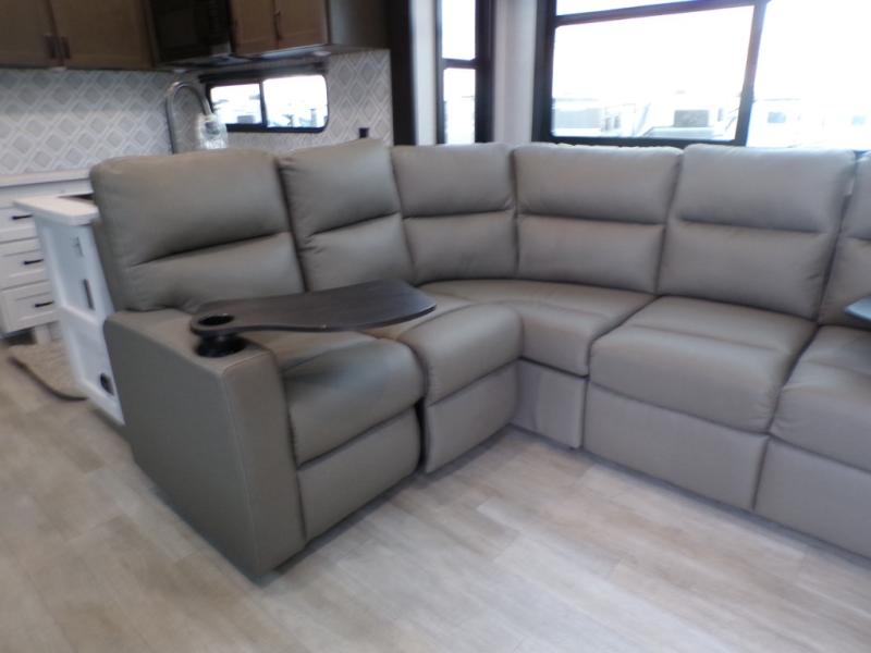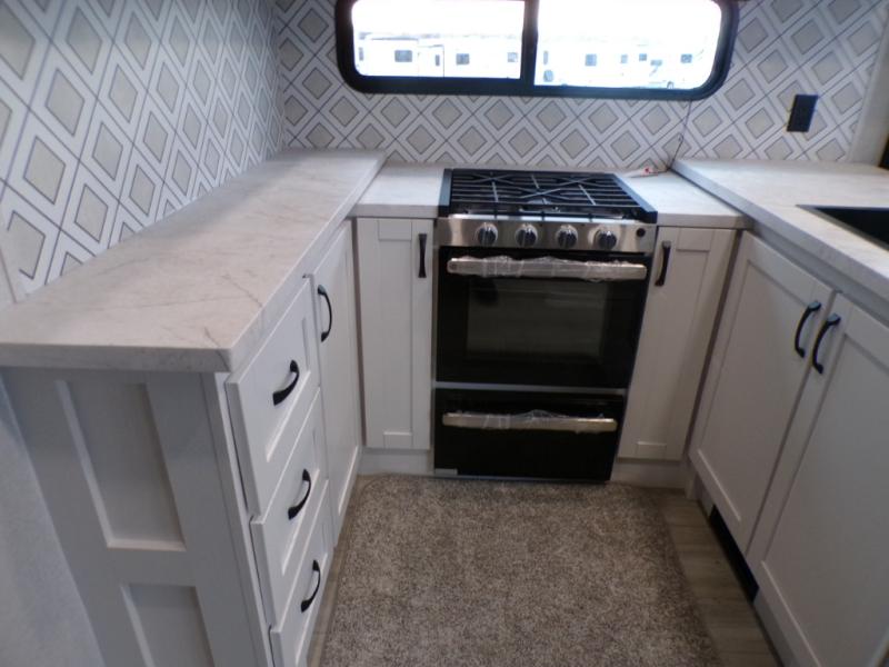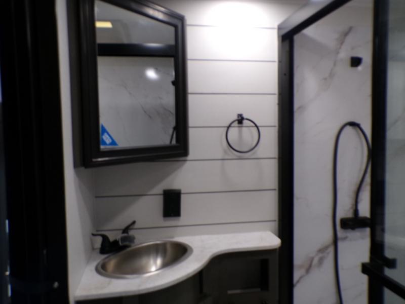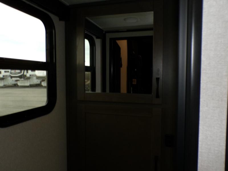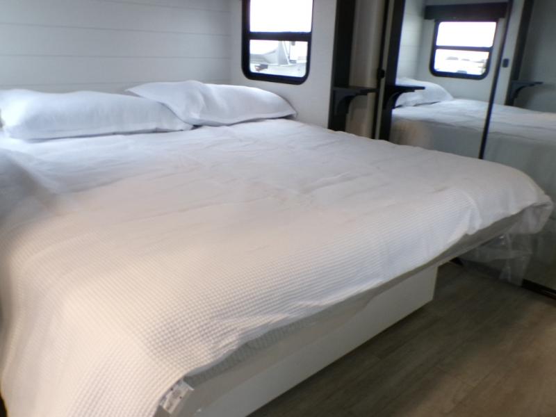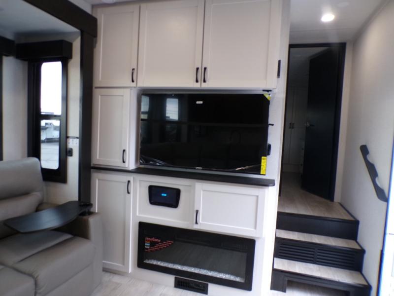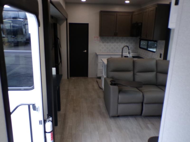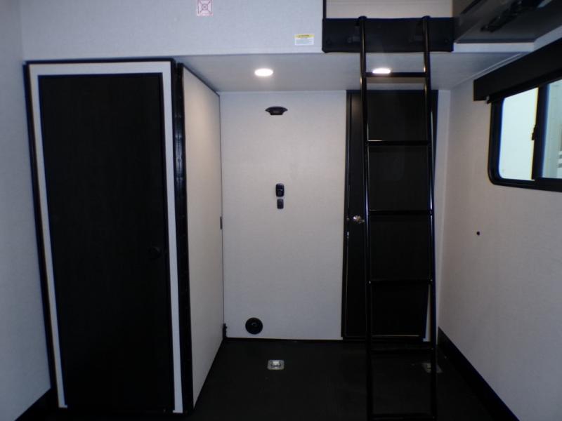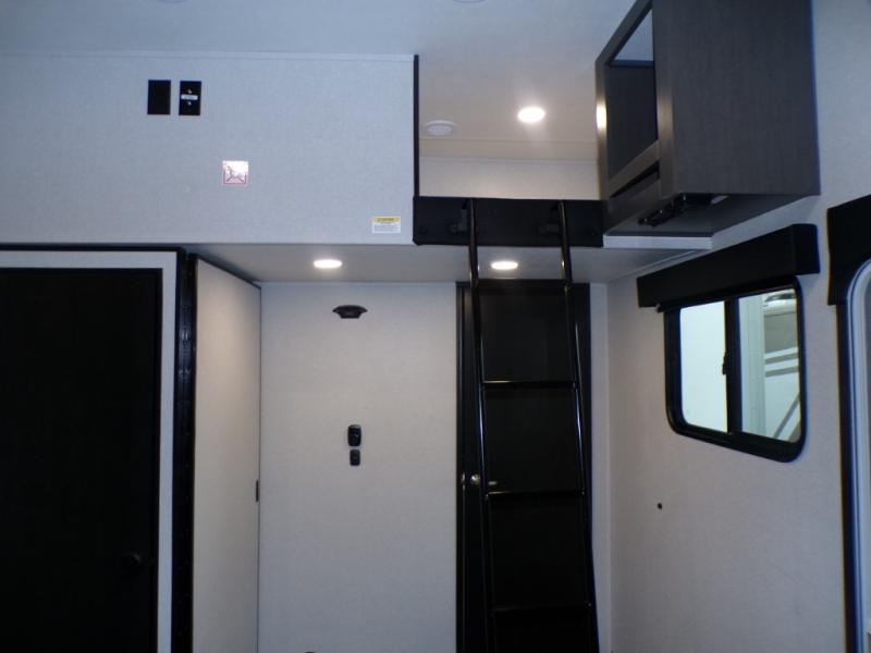 The 13' 6" garage is the perfect space for your toys, with enough room for your ATV, motorcycle, or other gear. Plus, the electric queen bed provides a comfortable spot to rest after a long day. The overhead loft with storage provides additional space for your gear, keeping it out of the way but still accessible. The kitchen is fully equipped with a microwave, sink, overhead cabinets, pantry, and coffee bar. The L-shaped sofa provides ample seating for relaxation, and the TV is perfectly positioned for viewing. The full bathroom is a welcome convenience, providing a private space to freshen up. Also, the front bedroom is a luxurious retreat, featuring a king bed, a walk-in closet, and drawers, and on the exterior, the two entry/exit doors provide easy access to the outside, making it perfect for loading and unloading your gear.