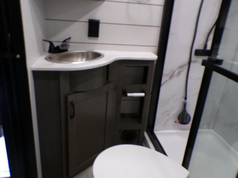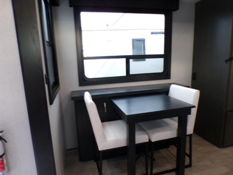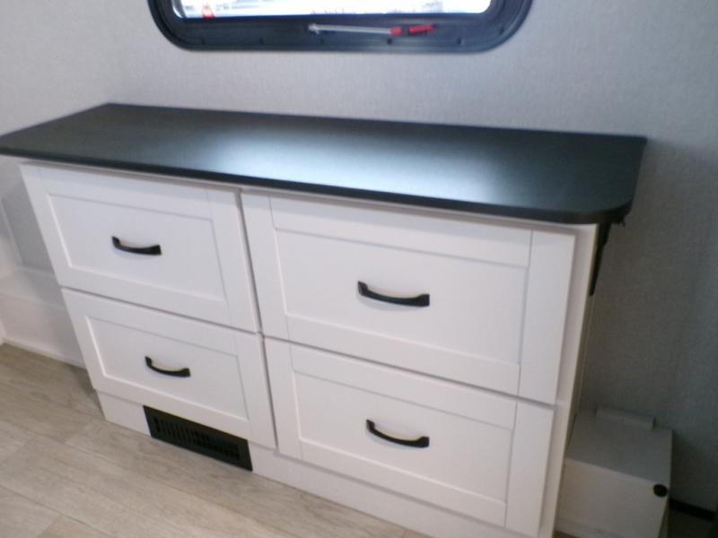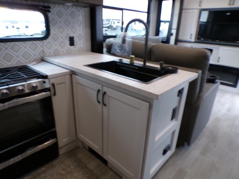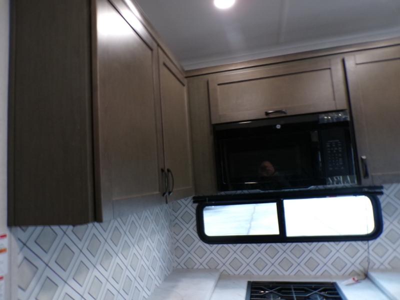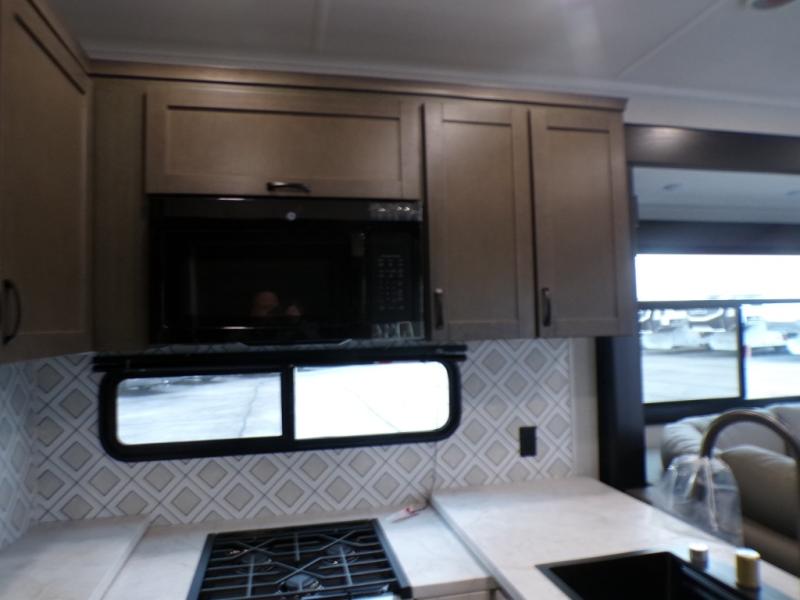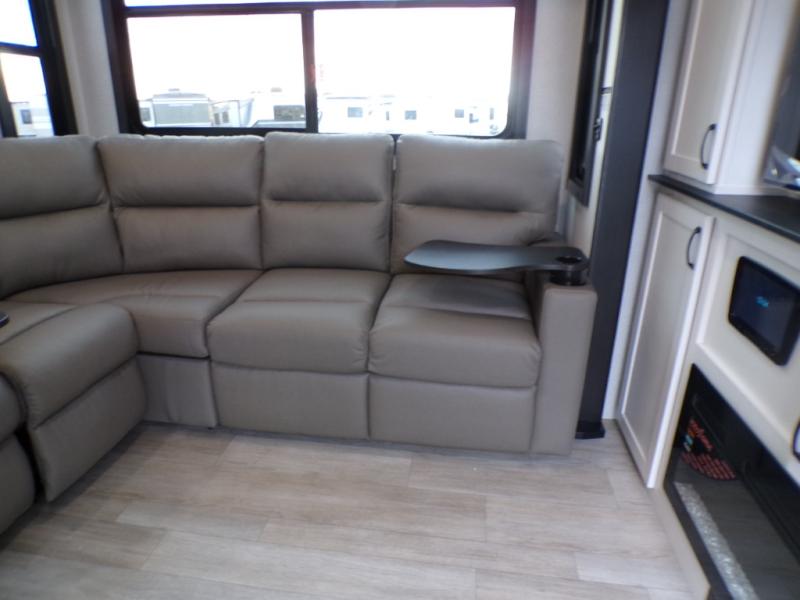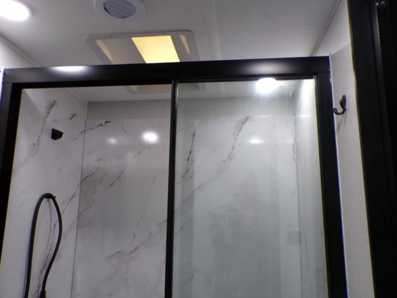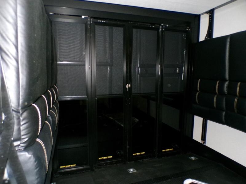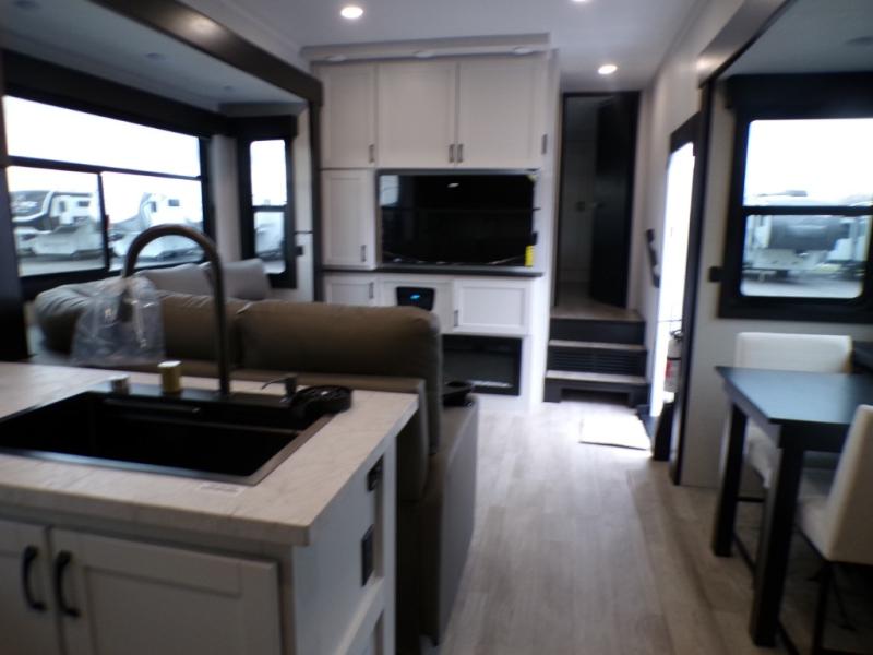 The 13' 6" garage is the perfect space for your toys, with enough room for your ATV, motorcycle, or other gear. Plus, the electric queen bed provides a comfortable spot to rest after a long day. The overhead loft with storage provides additional space for your gear, keeping it out of the way but still accessible. The kitchen is fully equipped with a microwave, sink, overhead cabinets, pantry, and coffee bar. The L-shaped sofa provides ample seating for relaxation, and the TV is perfectly positioned for viewing. The full bathroom is a welcome convenience, providing a private space to freshen up. Also, the front bedroom is a luxurious retreat, featuring a king bed, a walk-in closet, and drawers, and on the exterior, the two entry/exit doors provide easy access to the outside, making it perfect for loading and unloading your gear.