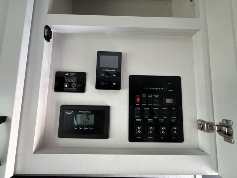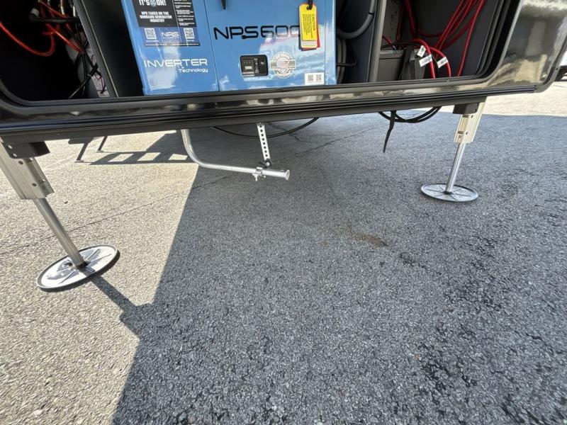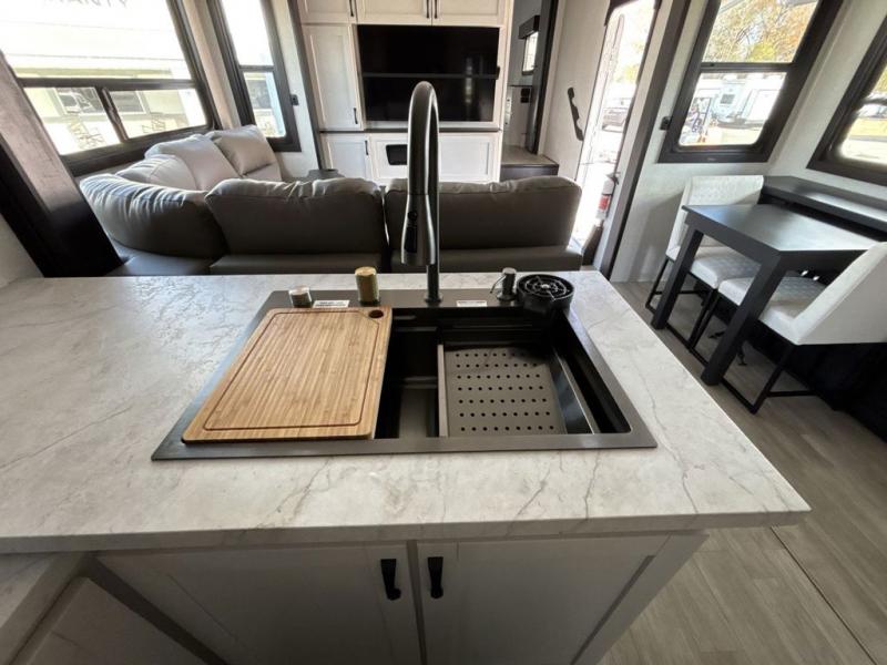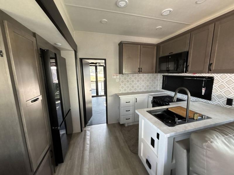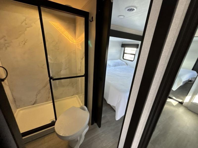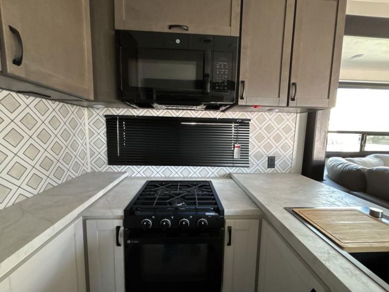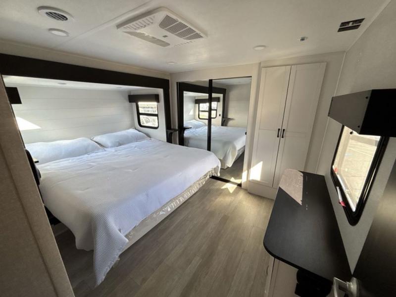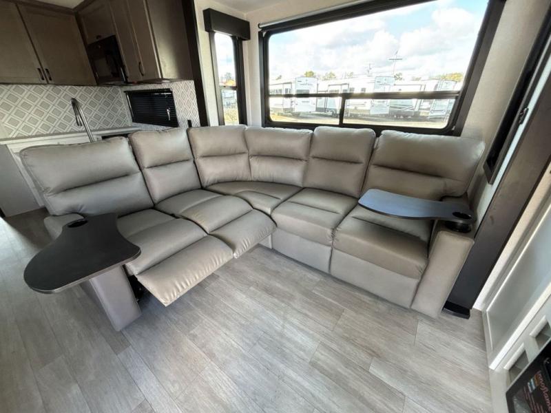 The 13' 6" garage is the perfect space for your toys, with enough room for your ATV, motorcycle, or other gear. Plus, the electric queen bed provides a comfortable spot to rest after a long day. The overhead loft with storage provides additional space for your gear, keeping it out of the way but still accessible. The kitchen is fully equipped with a microwave, sink, overhead cabinets, pantry, and coffee bar. The L-shaped sofa provides ample seating for relaxation, and the TV is perfectly positioned for viewing. The full bathroom is a welcome convenience, providing a private space to freshen up. Also, the front bedroom is a luxurious retreat, featuring a king bed, a walk-in closet, and drawers, and on the exterior, the two entry/exit doors provide easy access to the outside, making it perfect for loading and unloading your gear.