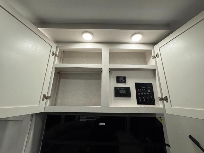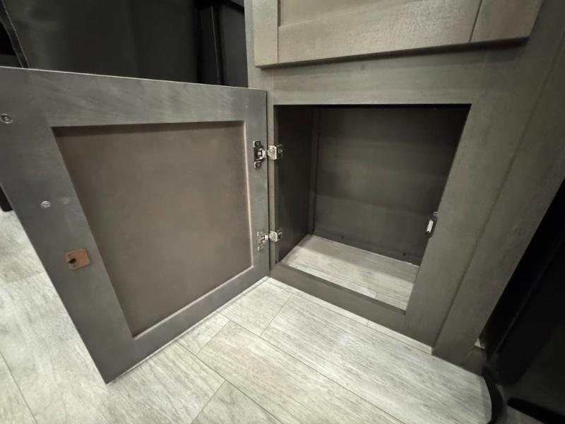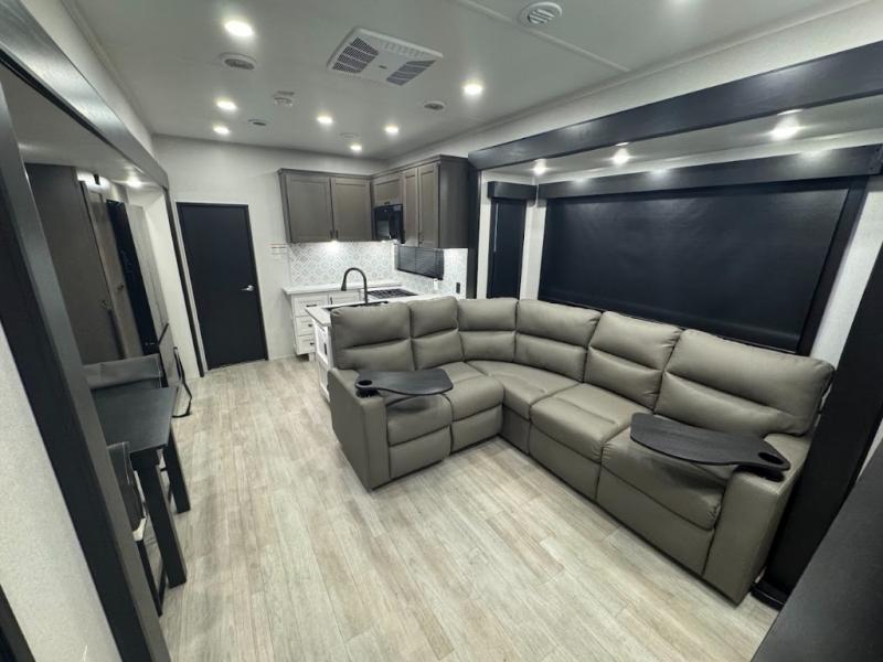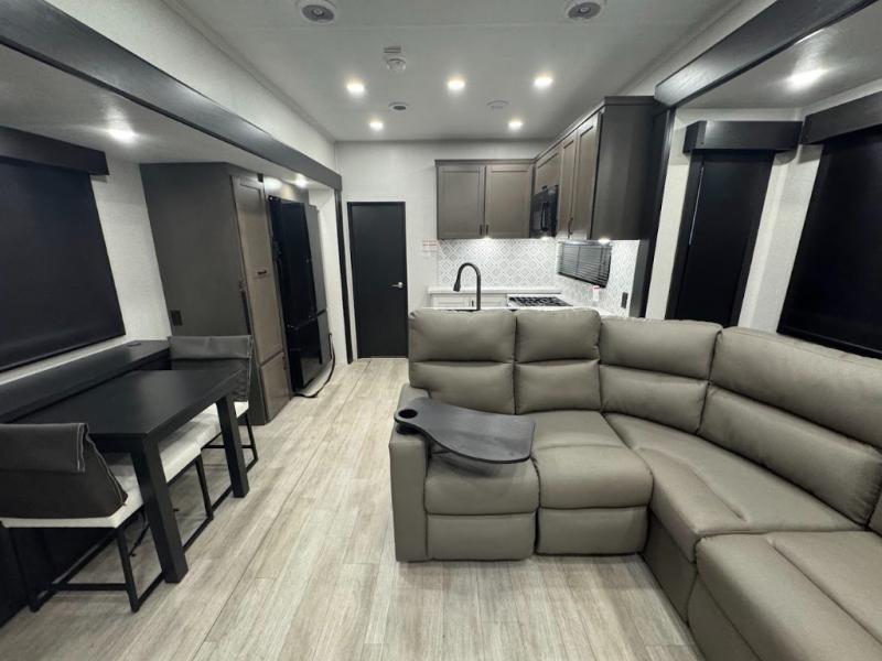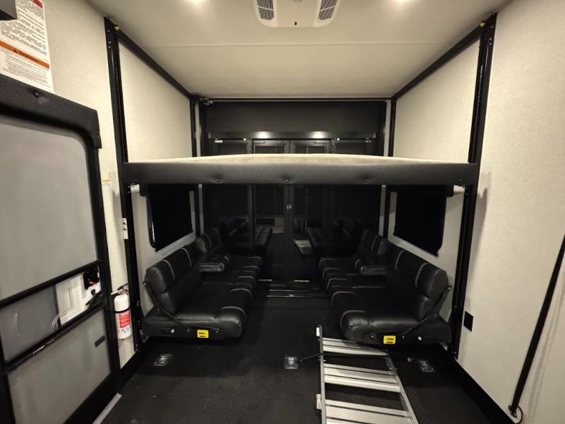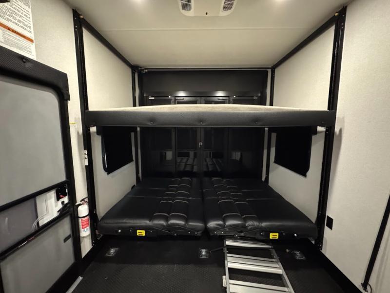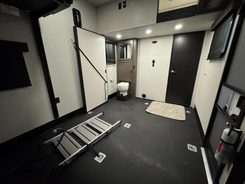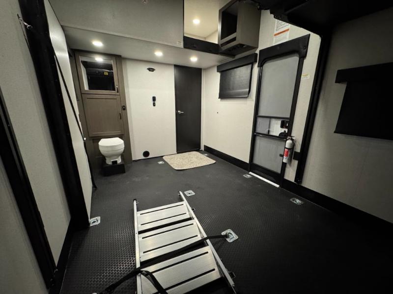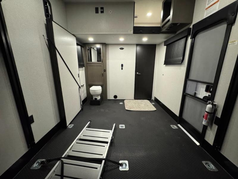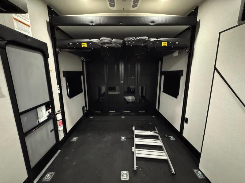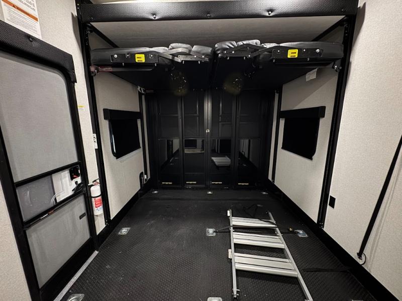 The 13' 6" garage is the perfect space for your toys, with enough room for your ATV, motorcycle, or other gear. Plus, the electric queen bed provides a comfortable spot to rest after a long day. The overhead loft with storage provides additional space for your gear, keeping it out of the way but still accessible. The kitchen is fully equipped with a microwave, sink, overhead cabinets, pantry, and coffee bar. The L-shaped sofa provides ample seating for relaxation, and the TV is perfectly positioned for viewing. The full bathroom is a welcome convenience, providing a private space to freshen up. Also, the front bedroom is a luxurious retreat, featuring a king bed, a walk-in closet, and drawers, and on the exterior, the two entry/exit doors provide easy access to the outside, making it perfect for loading and unloading your gear.