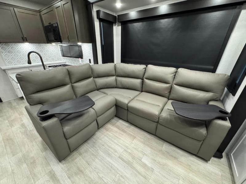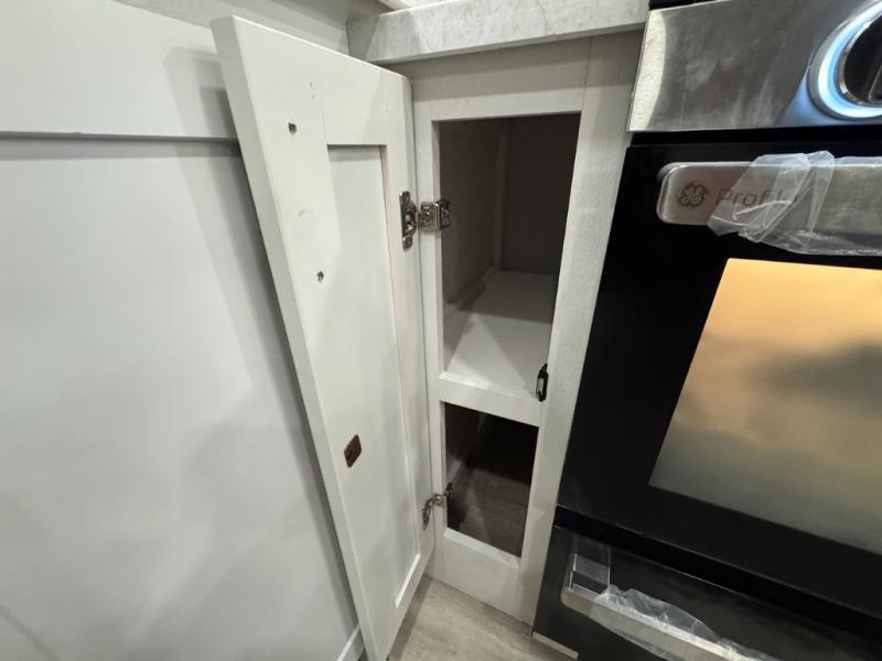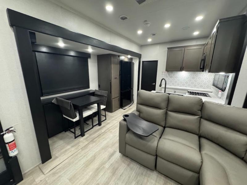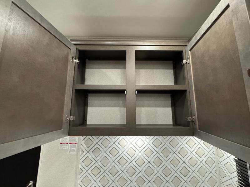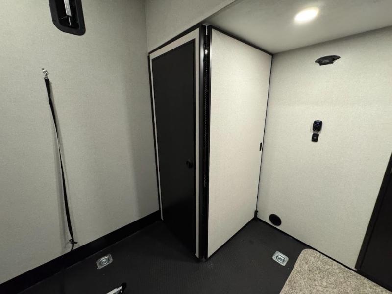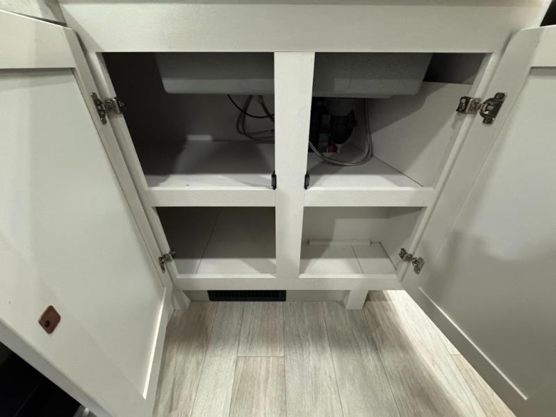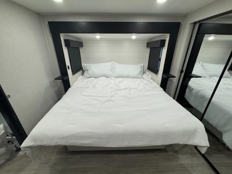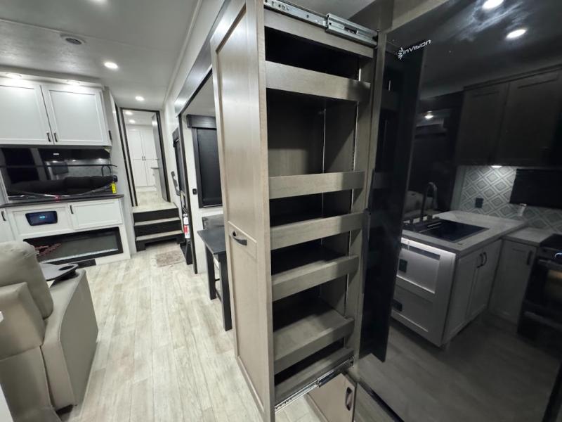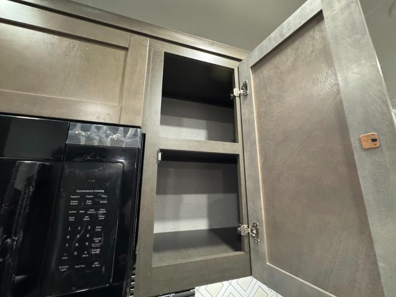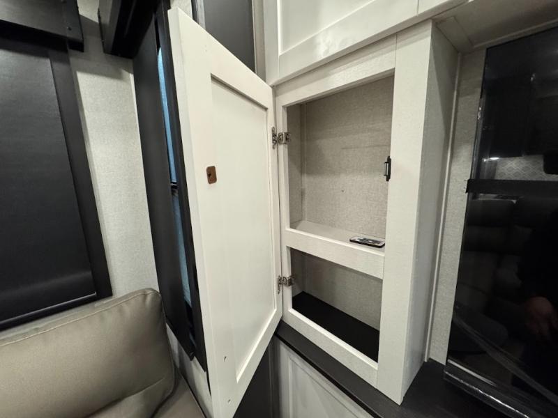 The 13' 6" garage is the perfect space for your toys, with enough room for your ATV, motorcycle, or other gear. Plus, the electric queen bed provides a comfortable spot to rest after a long day. The overhead loft with storage provides additional space for your gear, keeping it out of the way but still accessible. The kitchen is fully equipped with a microwave, sink, overhead cabinets, pantry, and coffee bar. The L-shaped sofa provides ample seating for relaxation, and the TV is perfectly positioned for viewing. The full bathroom is a welcome convenience, providing a private space to freshen up. Also, the front bedroom is a luxurious retreat, featuring a king bed, a walk-in closet, and drawers, and on the exterior, the two entry/exit doors provide easy access to the outside, making it perfect for loading and unloading your gear.