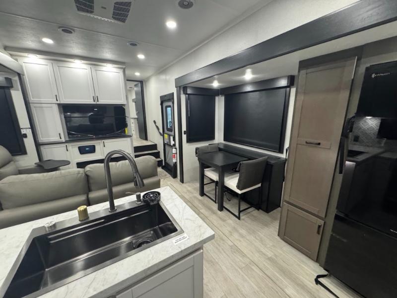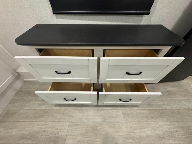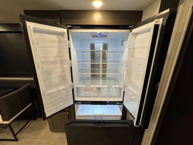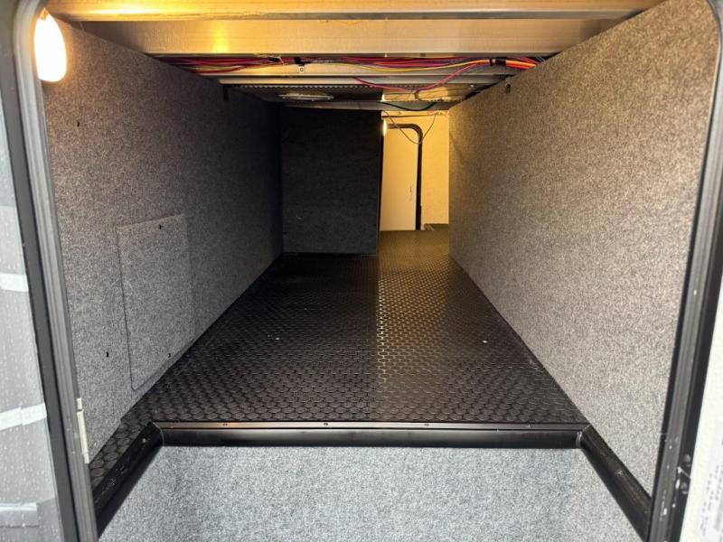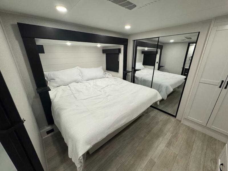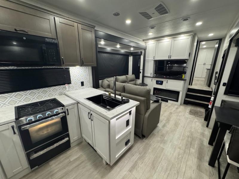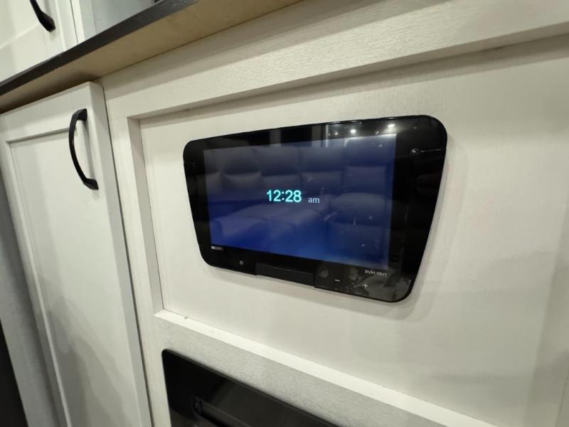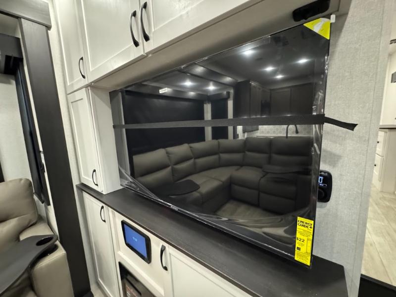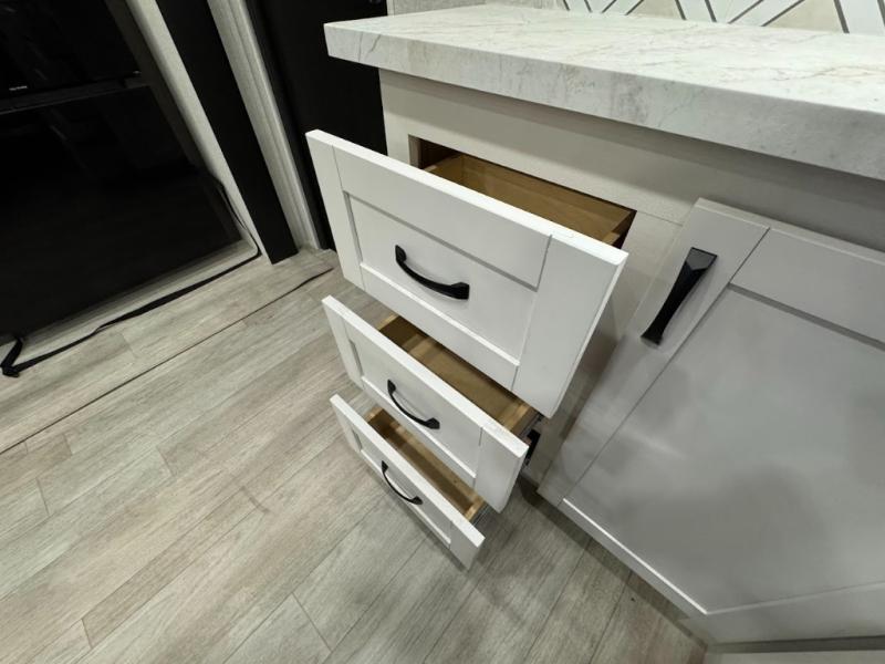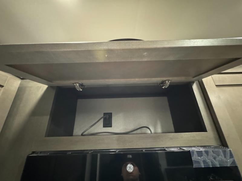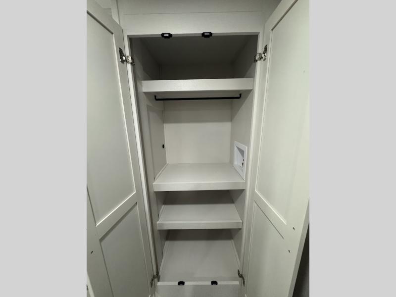 The 13' 6" garage is the perfect space for your toys, with enough room for your ATV, motorcycle, or other gear. Plus, the electric queen bed provides a comfortable spot to rest after a long day. The overhead loft with storage provides additional space for your gear, keeping it out of the way but still accessible. The kitchen is fully equipped with a microwave, sink, overhead cabinets, pantry, and coffee bar. The L-shaped sofa provides ample seating for relaxation, and the TV is perfectly positioned for viewing. The full bathroom is a welcome convenience, providing a private space to freshen up. Also, the front bedroom is a luxurious retreat, featuring a king bed, a walk-in closet, and drawers, and on the exterior, the two entry/exit doors provide easy access to the outside, making it perfect for loading and unloading your gear.